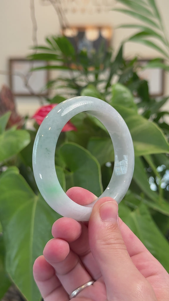* DETAILS--- This exquisite bangle is crafted from premium Burmese jadeite, showcasing a beautiful blend of green tones. Its smooth texture and timeless design exude elegance.It looks so unique. just hints has a little of clouds and natural lines. The Classic half-round comfort style bracelet. Jadeite jade is the toughest gemstone on the planet. People believe that real jade is a lucky gemstone. It's a luxury gift for you and your love.