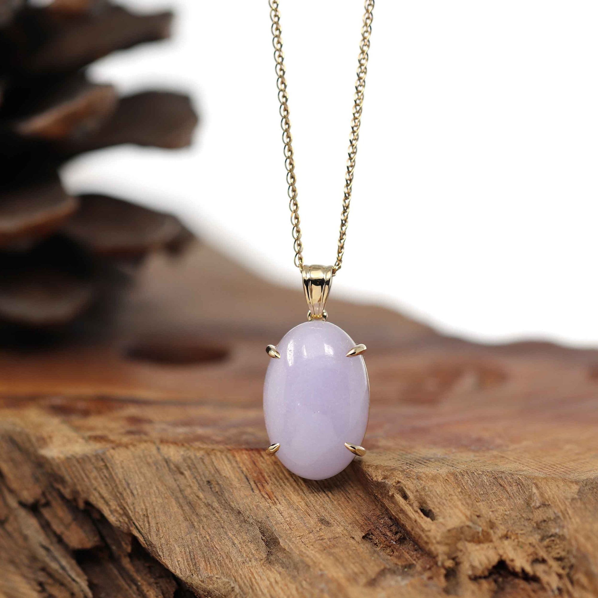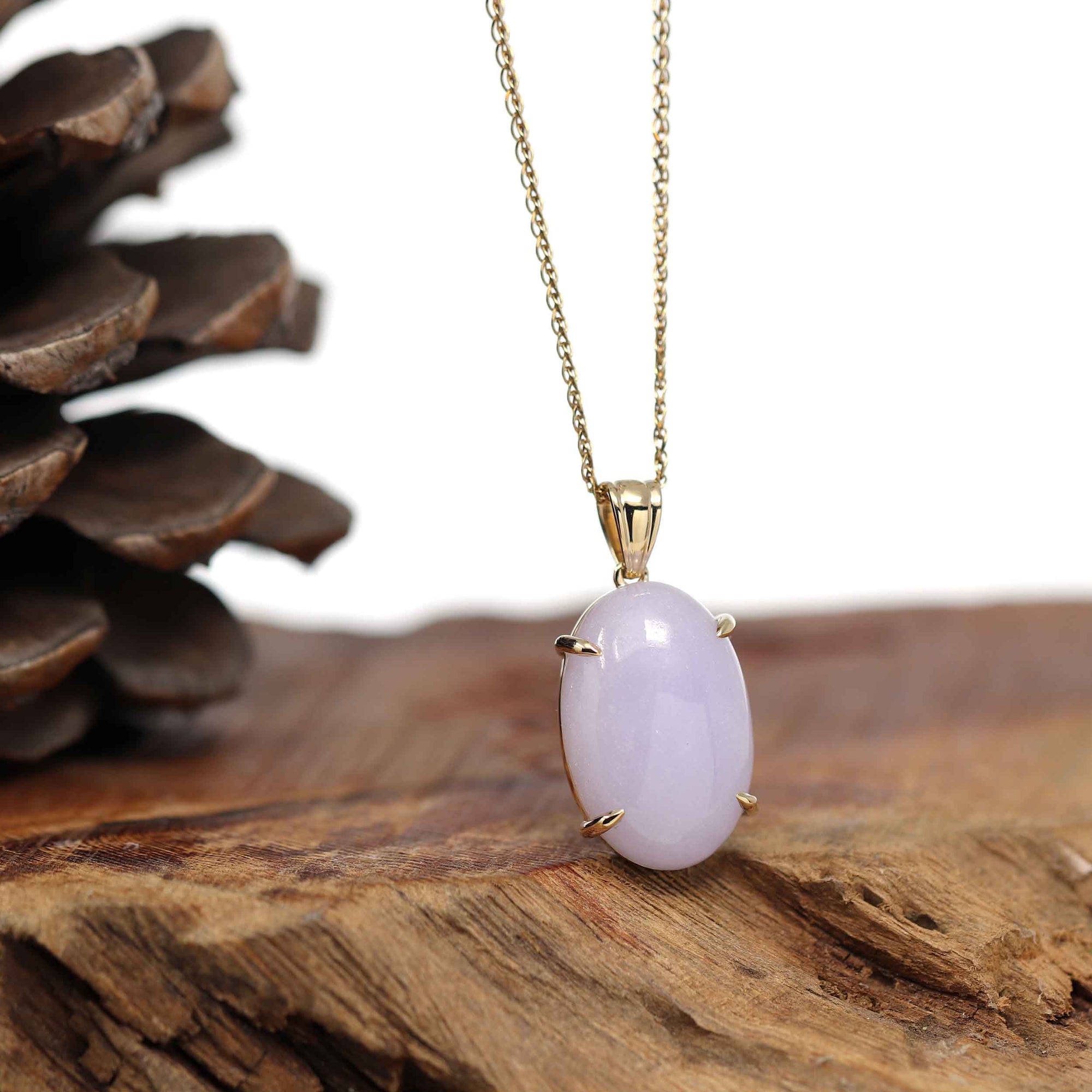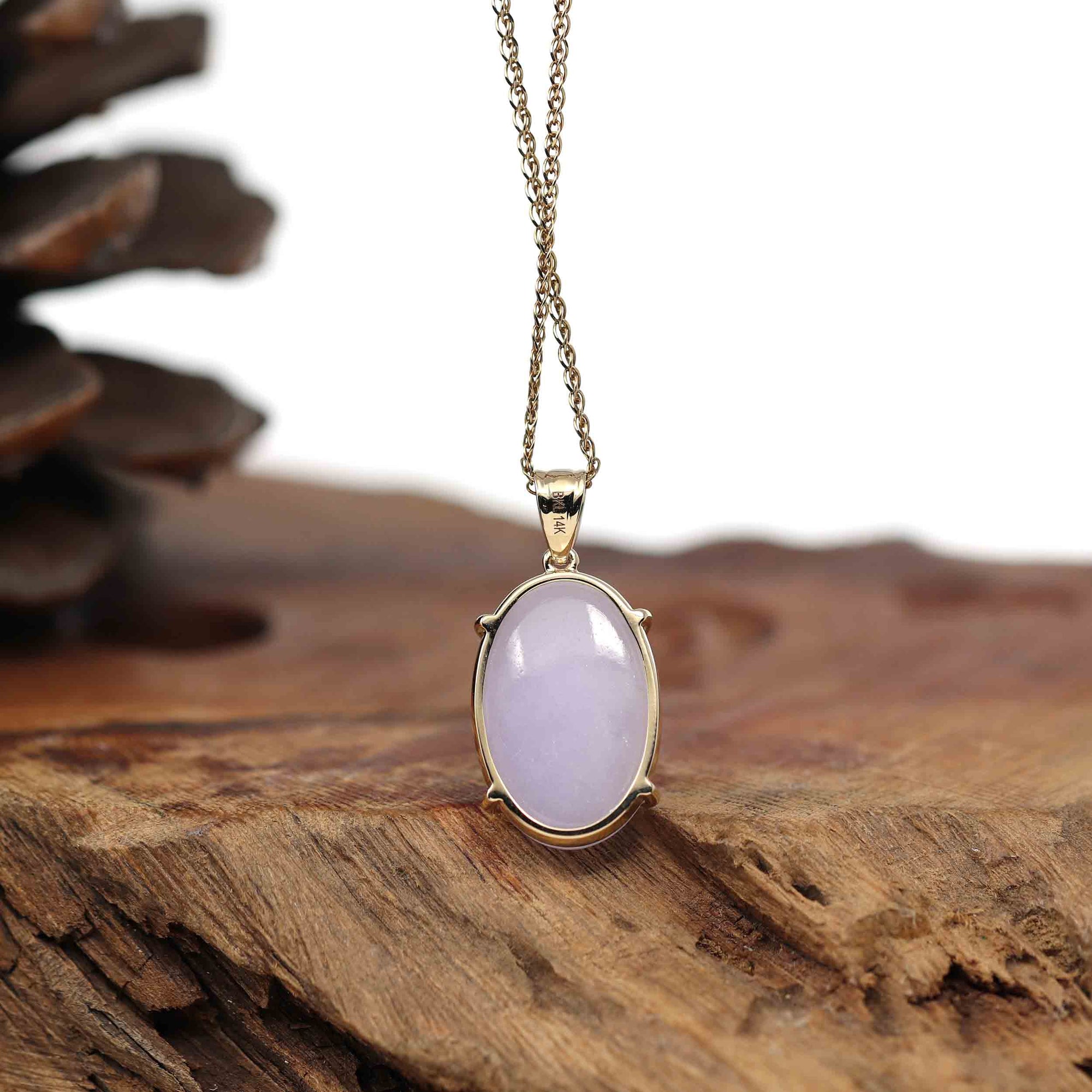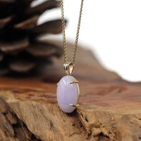 * DESIGN CONCEPT--- Introducing our exquisite 14K Gold Natural Lavender Burmese Jadeite Cabochon Necklace, a true embodiment of elegance and sophistication. Surrounded in a classic four prong 14k gold setting, the jades beautiful vibrant lavender hue is displayed stunningly. Purple Jadeite represents good luck, wealth, and safety for whoever wears it. Whether you're looking for a meaningful gift or a timeless piece for yourself, our 14K Gold Natural Lavender Burmese Jadeite Cabochon Necklace is a testament to the enduring allure of fine jewelry.