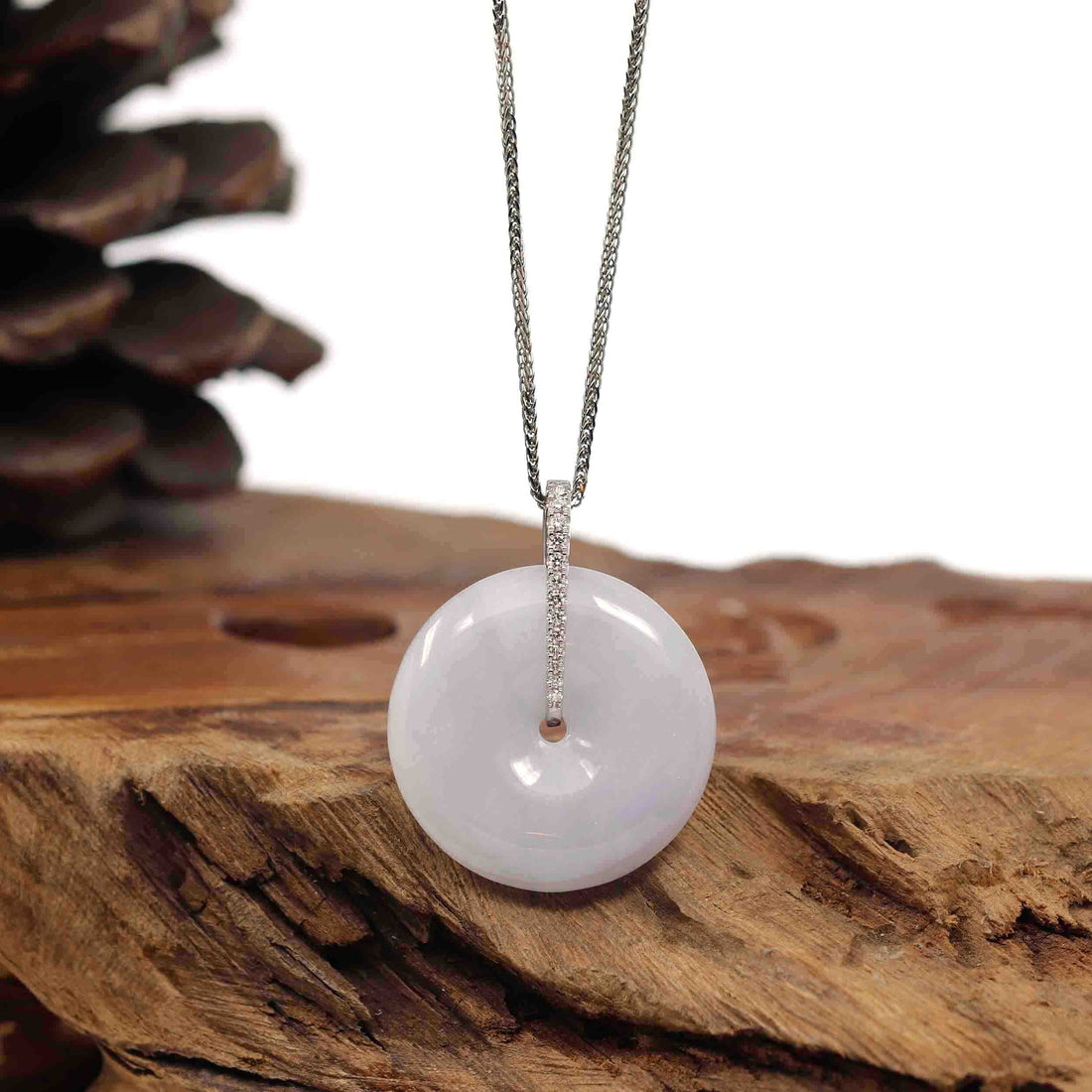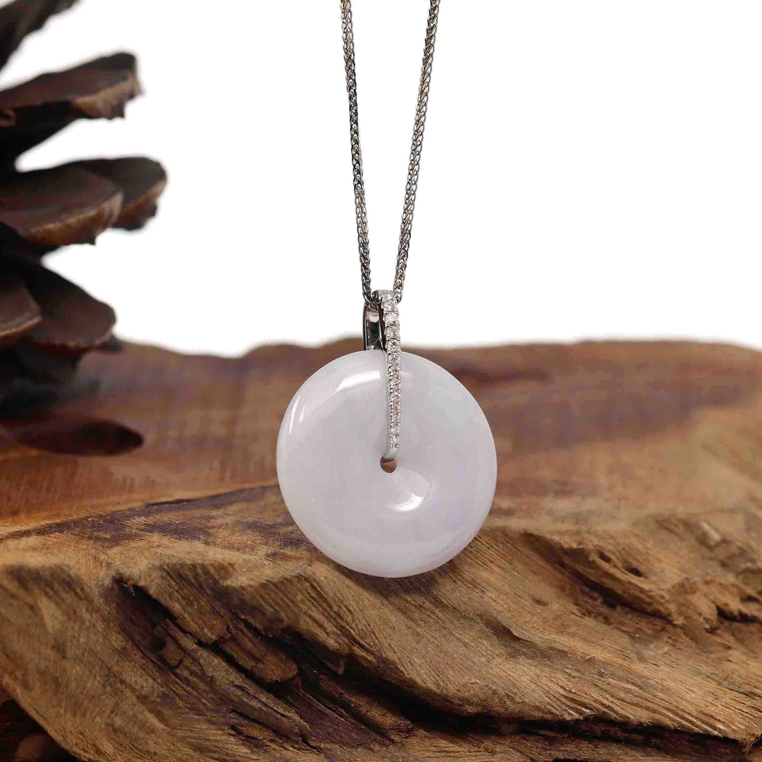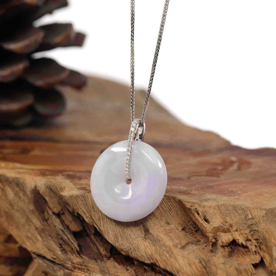 * Design Concept--- The simple shape of a circle represents things such as happiness, wholeness, and prosperity. This necklace is made with very high-quality genuine Burmese Ice Lavender Jadeite Jade and VS1 Diamonds. The necklace with Ice Lavender Jadeite Jade Pendant is an embodiment of style, cultural connection, and positive energy. Adorn yourself with this exquisite piece, and let it be a constant reminder of balance, well-being, and the timeless allure of meaningful jewelry. Gifting one of these is like wishing the best of luck to your family or loved ones. It's a significant gift.