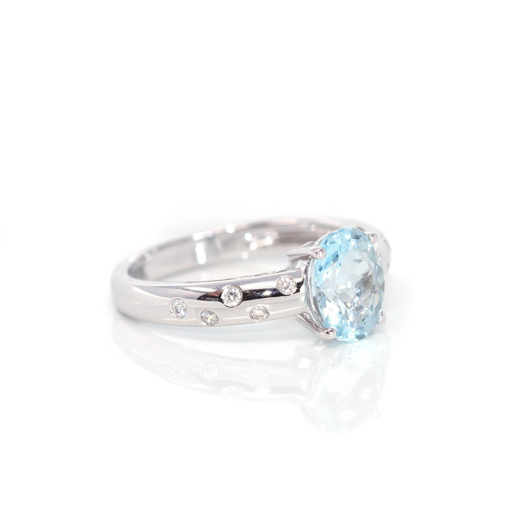 * Details--- This ring features an oval natural 1.8 ct blue aquamarine. The design is simplistic with a halo style. The ring is very exquisite with a unique style. Baikalla artisans are dedicated to combining beautiful gemstones with modern-day luxury. The simplistic setting design that keeps the originality of the rare gem.  It's a luxury gift for yourself or your love.