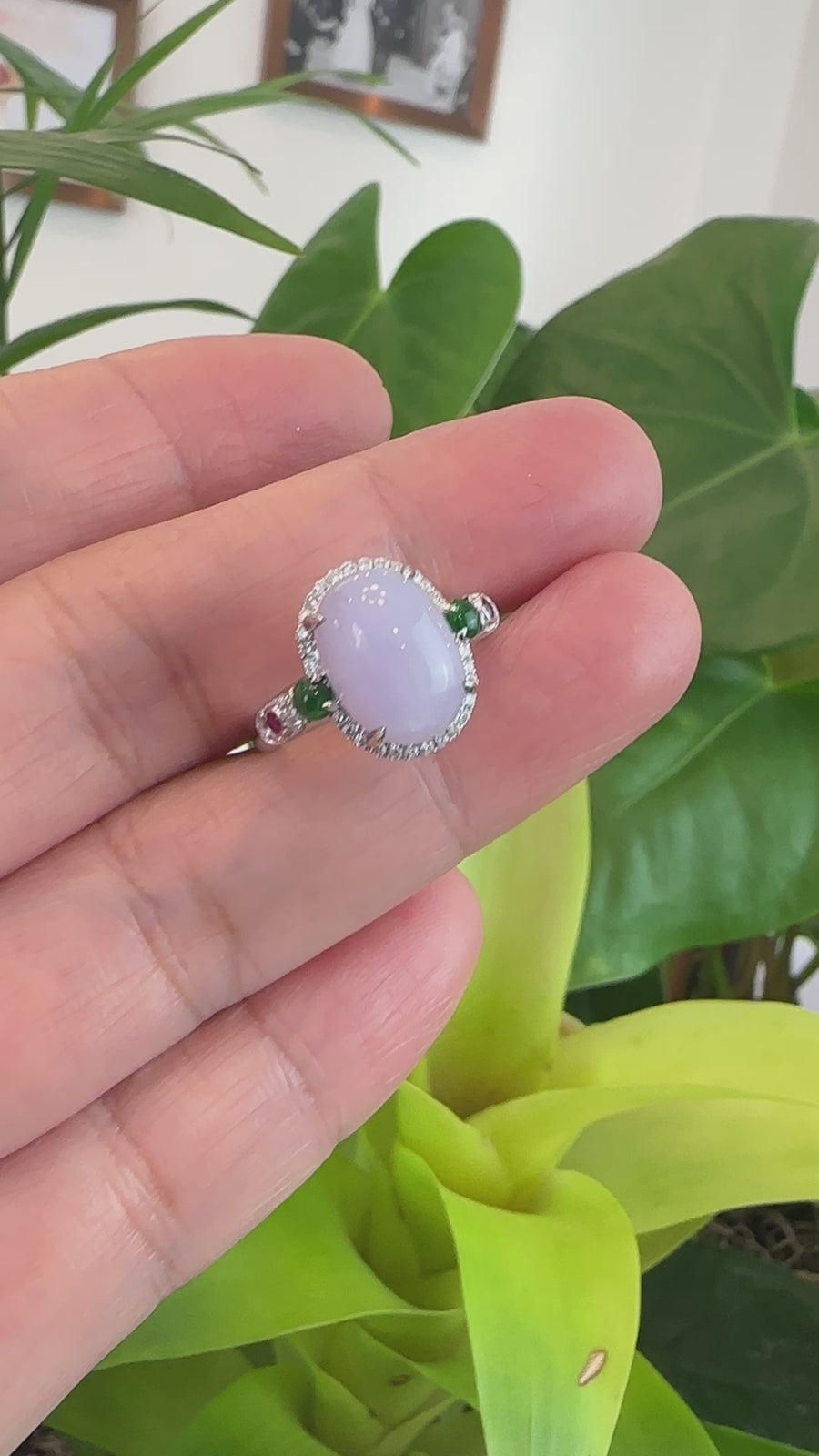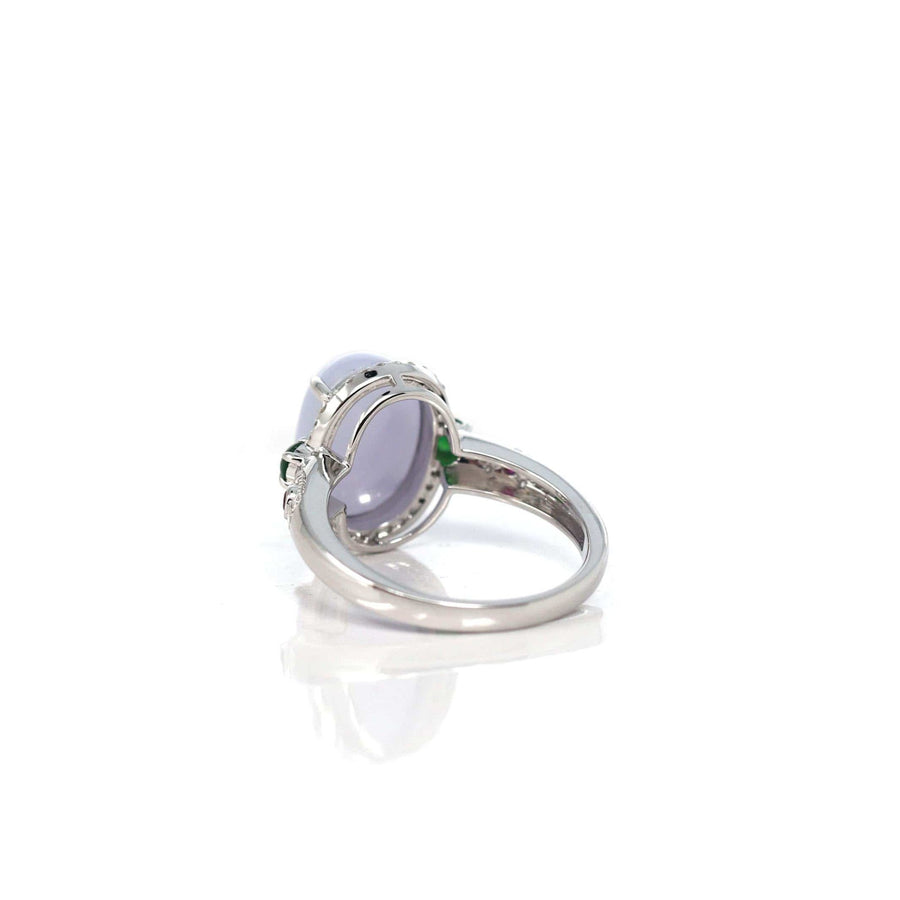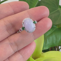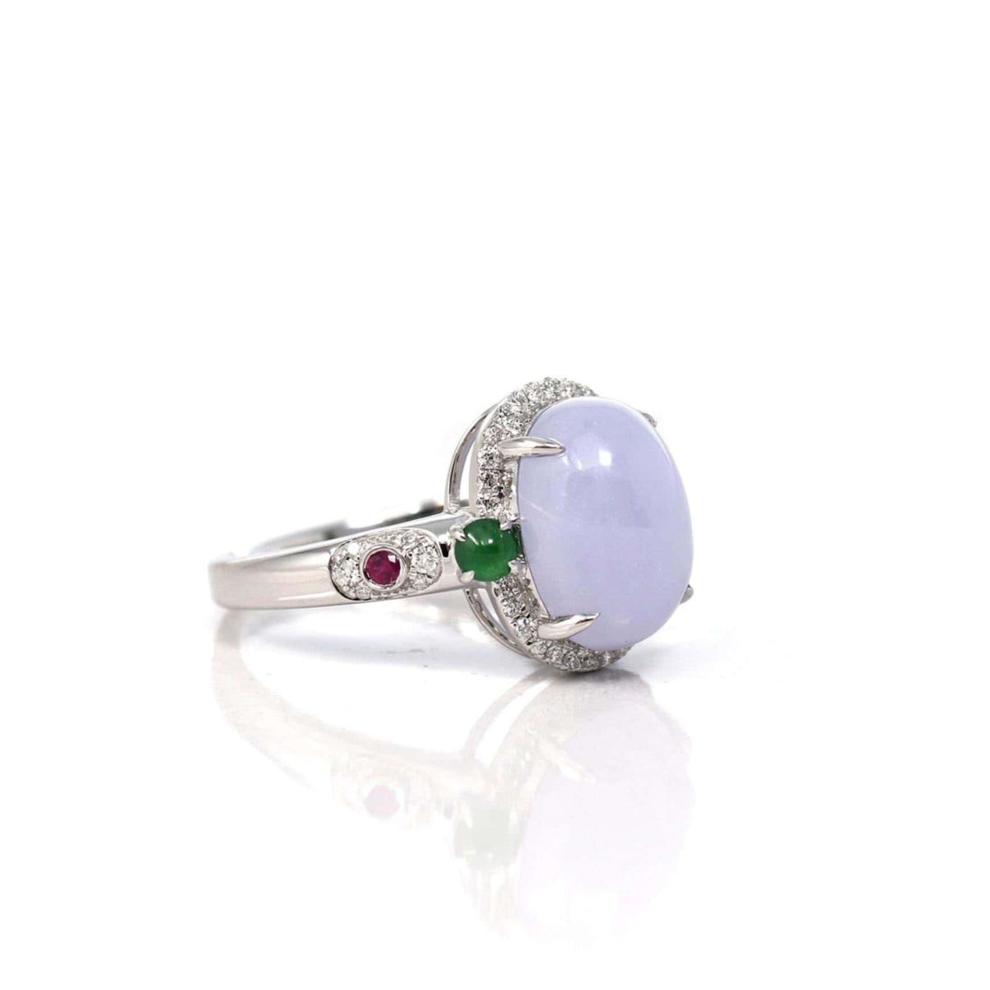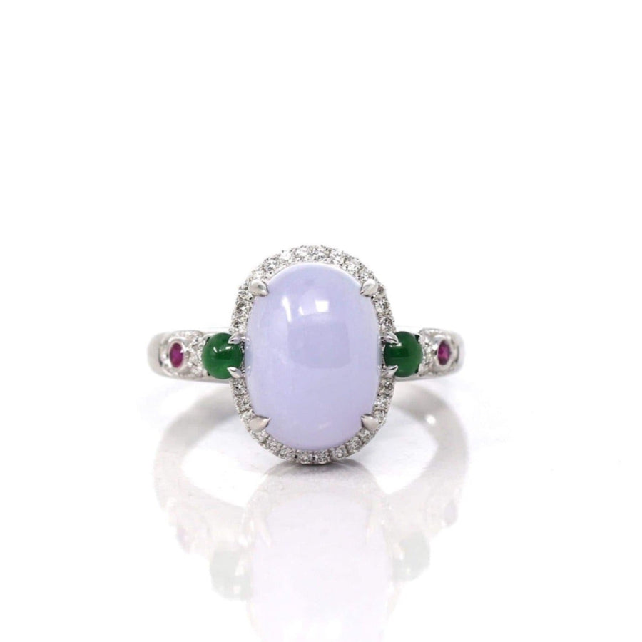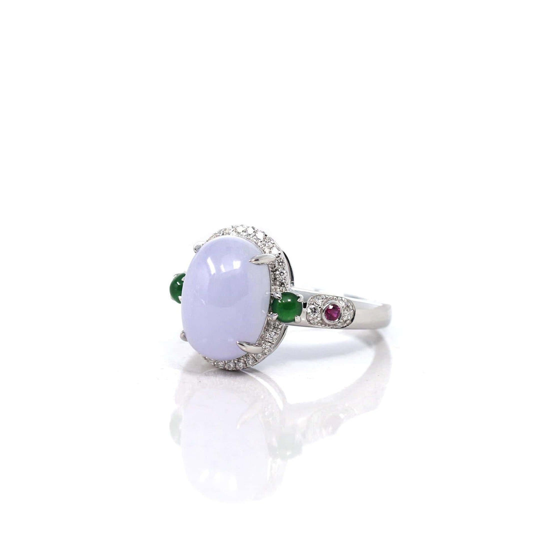 14k White Gold Natural Rich Lavender Oval Jadeite Jade Engagement Ring With Diamonds