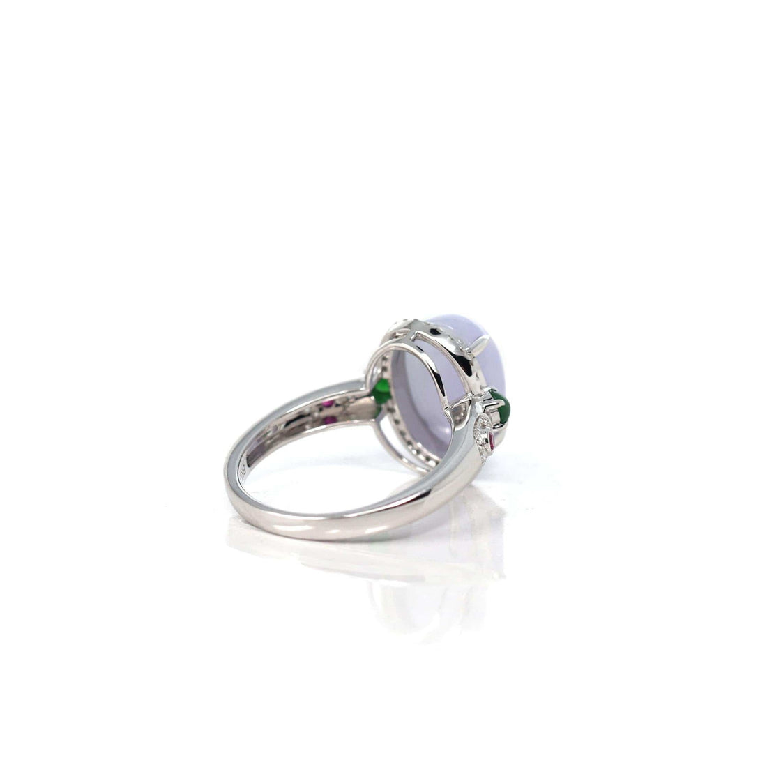 Design concept --- Perfect one of a kind piece for lovers of lavender jadeite jade. Incredible color and luster on this particular gem with amazing texture and translucency. Accented with VS1-2, G-H color natural diamonds. Along with two green imperial jade cabochon stones that match perfectly. Set in premium 14k white gold to bring out the value of the whole piece. Collector's item for jade lovers.