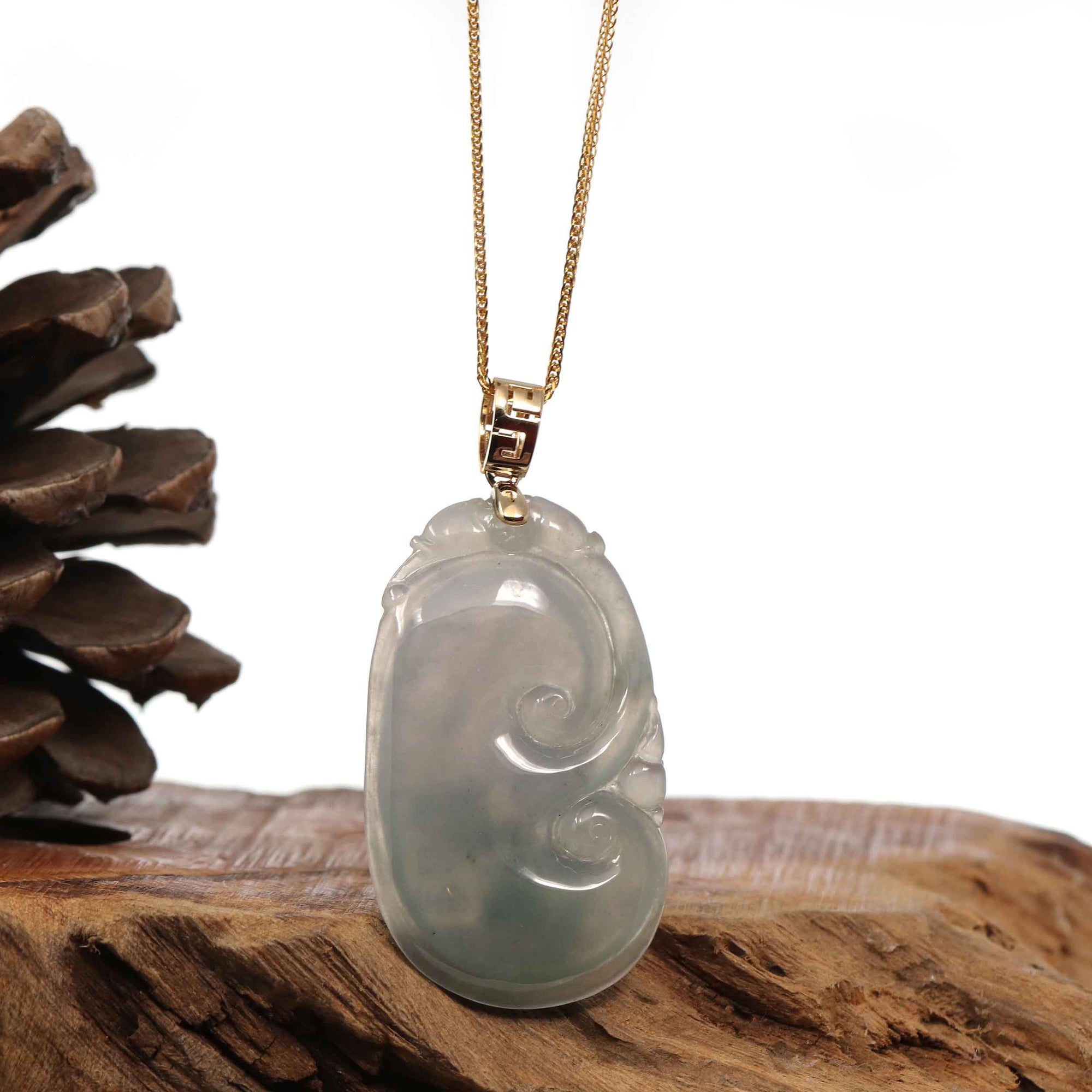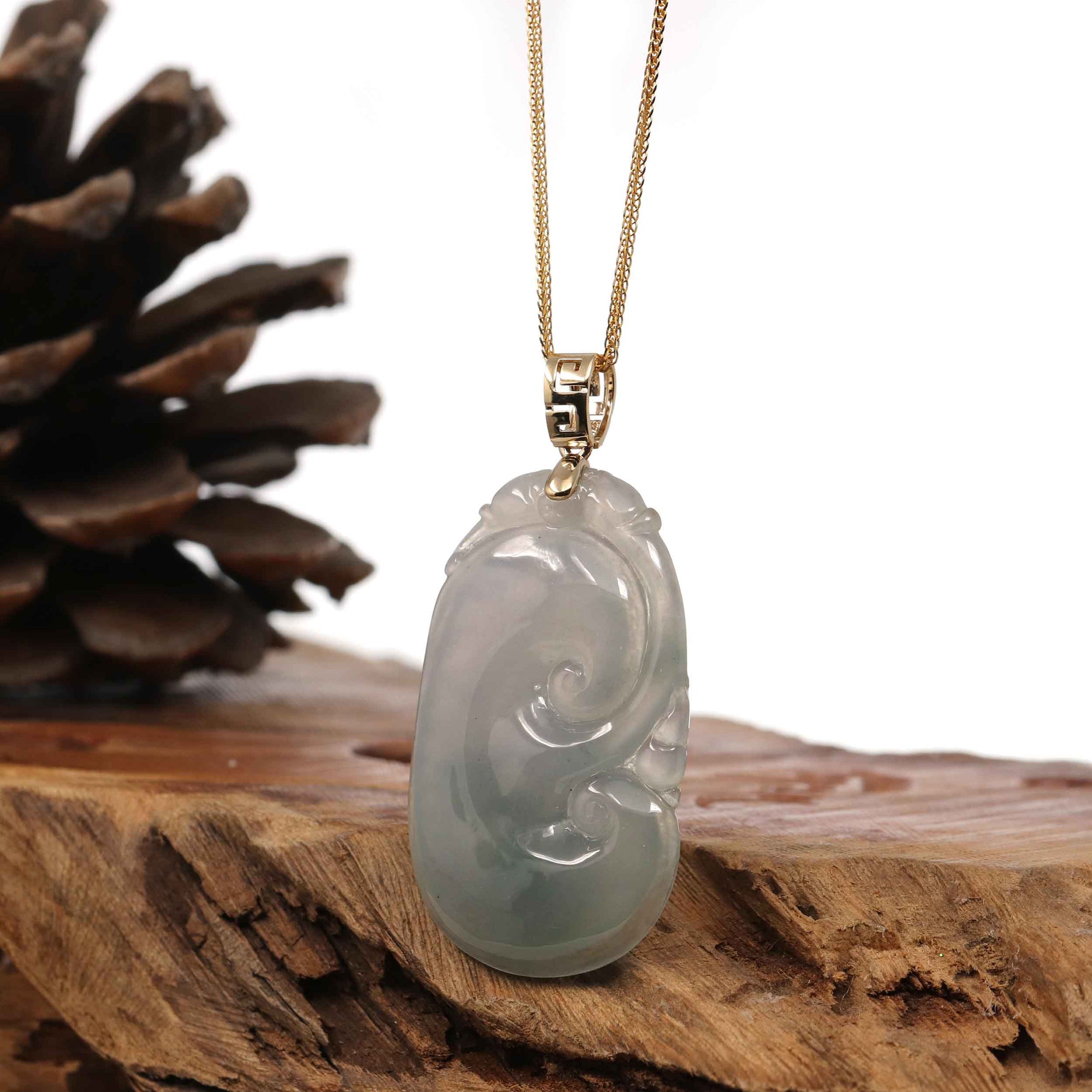 *Design concept-- "Ruyi" in Chinese literally means, "as you wish." This necklace portrays the timeless, good luck symbol in natural jadeite jade. The jade color is an icy green with more color at the bottom of the pendant, and more icy and transparent at the top. The jade texture is smooth and semi-translucent with no natural lines and cloudy spots. This piece is one of a kind and you will not find another like it. It's worn as a good luck charm. Perfect for a gift for a friend who is venturing into a new chapter of life or a someone who is venturing into a new business.