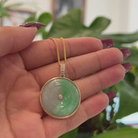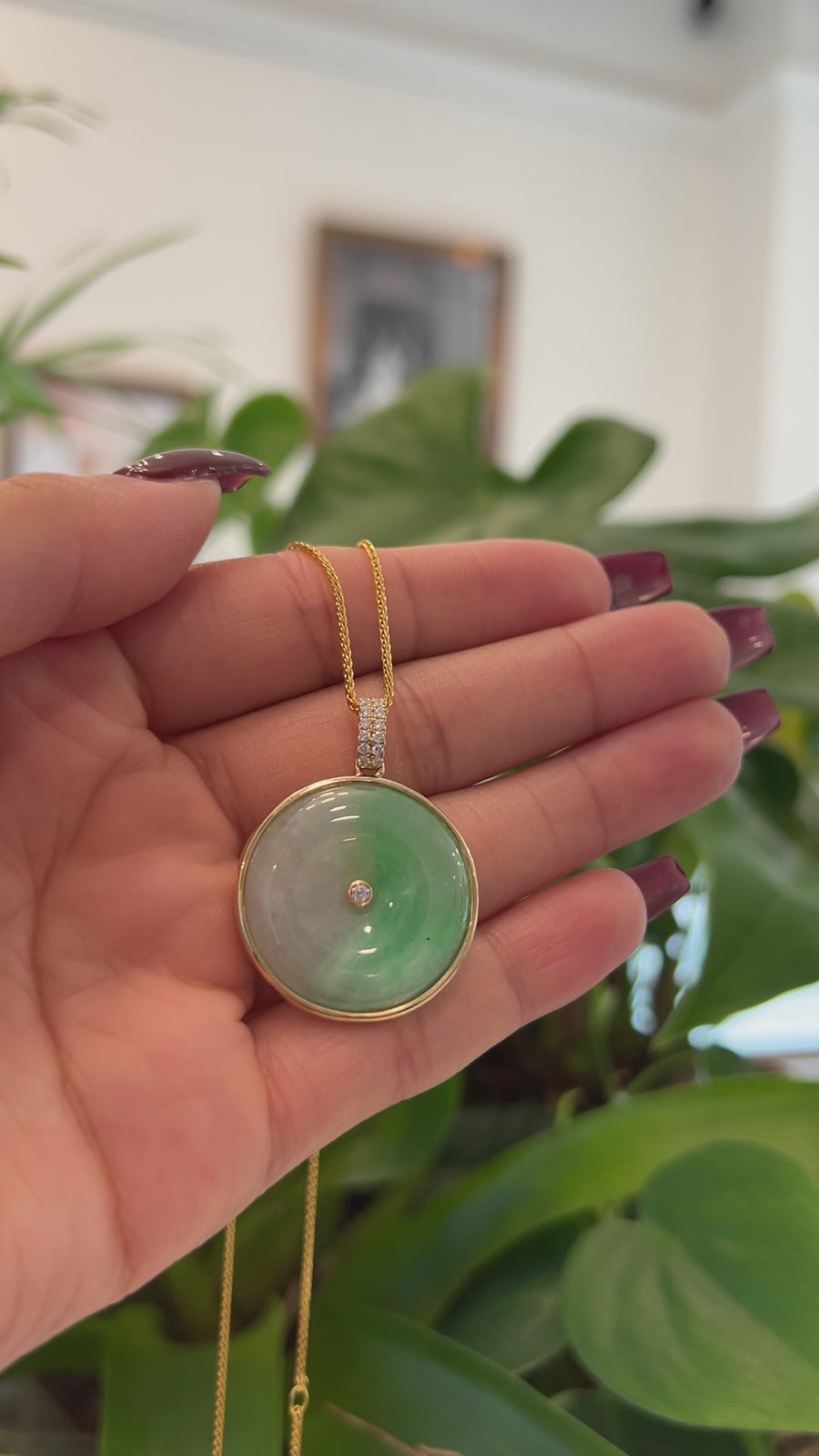 * Design Concept--- The simple shape of a circle represents things such as happiness, wholeness, and prosperity. This necklace is made with very high-quality genuine Burmese green jadeite jade. and made with 14K yellow solid gold with VS1 Diamond. The texture is very translucent from the old mine. The pattern looks like landscaping. Gifting one of these is like wishing the best of luck to your family or loved ones. It's a significant gift.