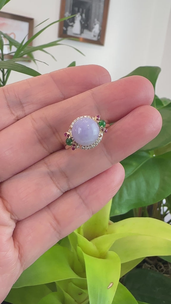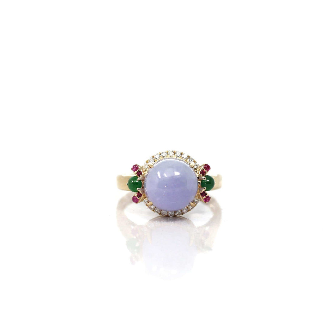 Design concept --- Perfect one of a kind piece for lovers of lavender jadeite jade. Incredible color and luster on this particular gem with amazing texture and translucency. Accented with VS1-2, G-H color natural diamonds. Along with two green imperial jade cabochon stones that match perfectly. Set in premium 14k yellow gold to bring out the value of the whole piece. Collector's item for jade lovers.