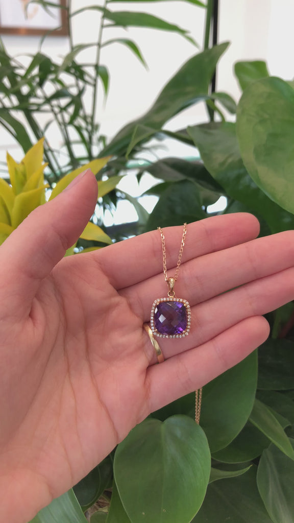 * INTRODUCTION----- This pendant is made with 18K rose gold with high-quality genuine AA nice purple amethyst and diamond. It looks so royal and exquisite. The luxury purple color stands out like no other. And the whole amethyst is so vibrant. The style is simple and classic with diamond halo. The pattern of culture is exquisite. Every angles and line are so beautiful. It's a perfect gift for yourself and your love.