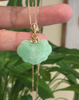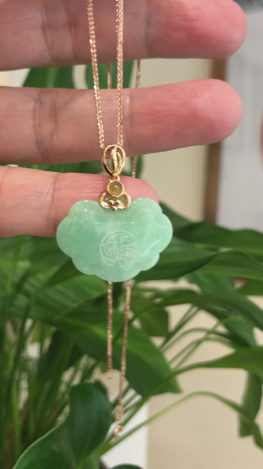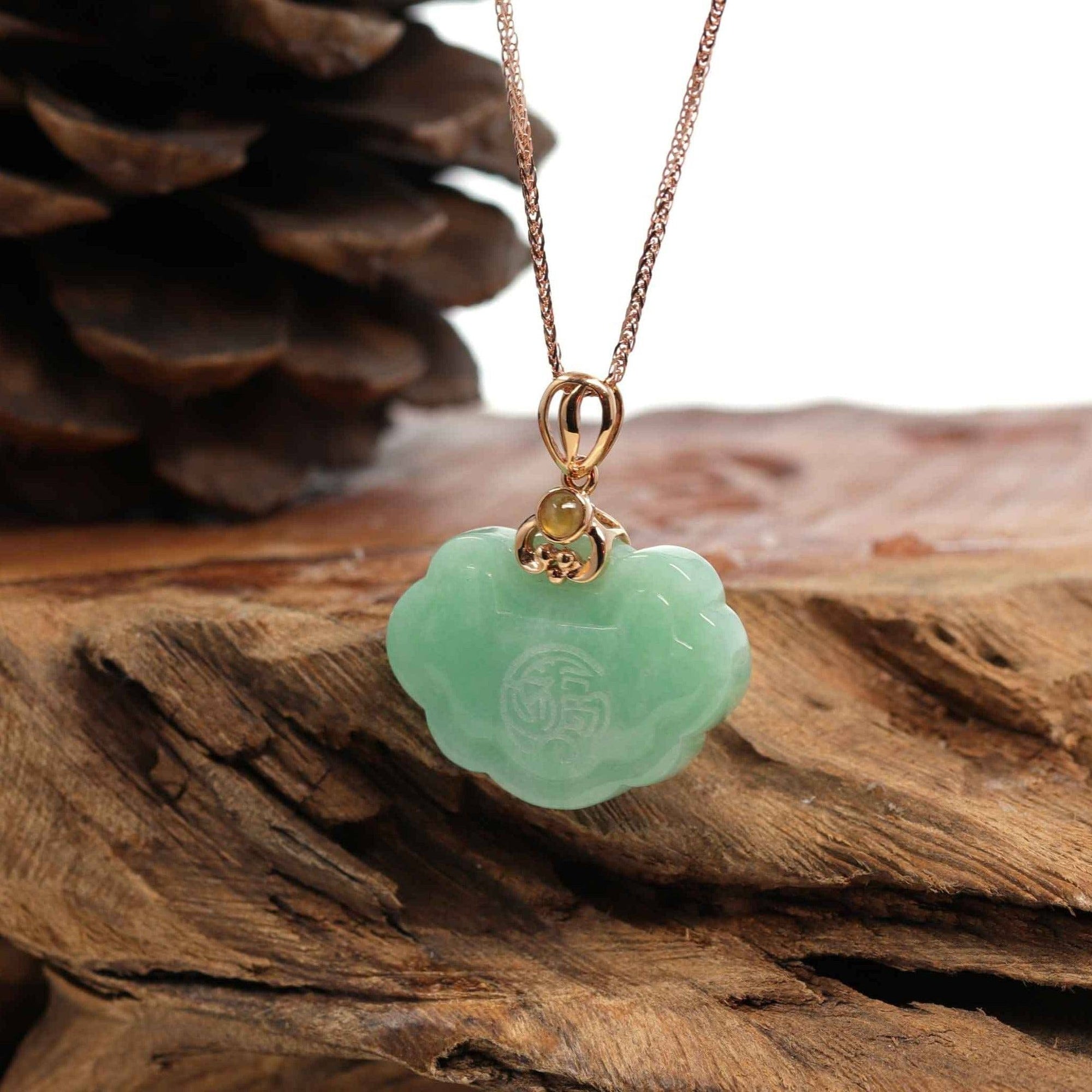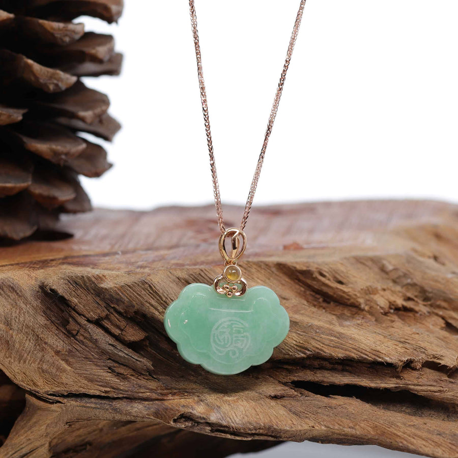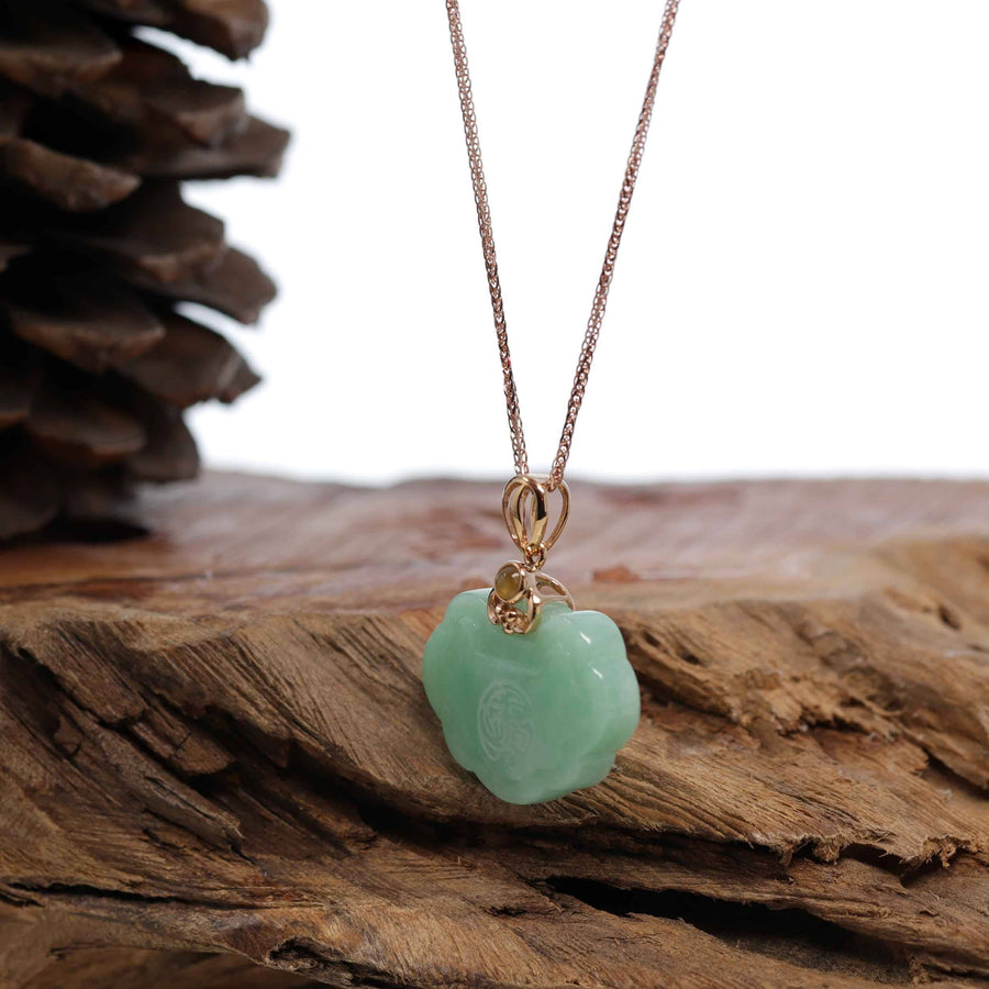 18k Rose Gold Genuine Burmese Green Jadeite Happiness ( Fu & Pingan ) Pendant Necklace