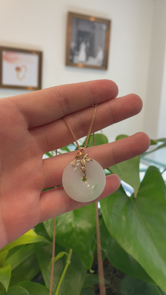 * DESIGN CONCEPT--- 18k Rose Gold & Genuine Burmese Jadeite Pendant Necklace With AA Ruby. This pendant is made with high-quality genuine jadeite with some green, The jadeite piece looks so clean and smooth without any clouds or cracks or any dirty spots. And it's translucent like there is water inside. The jadeite pendant's style is a good luck bird standing on the lucky "Circle Of Heaven". It means prosperity, good luck, and safety. The pendant looks so lovely and exquisite. It's a perfect gift for yourself and your love.