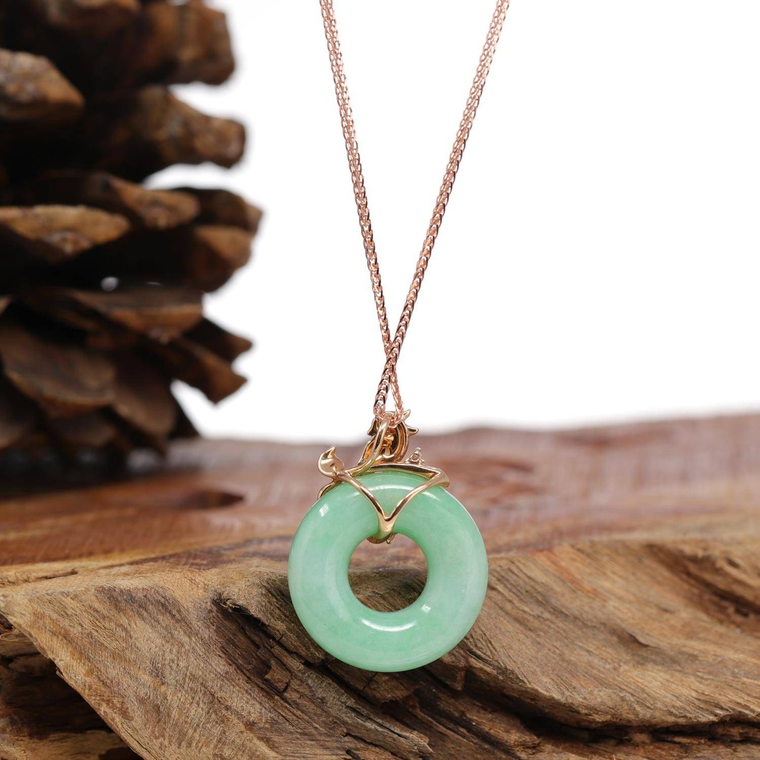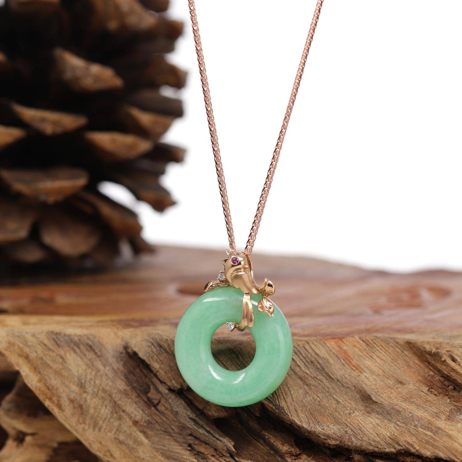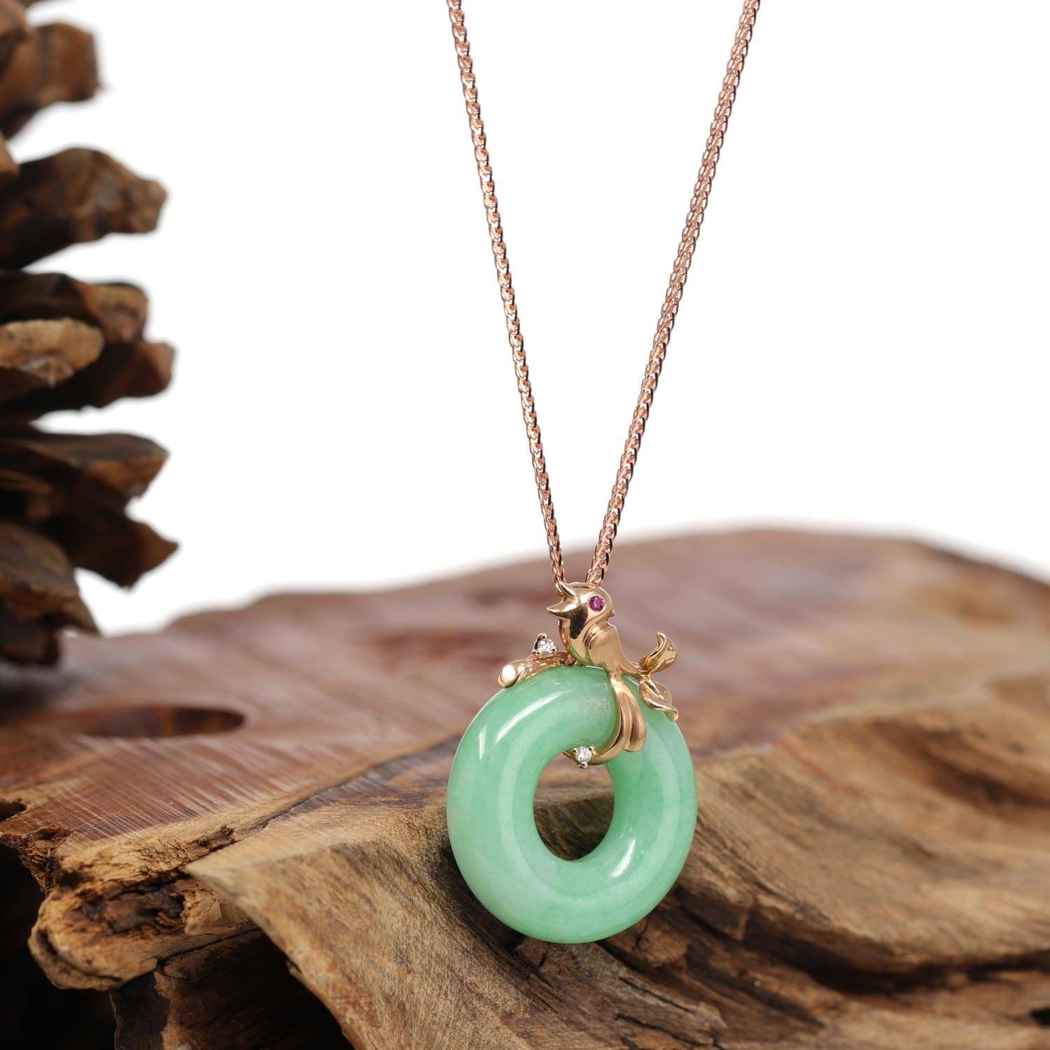 * DESIGN CONCEPT--- Genuine Burmese Jadeite Pendant Necklace with an 18k Rose Gold Bail dazzled with Diamonds & AA Ruby. This pendant is made with high-quality genuine jadeite in a vibrant apple green color. The jade texture is smooth and semi-translucent without any clouds or natural lines. The bail is crafted with solid 18k rose gold in a bird design, dazzled with diamonds and AA ruby. The jadeite pendant's style is a good luck bird standing on the lucky "Circle Of Heaven". It means prosperity, good luck, and safety. The pendant looks so lovely and exquisite. It's a perfect gift for yourself and your love.