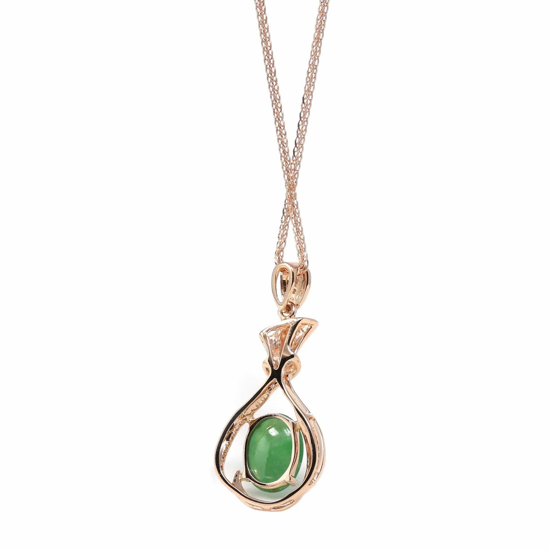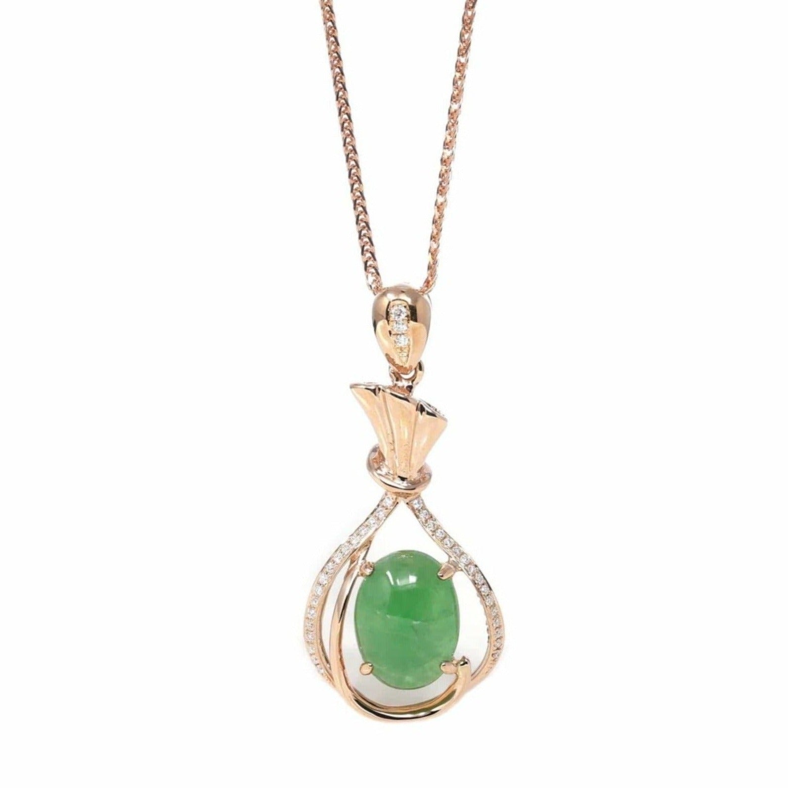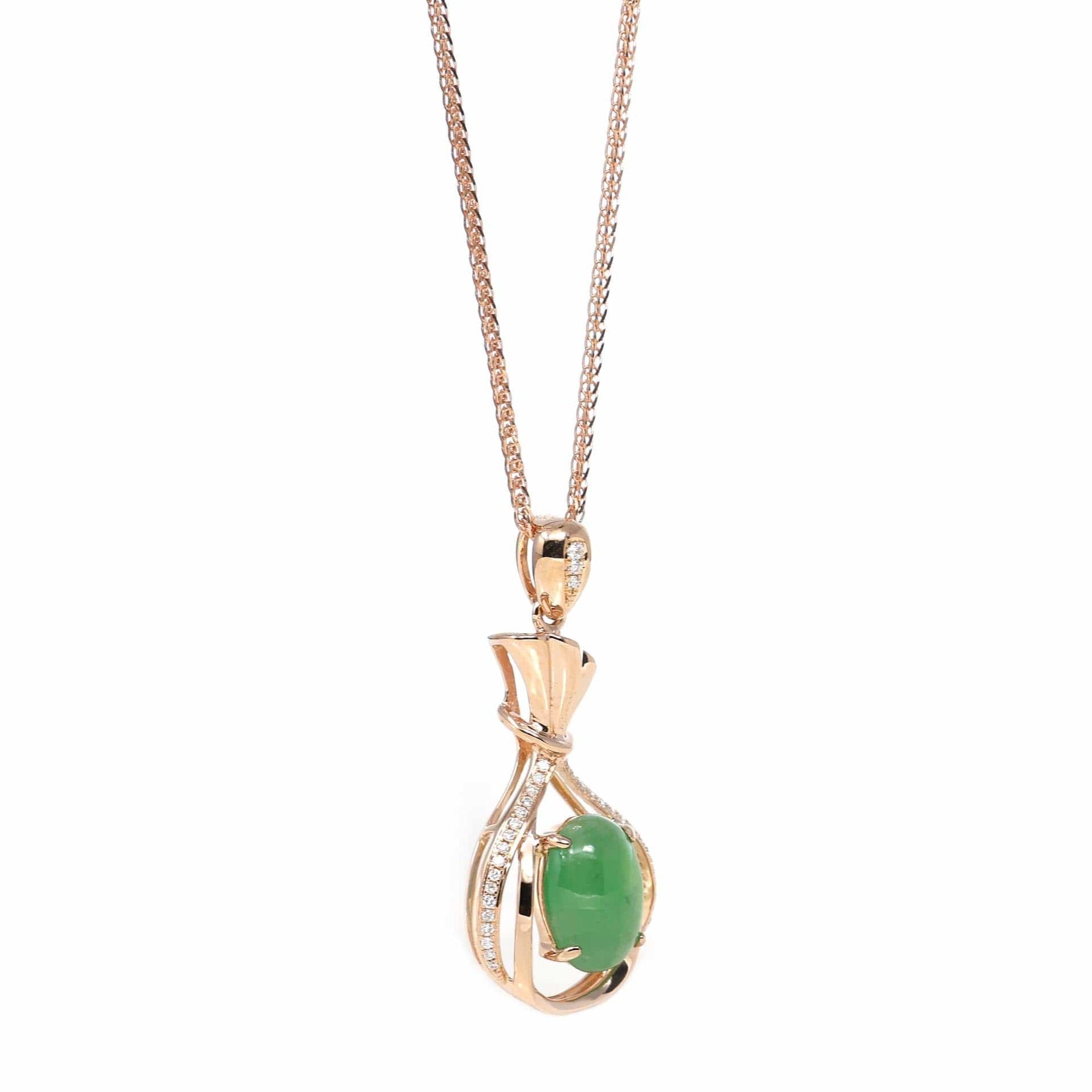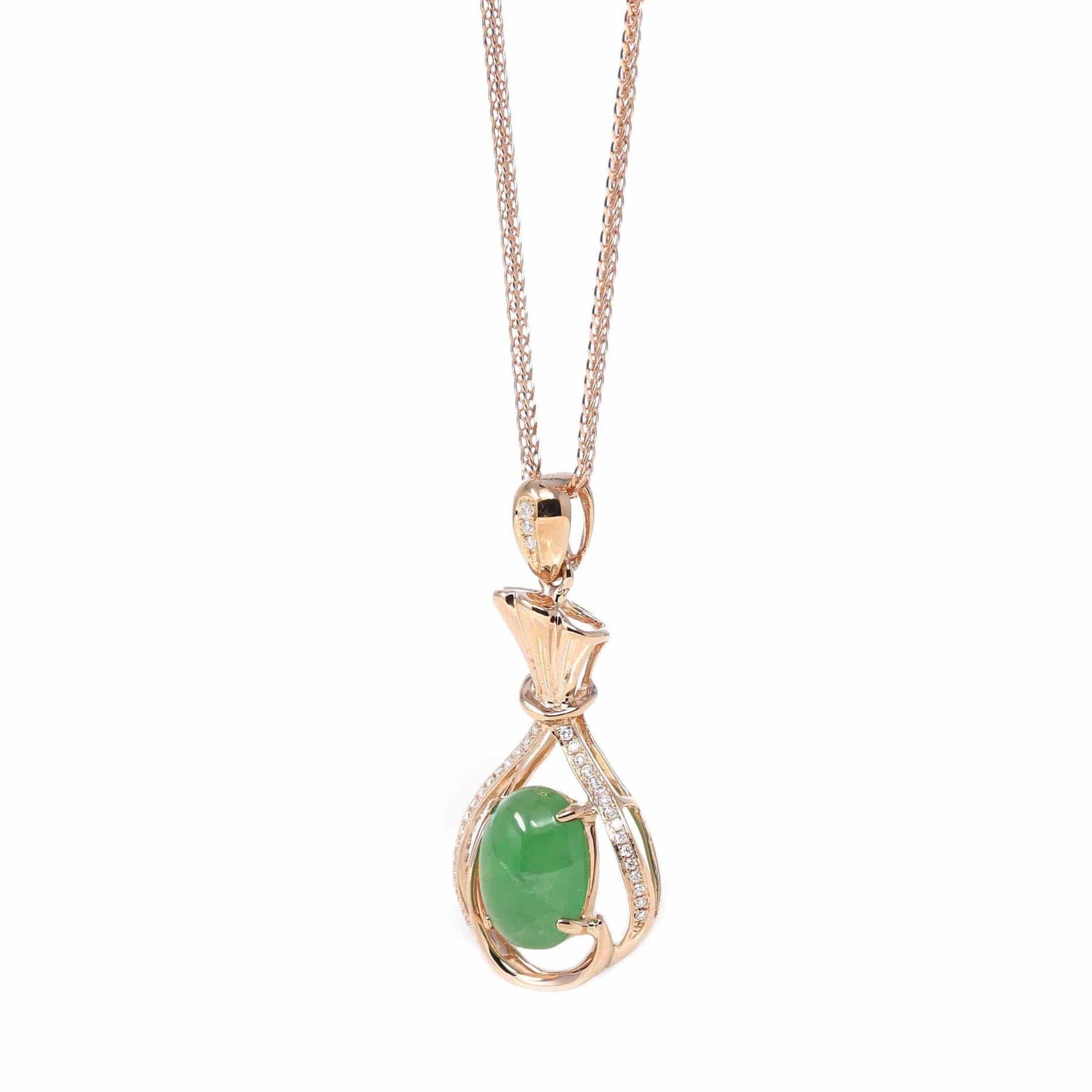 18K Rose Gold Oval Imperial Jadeite Jade Money Bag Necklace with Diamonds