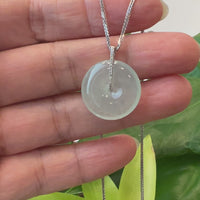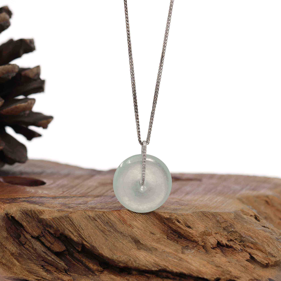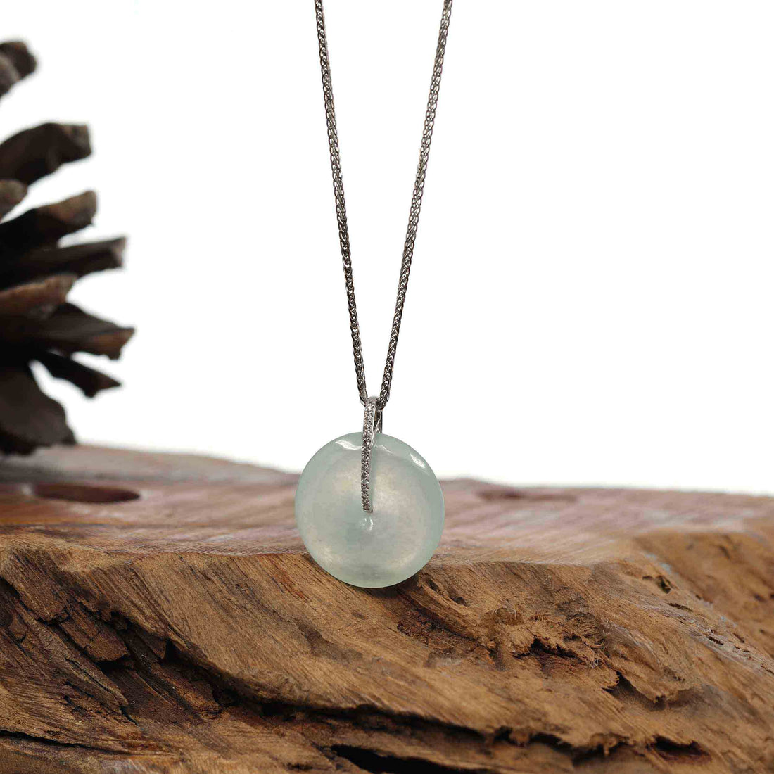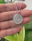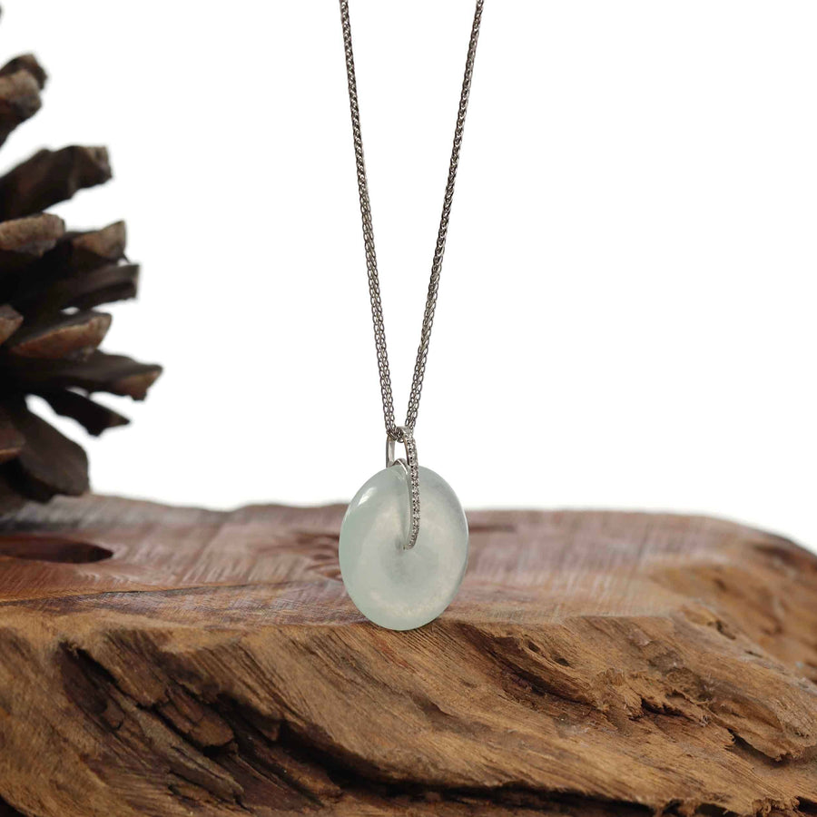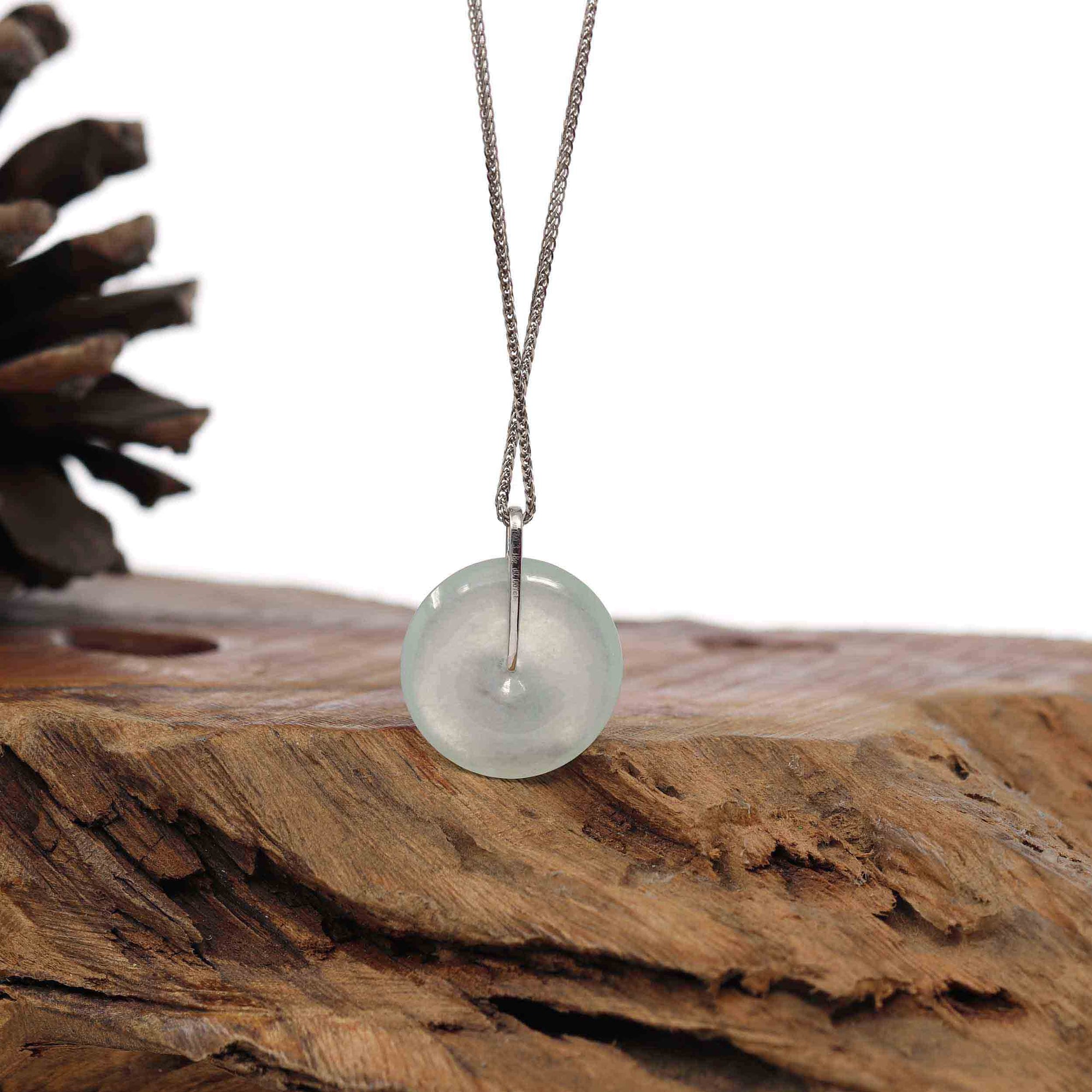 * Design Concept--- The simple shape of a circle represents things such as happiness, wholeness, and prosperity. This necklace is made with very high-quality genuine Burmese ice green jadeite jade. the necklace with Ice Green Jadeite Jade Pendant is an embodiment of style, cultural connection, and positive energy. Adorn yourself with this exquisite piece, and let it be a constant reminder of balance, well-being, and the timeless allure of meaningful jewelry. Gifting one of these is like wishing the best of luck to your family or loved ones. It's a significant gift.