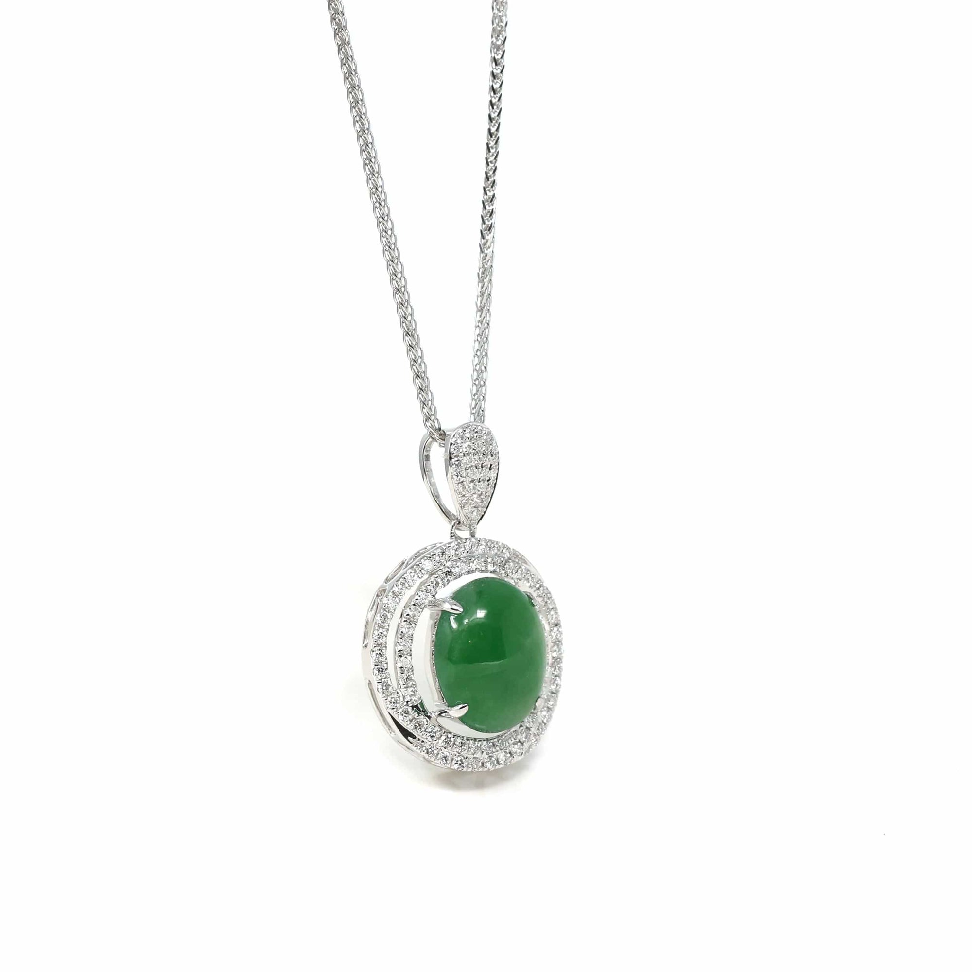 18K White Gold Oval Imperial Jadeite Jade Cabochon Necklace with Diamonds