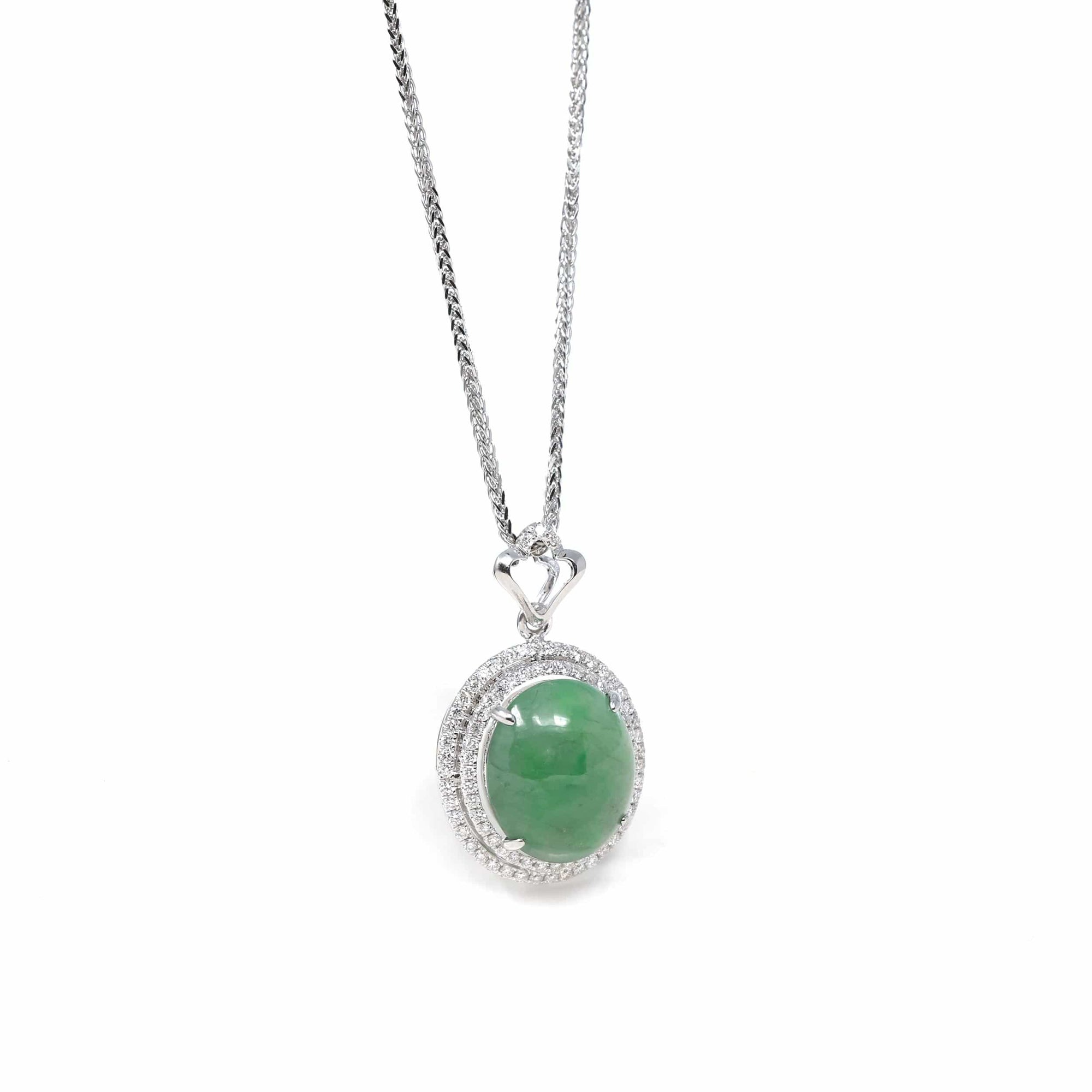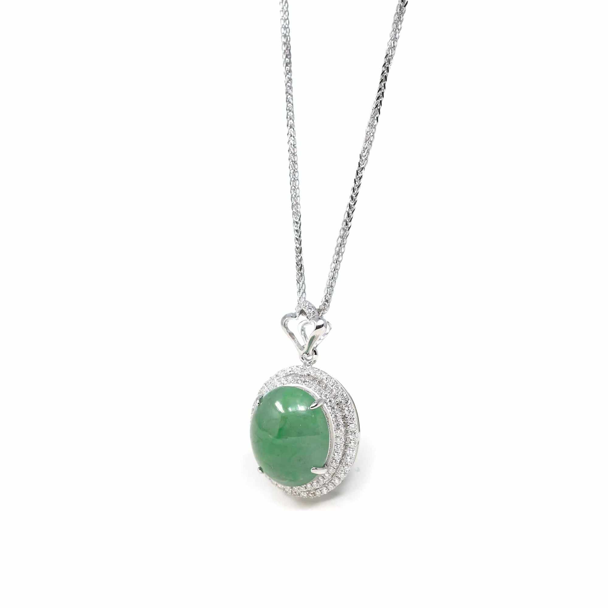 18K White Gold Oval Imperial Jadeite Jade Cabochon Necklace with Diamonds