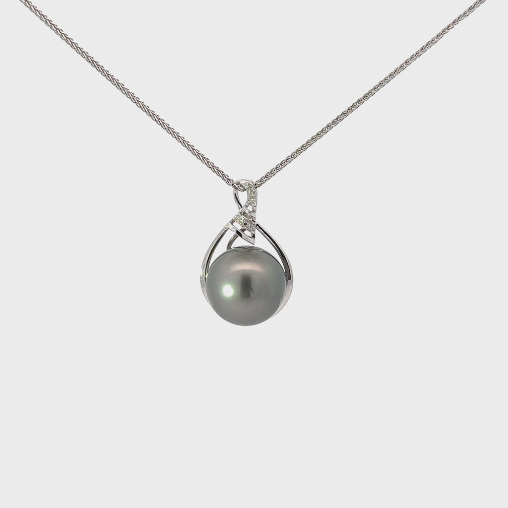 18k White Gold Round Black Tahitian South Sea Cultured Pearl & Diamond Michelle Pendant Necklace for Women in AAA Quality