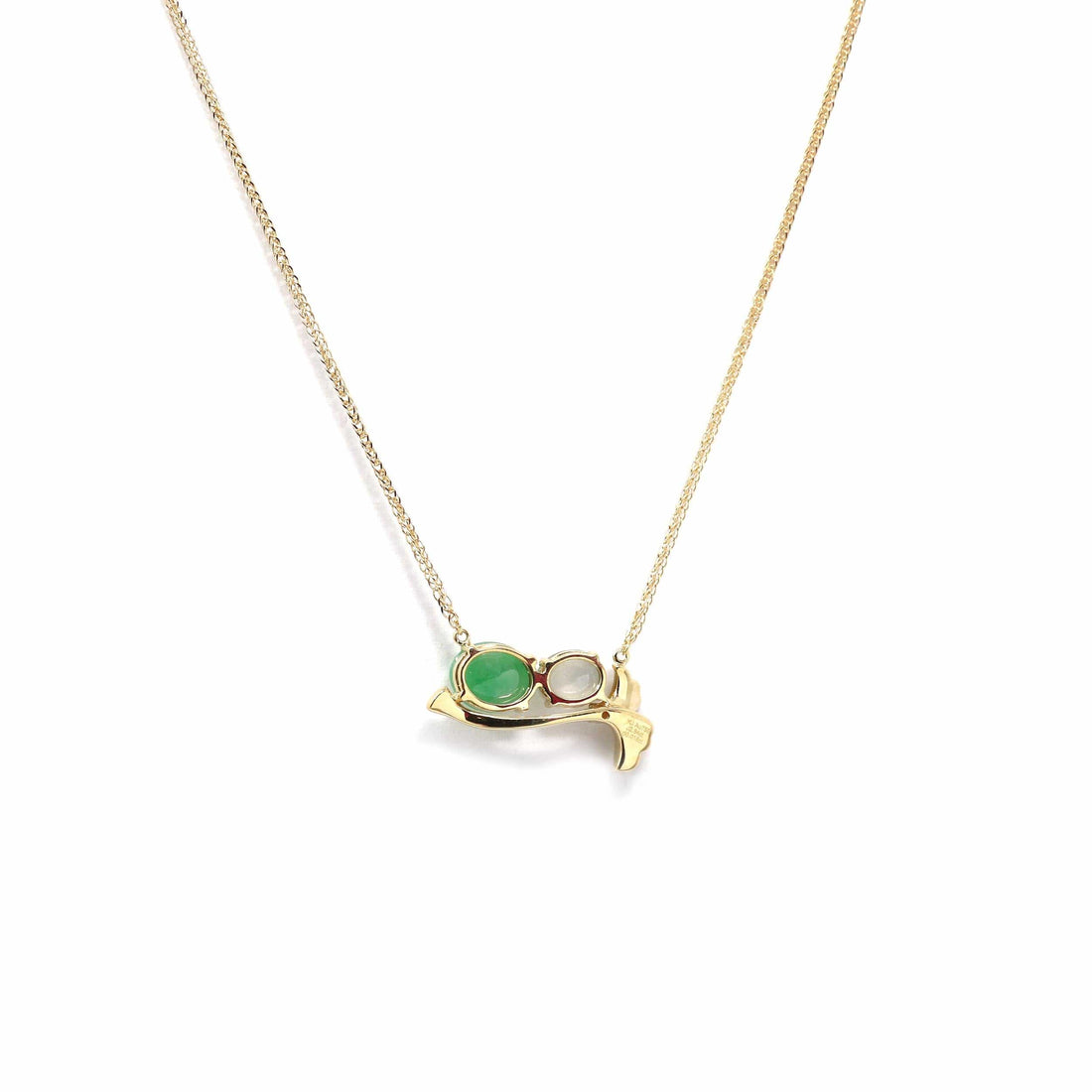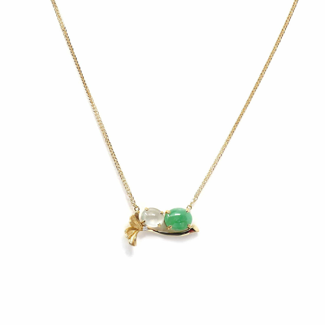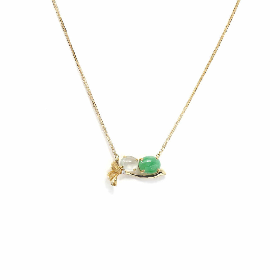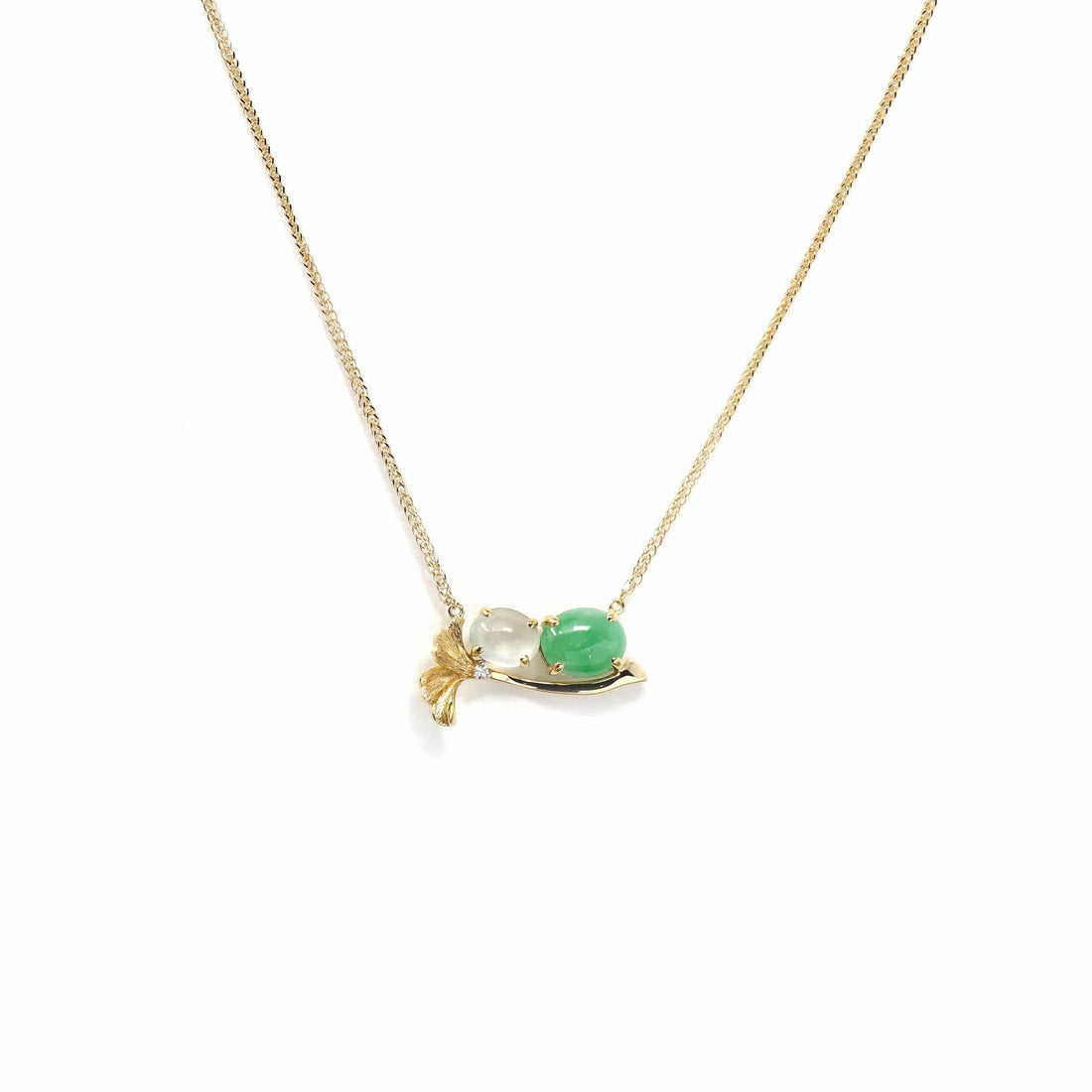 18k Yellow Gold Jadeite Jade Ginkgo Leaf Pendant Necklace with Diamond