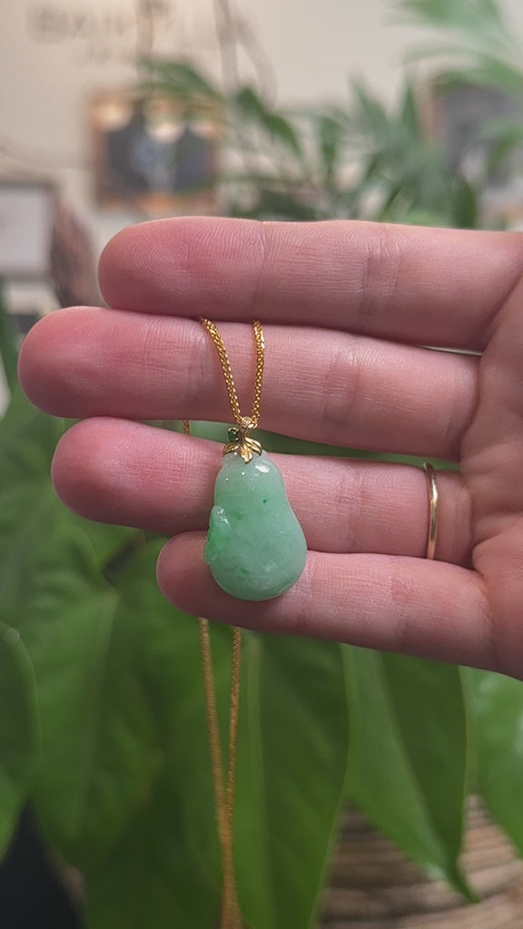 *Design concept--"Shou Tao" in Chinese literally means Longevity Peach. From Chinese folklore that in the Chinese mythical heaven, there is a peach tree garden where all the peaches are magical and add years to your life. This necklace portrays the timeless, good luck symbol in a vibrant green genuine Burmese jadeite jade with an 18K gold bail that is dazzled with diamonds and imperial jade. This piece is one of a kind, and you will not find another like it. It's worn as a good luck charm. Perfect for a gift for a friend or family.