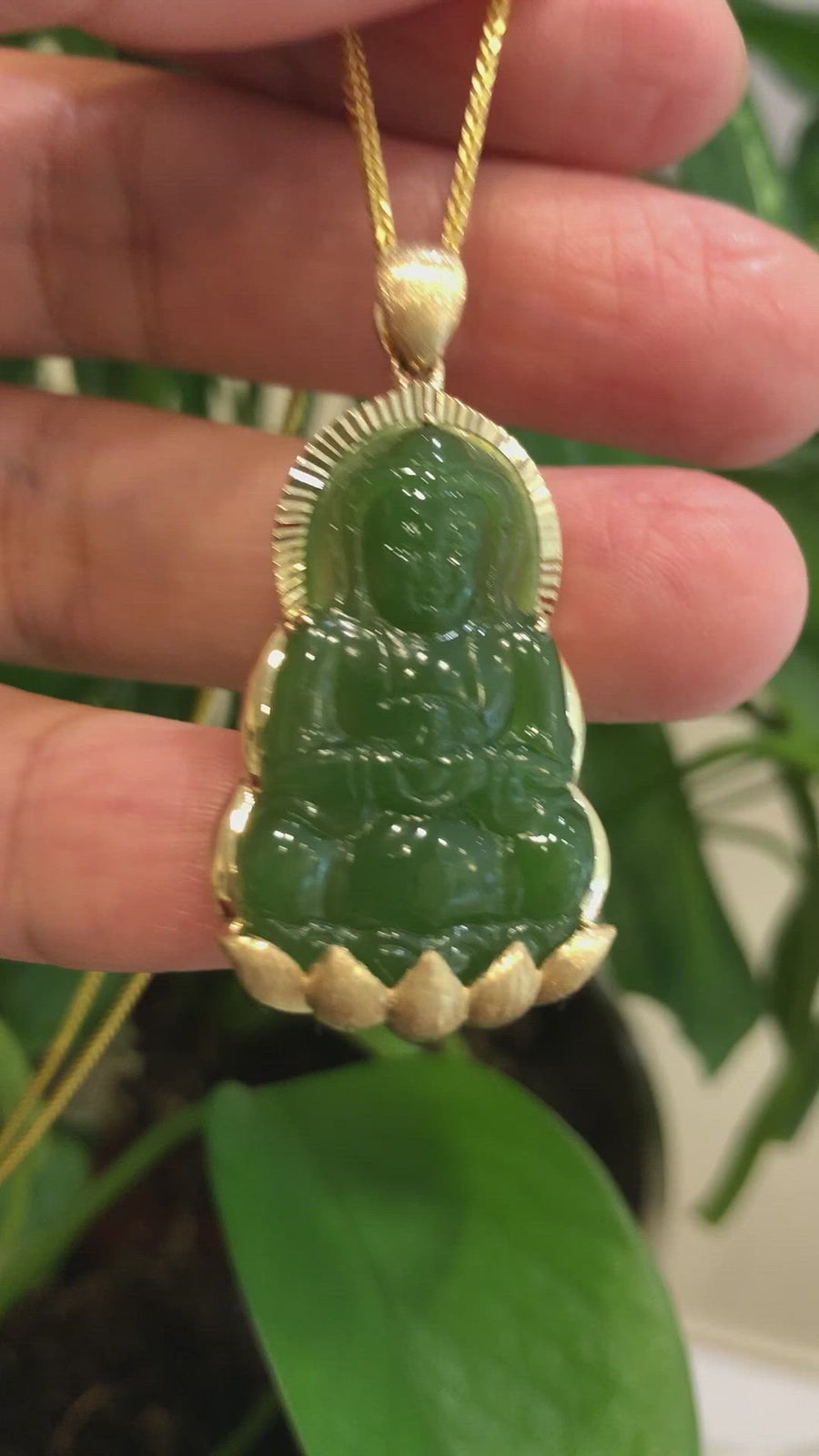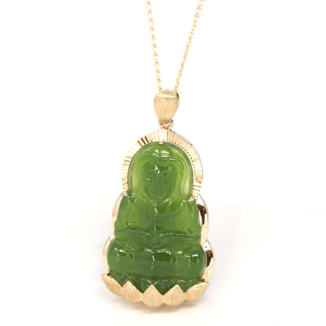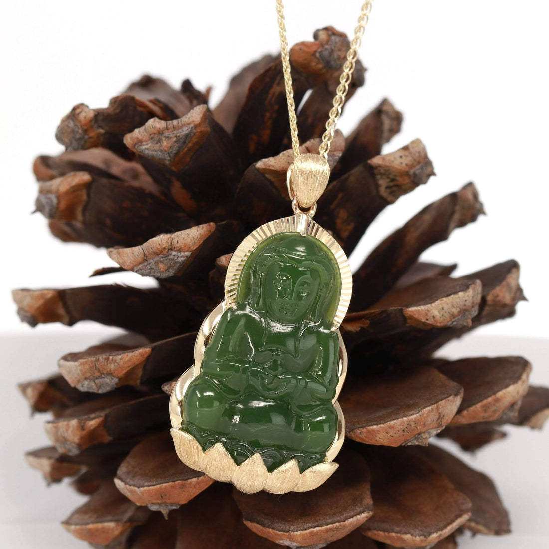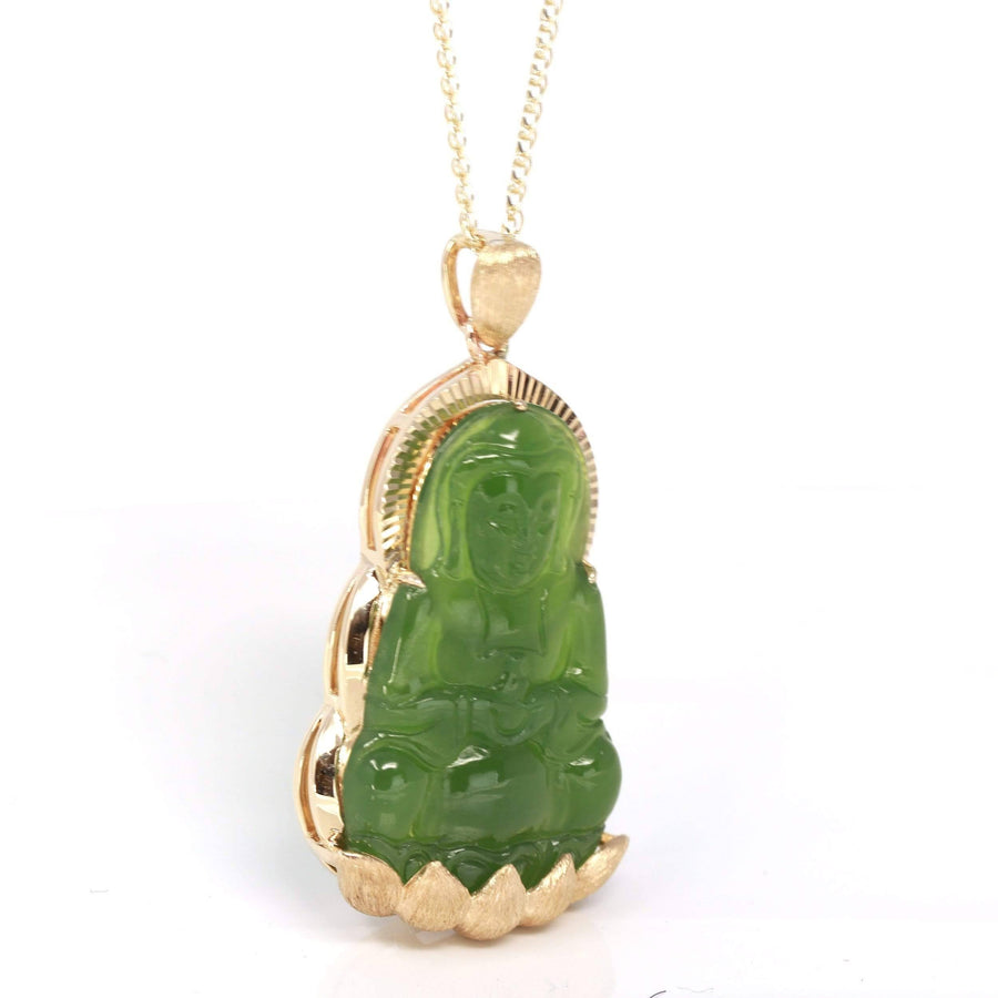 * INTRODUCTION----- Genuine Nephrite Green Jade Guan Yin Pendant Necklace. The Guan Yin looks so kind and powerful with great hand carving. Every detail and angle are so perfect. It's an expression like bless your all and kind to your all. This pendant is made with high-quality genuine nephrite green jade & yellow gold. The jade looks so clean and smooth with a little deep green in person.  and the solid yellow gold lotus and halo. The pendant looks so exquisite. People always believe the genuine jade is lucky jade. Guan Yin is always blessing you like God. It's a perfect gift for your love.
