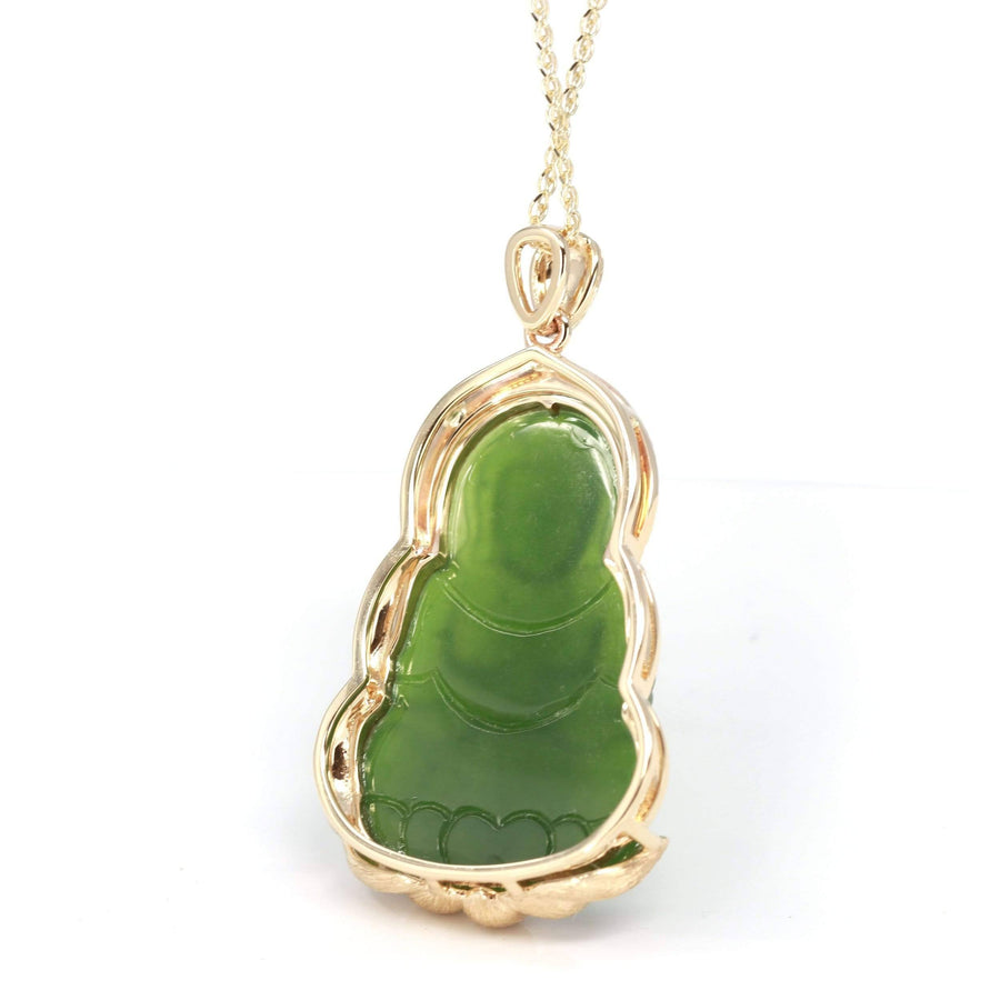 DETAILS--- 14K Yellow Gold Genuine Nephrite Green Jade Guanyin Pendant Necklace. This pendant is made with high-quality genuine green jade; The green jade texture is so smooth and translucent with a little deep green. The person who wears a Guan Yin pendant around the neck attracts positive energy. They emit positive waves into the environment around them. The belief is all of the entire negativity is destroyed, and a fighting spirit is generated within the person.