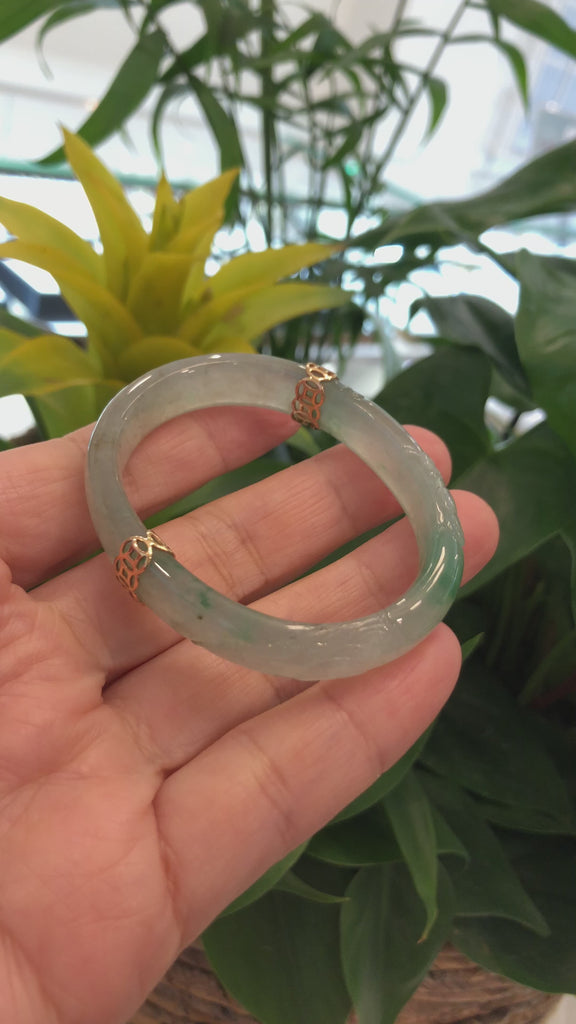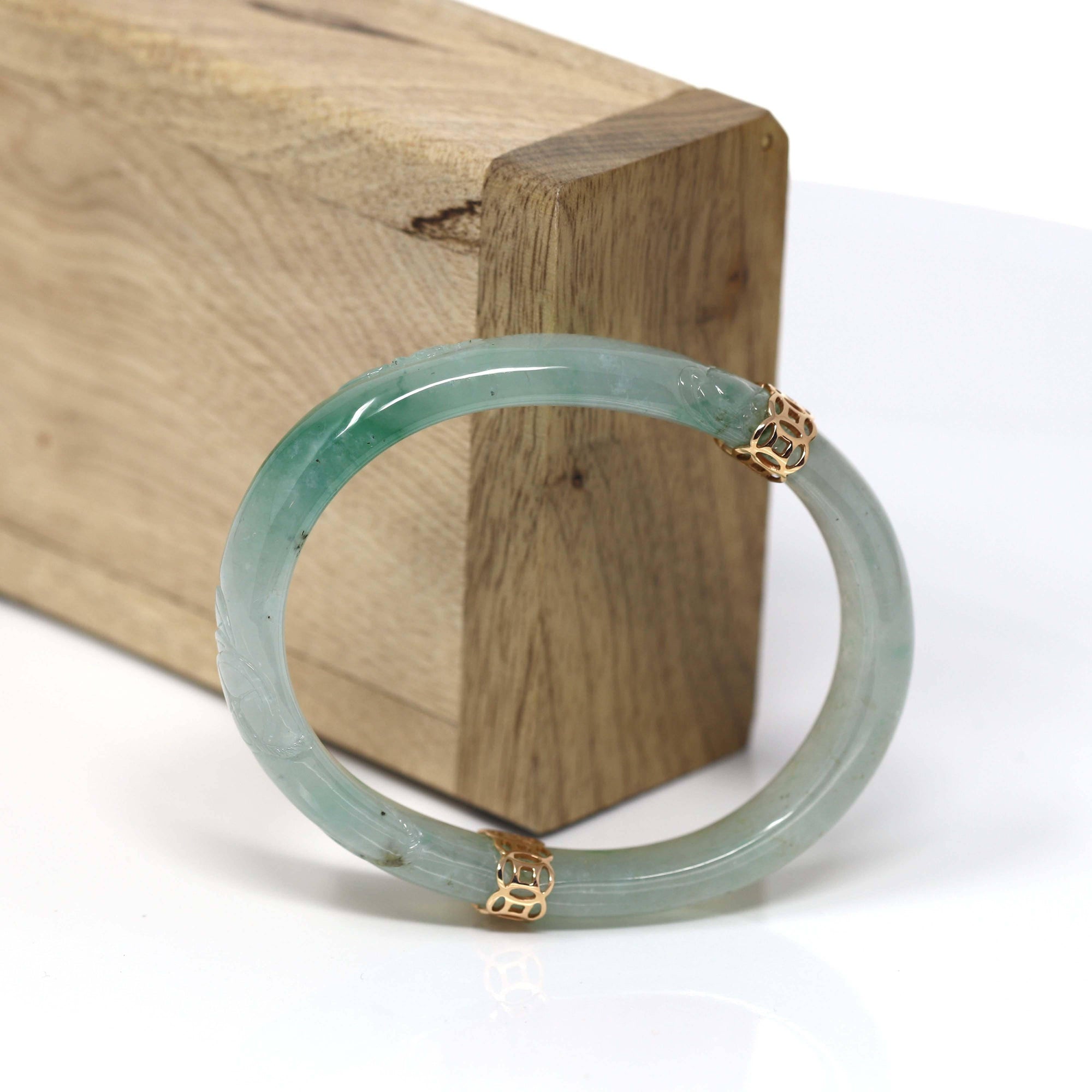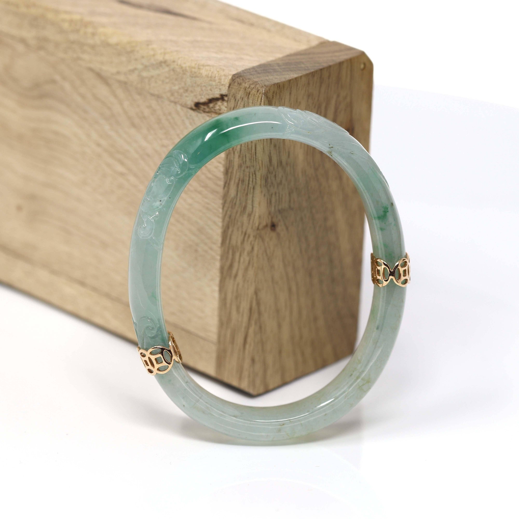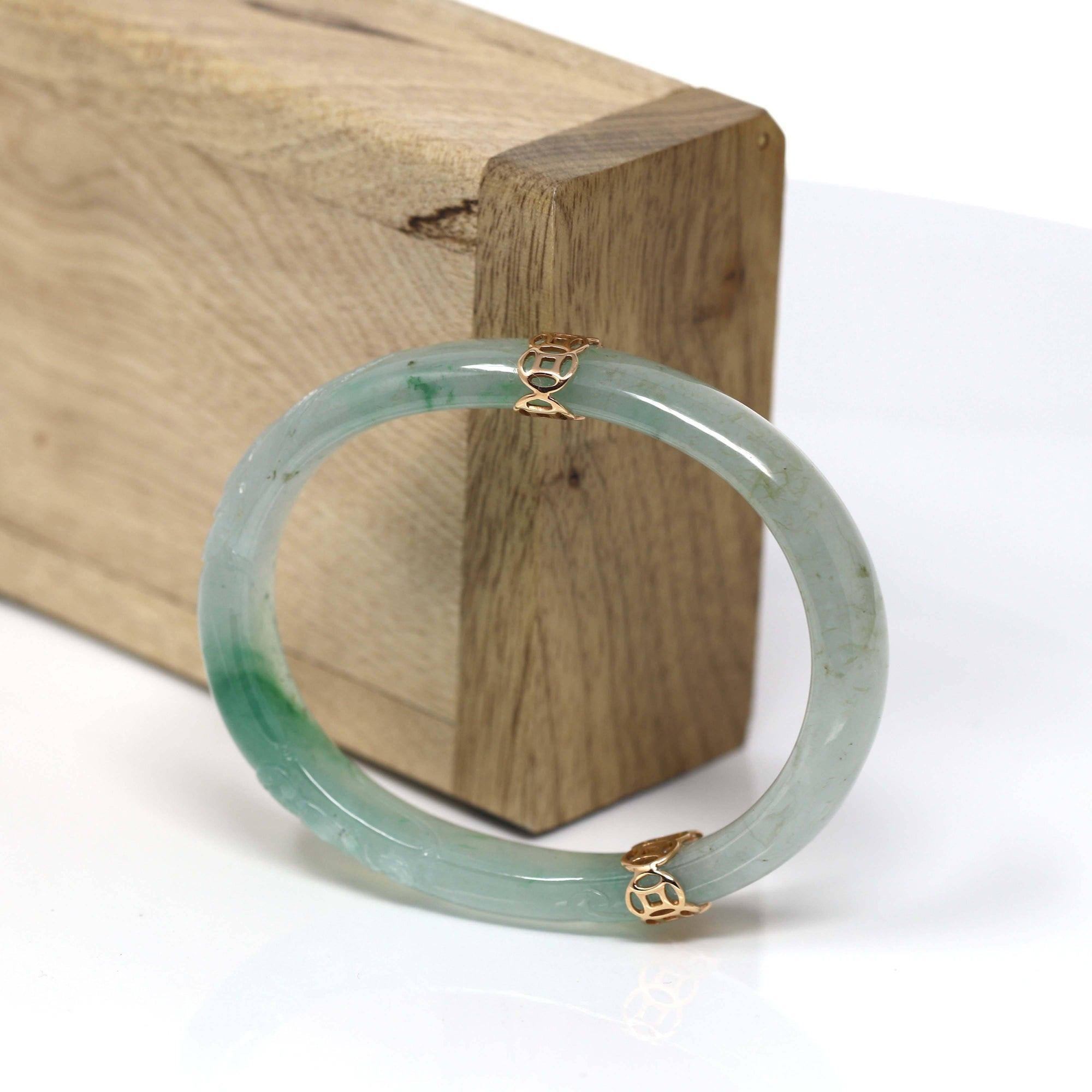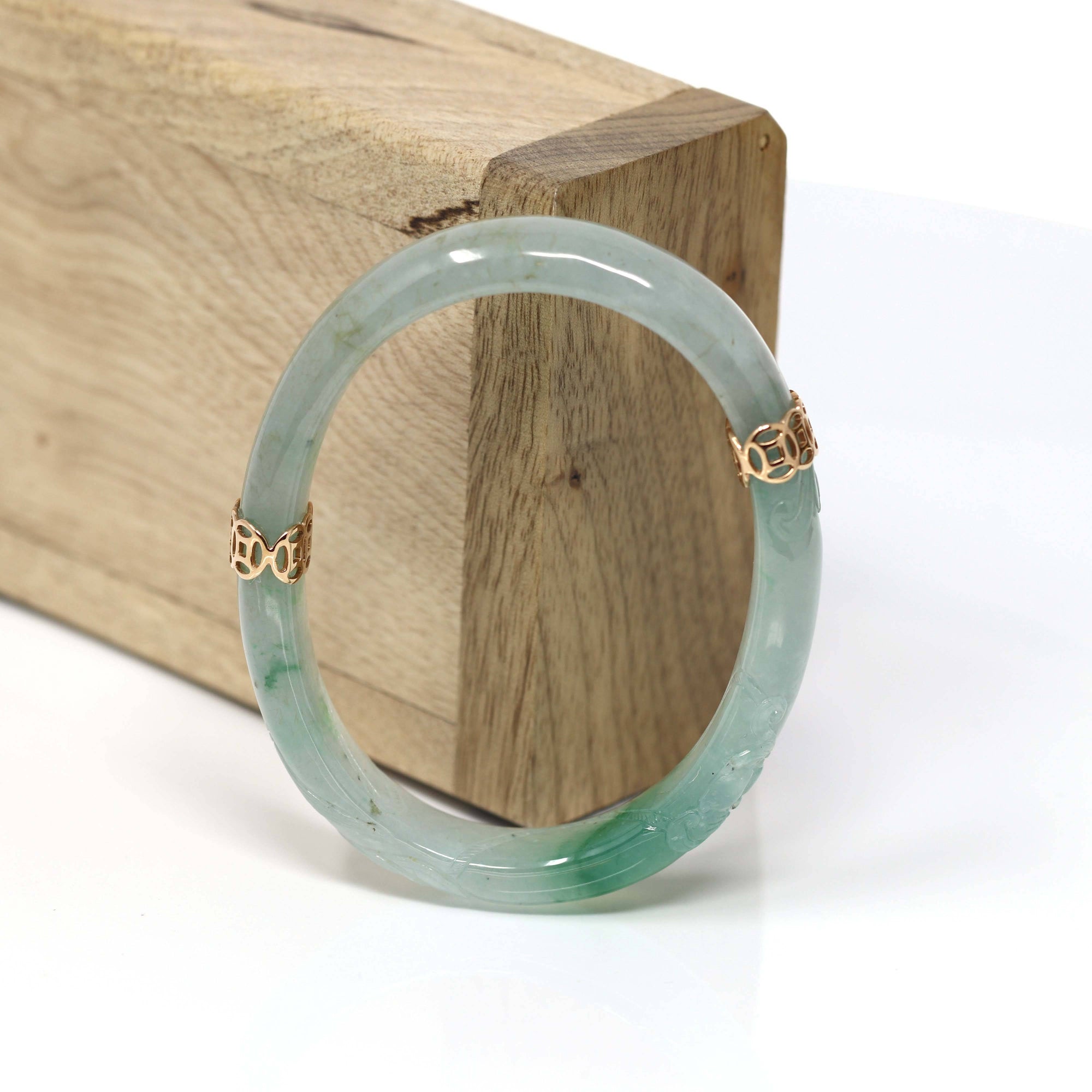 * INTRODUCTION--- Introducing the "Classic Bangle" 18k Genuine Oval Jadeite Jade Bracelet Bangle, a timeless piece of jewelry that marries the luxurious appeal of 18-karat gold with high-quality jadeite jade. The transparency of the jadeite brings out the beautiful green hue with a calming white texture that makes a mesmerizing combination. Using "Yuan Bao" carvings this bangle will become a cherished addition to your jewelry collection or a thoughtful gift. It captures the essence of luxury and uniqueness, offering a touch of sophistication to those who appreciate artisan craft.