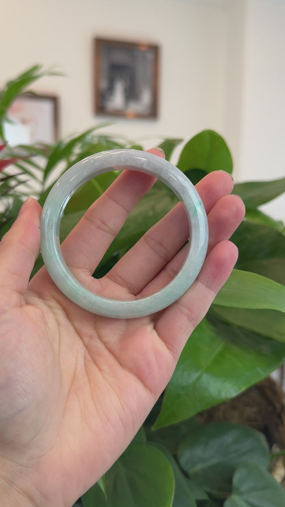 * DETAILS--- Genuine Burmese Jadeite Jade Bangle Bracelet. This bangle is made with genuine Burmese Lavender Green Jadeite jade. With little cloudy spots you can see bright green patches. Overall the bangle is light green and beautiful even color and texture throughout. The Classic half-round style bracelet is comfortable. It's very luxurious and affordable with quality. It's a quality gift for yourself or your love.