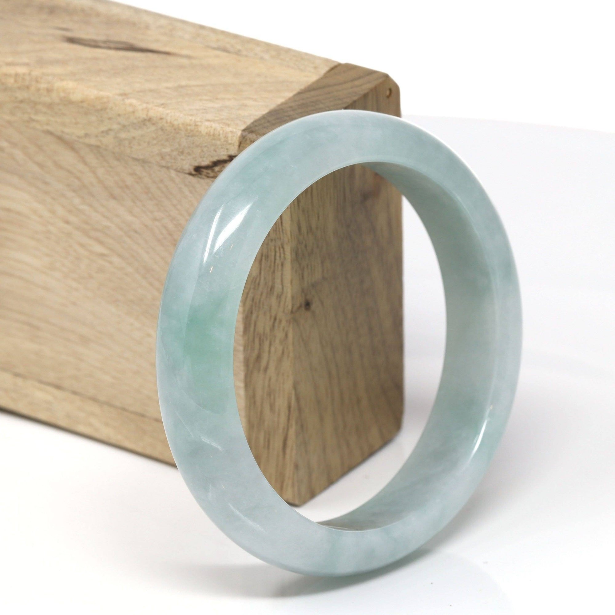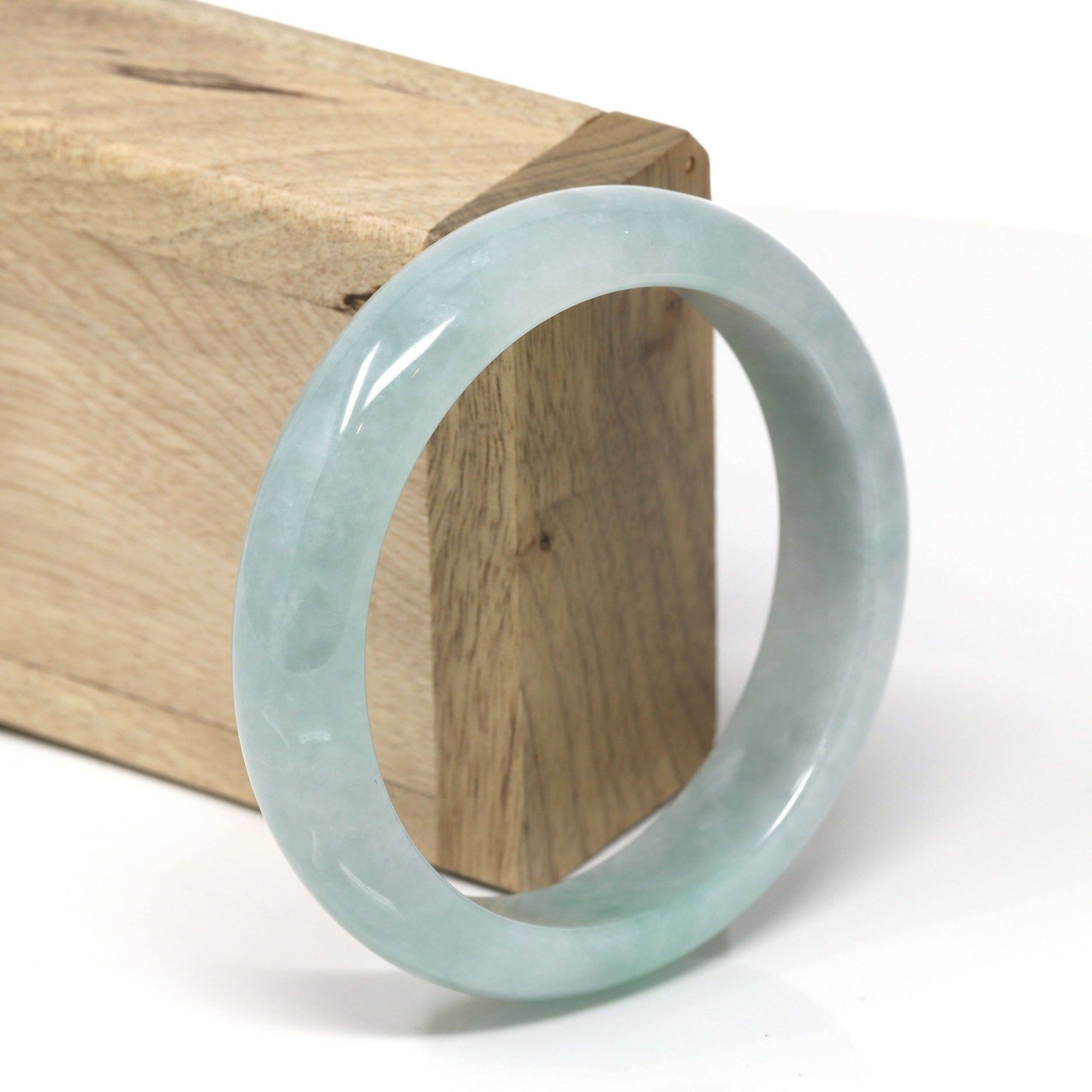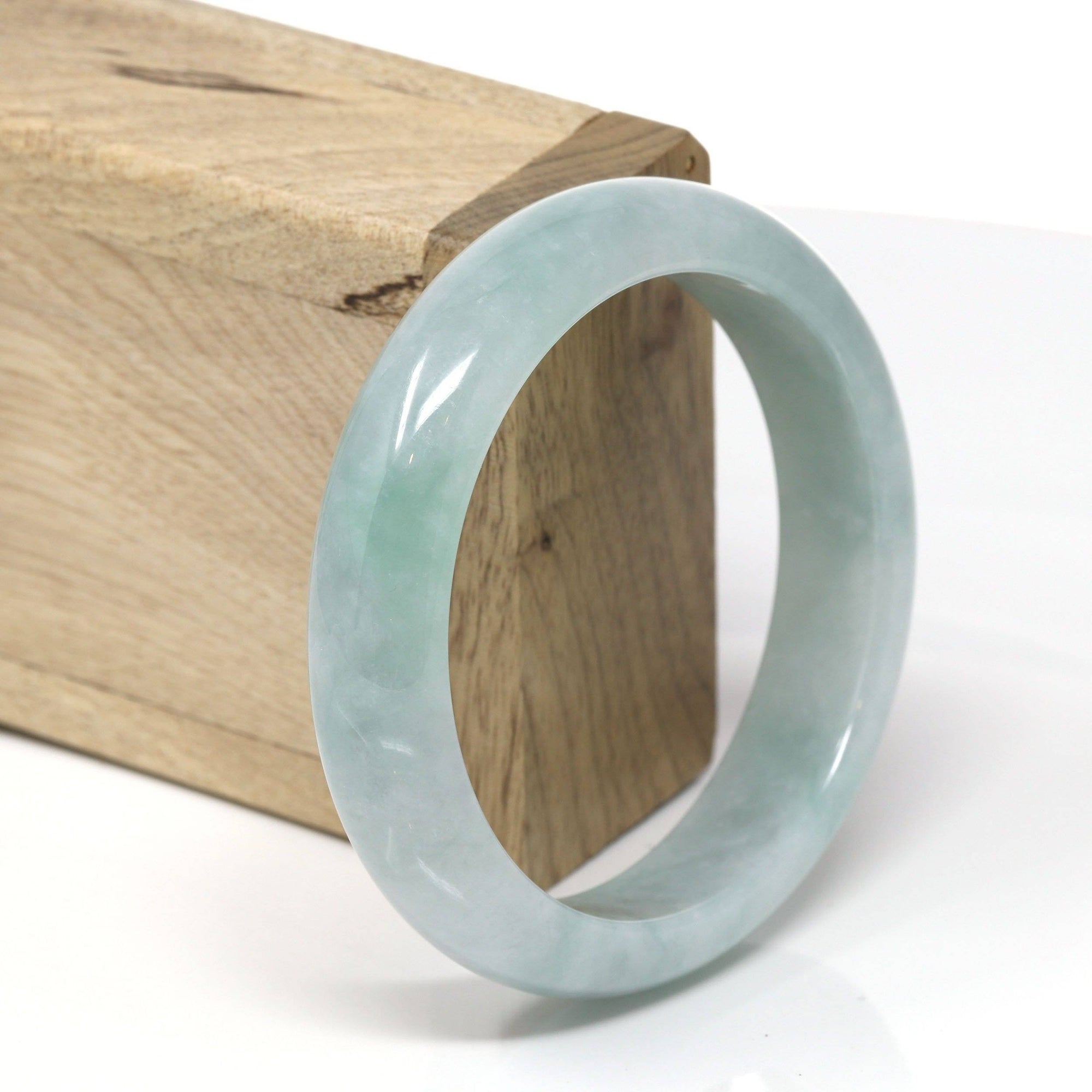* DETAILS--- This natural Burmese Jadeite bangle is a beautiful light blue-green all throughout and beautiful patterns of green as seen in the pictures. The texture is very even throughout the bangle, very beautifully translucent under the light. This bangle is characterized by beautiful blue-green patches. And very minor stone clouds but there are natural stone clouds. the bangle does have a beautiful, simple, luxurious look to it. Very good for daily wear. Jadeite jade is a tough stone, the hardness is 6.5-7 on the Mohs hardness scale. Making jade a perfect stone for a daily wear bangle. It.s a very good gift for you and your love.