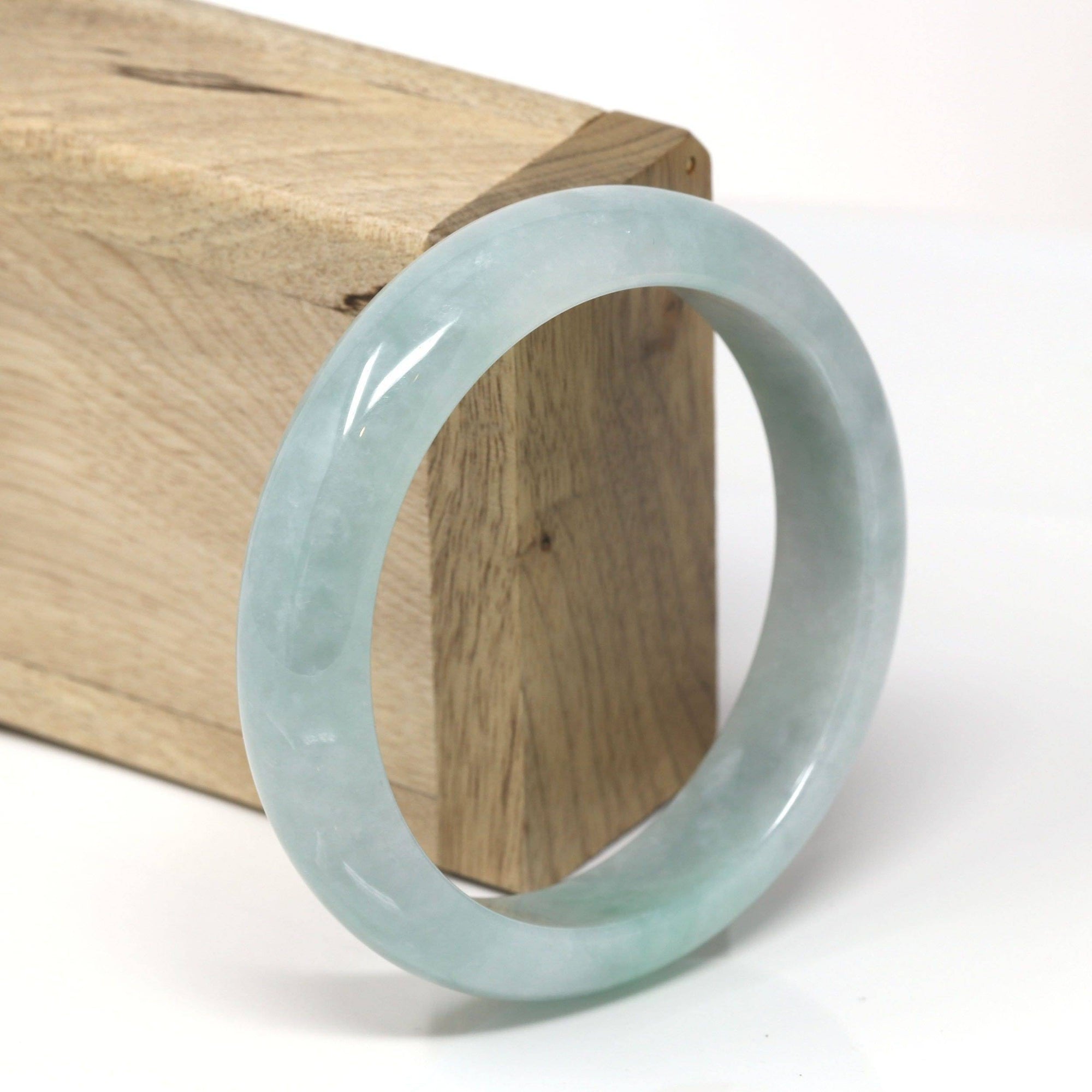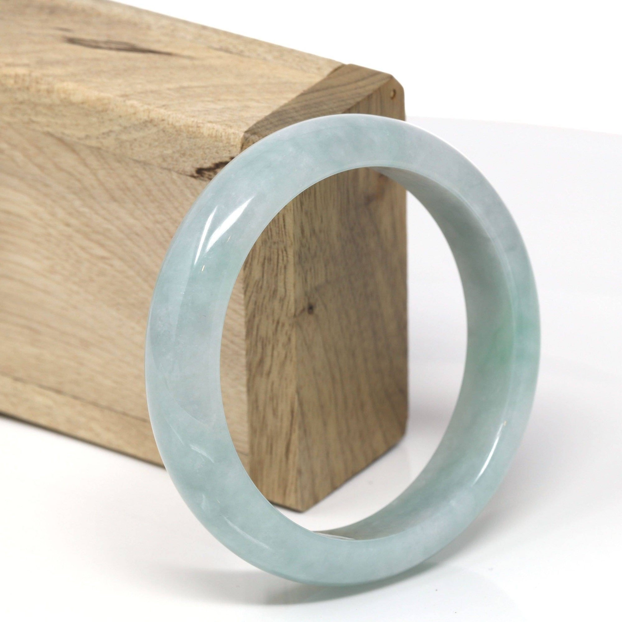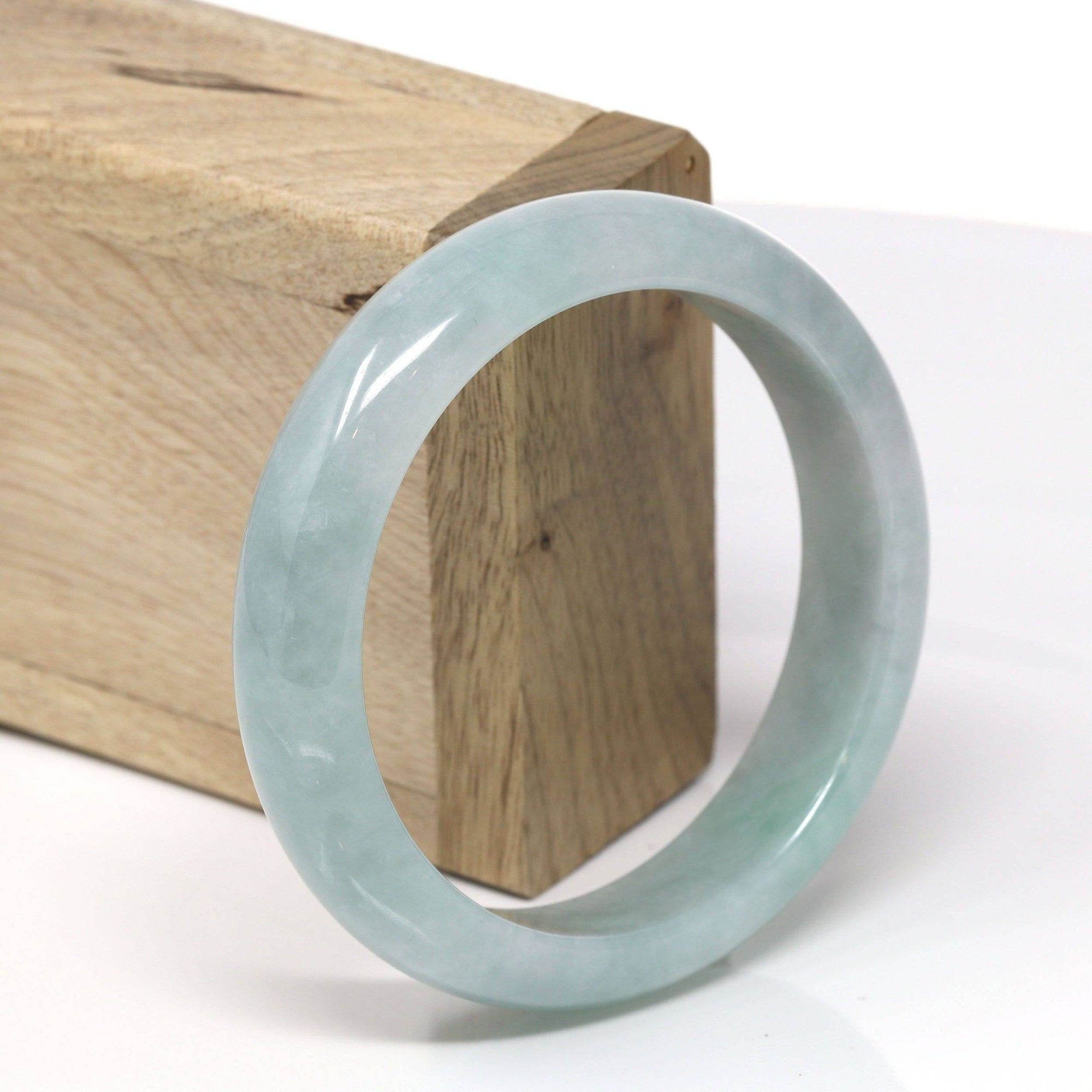 * DETAILS--- This natural Burmese Jadeite bangle is a beautiful light blue-green all throughout and beautiful patterns of green as seen in the pictures. The texture is very even throughout the bangle, very beautifully translucent under the light. This bangle is characterized by beautiful blue-green patches. And very minor stone clouds but there are natural stone clouds. the bangle does have a beautiful, simple, luxurious look to it. Very good for daily wear. Jadeite jade is a tough stone, the hardness is 6.5-7 on the Mohs hardness scale. Making jade a perfect stone for a daily wear bangle. It.s a very good gift for you and your love.