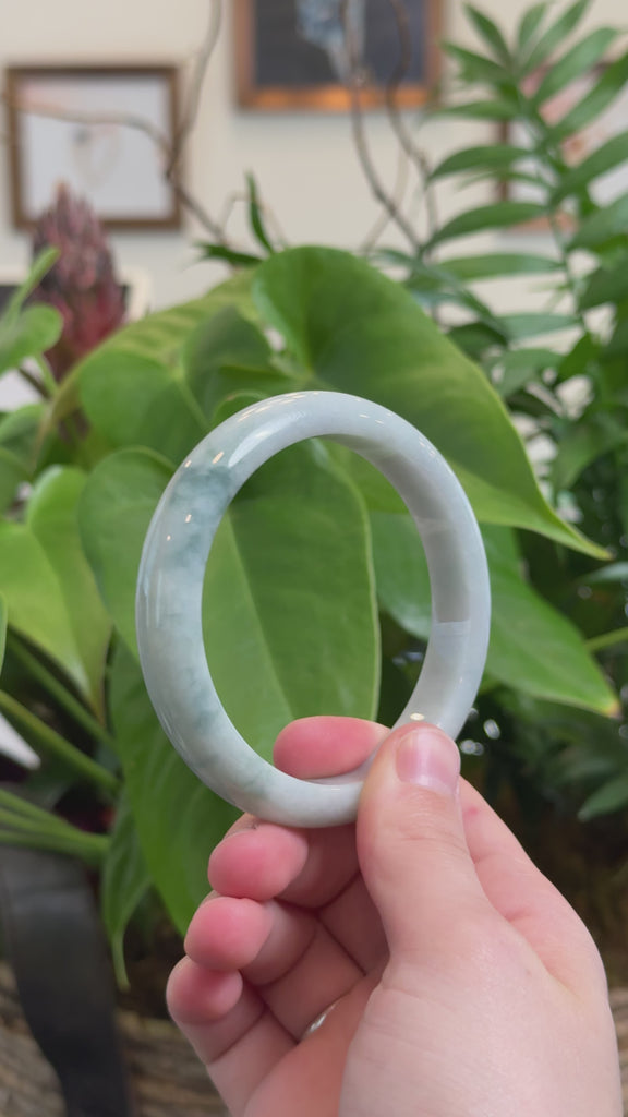 * DETAILS--- This Genuine Burmese Jadeite Jade Bangle Bracelet is crafted from high-quality green Jadeite jade. The fine, translucent texture is highlighted by patches of deeper blue-green hues, creating a unique and mesmerizing look. The stunning shades of blue-green make this bangle truly stand out. Its classic half-round style adds an elegant touch, making it a timeless piece for any collection. It's also a special gift for yourself or a loved one.