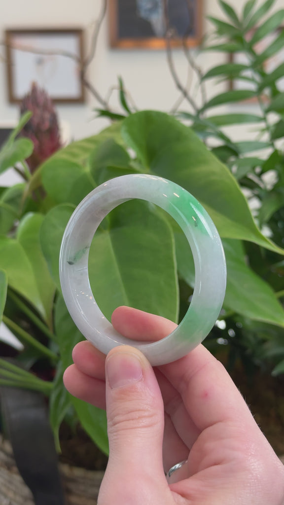 * DETAILS--- This jade bangle is made from high-quality genuine Burmese green Jadeite jade. It has a translucent texture with beautiful green flower patches and lavender colors, creating a stunning look. The classic half-round design is elegant, with hints of cloud-like patterns inside. The bangle features vibrant green patches and multiple colors, making it a unique and special gift for you and someone you love. It’s also a great collectible item.