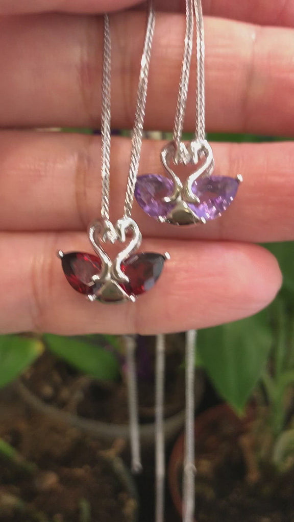 * INTRODUCTION----- Part of Baikalla Jewelry's Genuine Gemstone Jewelry Collection, inspired by classics and the beauty of this gemstone. Baikalla artisans featured natural stone (Available in garnet, or amethyst. Combined with a setting that showcases the stone's full beauty, this is truly a piece for gemstone lovers.  A pair of gemstones swan from Baikalla's gemstone collection, to make a striking statement.
