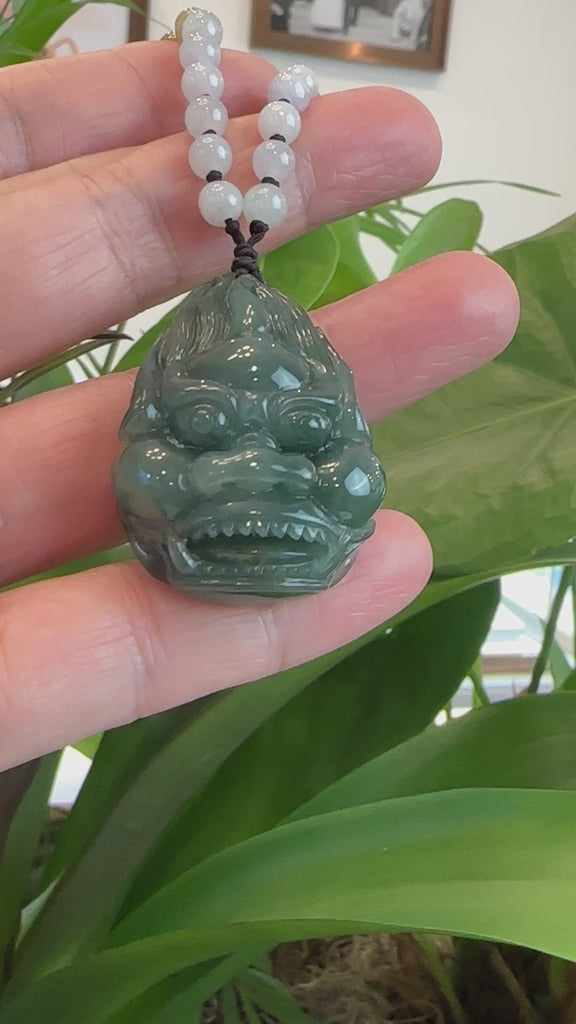 Baikalla™ "Fu Dog" (Guardian Lion) Natural Blue Green Jadeite Jade Necklace Collectibles