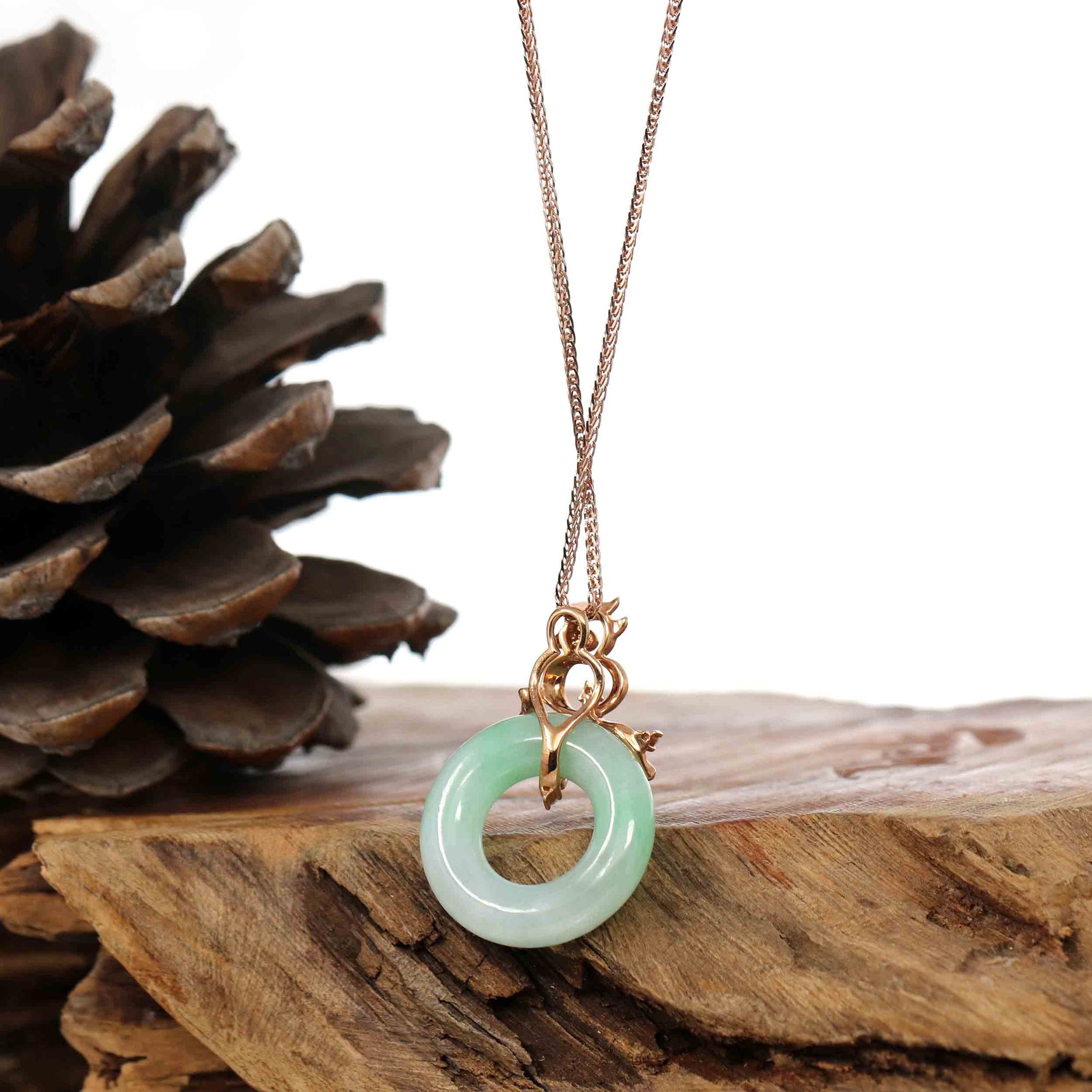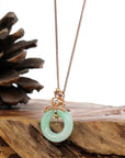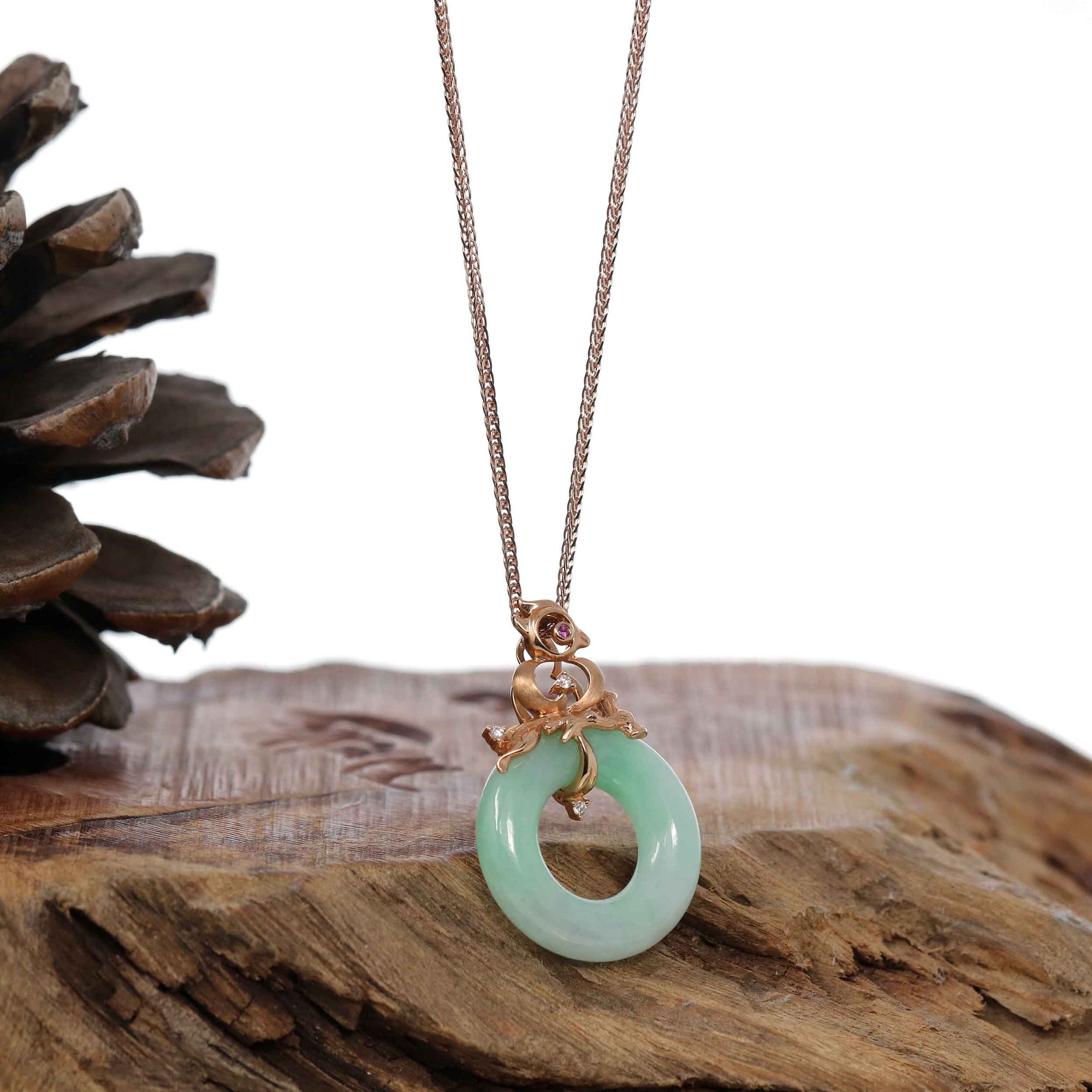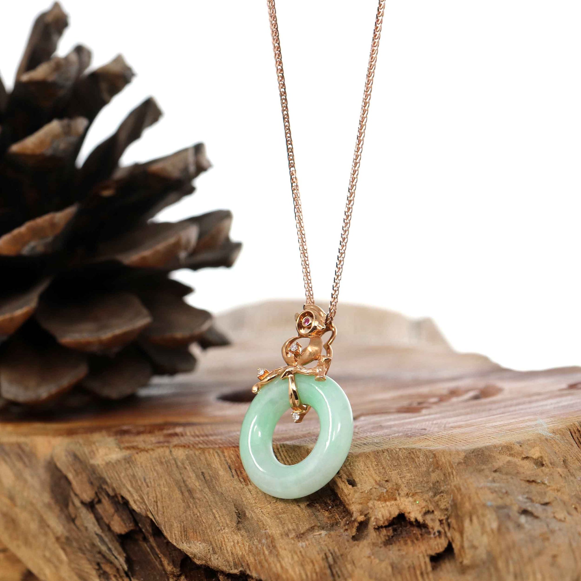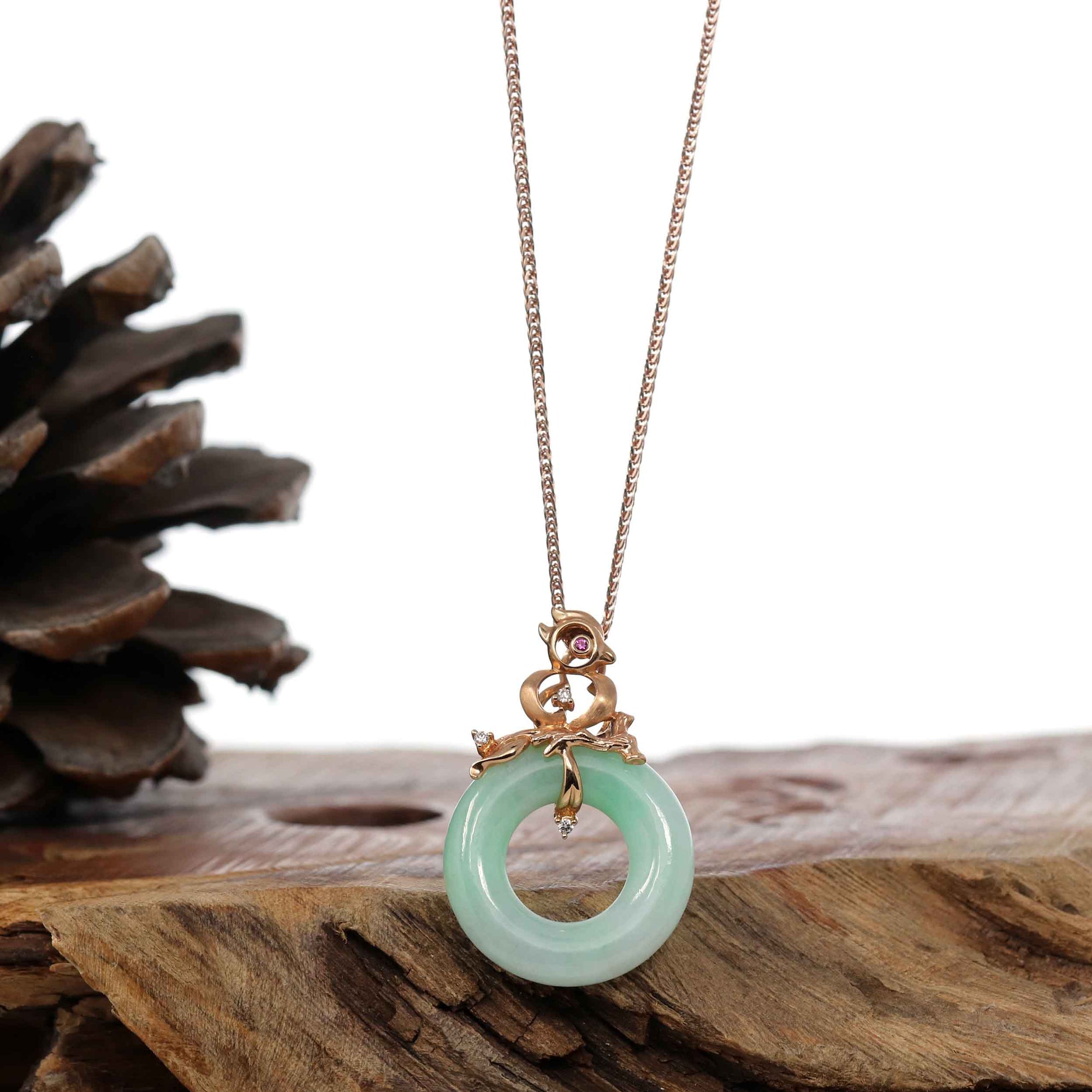 DESIGN CONCEPT--- Introducing the "Good Luck Birdie" 18k Rose Gold Genuine Burmese Jadeite Lucky Kou Kou Pendant Necklace with AA Tourmaline and Diamond. Its presence represents positive energy and the promise of better days ahead, making it a perfect choice for those seeking good luck in their lives. The jadeite gem is carefully shaped and polished to reveal its natural beauty, while accent gemstones add a touch of brilliance to the overall elegance. Whether you're looking for a personal talisman or a thoughtful gift for someone special, this necklace is a beautiful embodiment of luck, positivity, and safety. Enhance your style and invite good fortune into your life with this extraordinary masterpiece today.