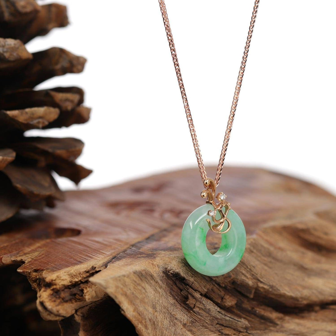 Baikalla™ "Good Luck Birdie" 18k Rose Gold Genuine Burmese Jadeite Lucky Kou Kou Pendant Necklace With Diamond