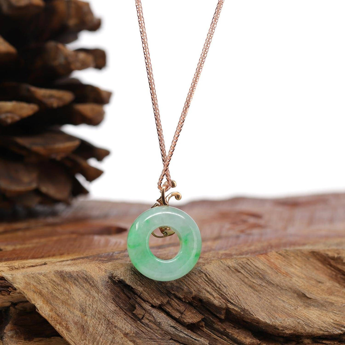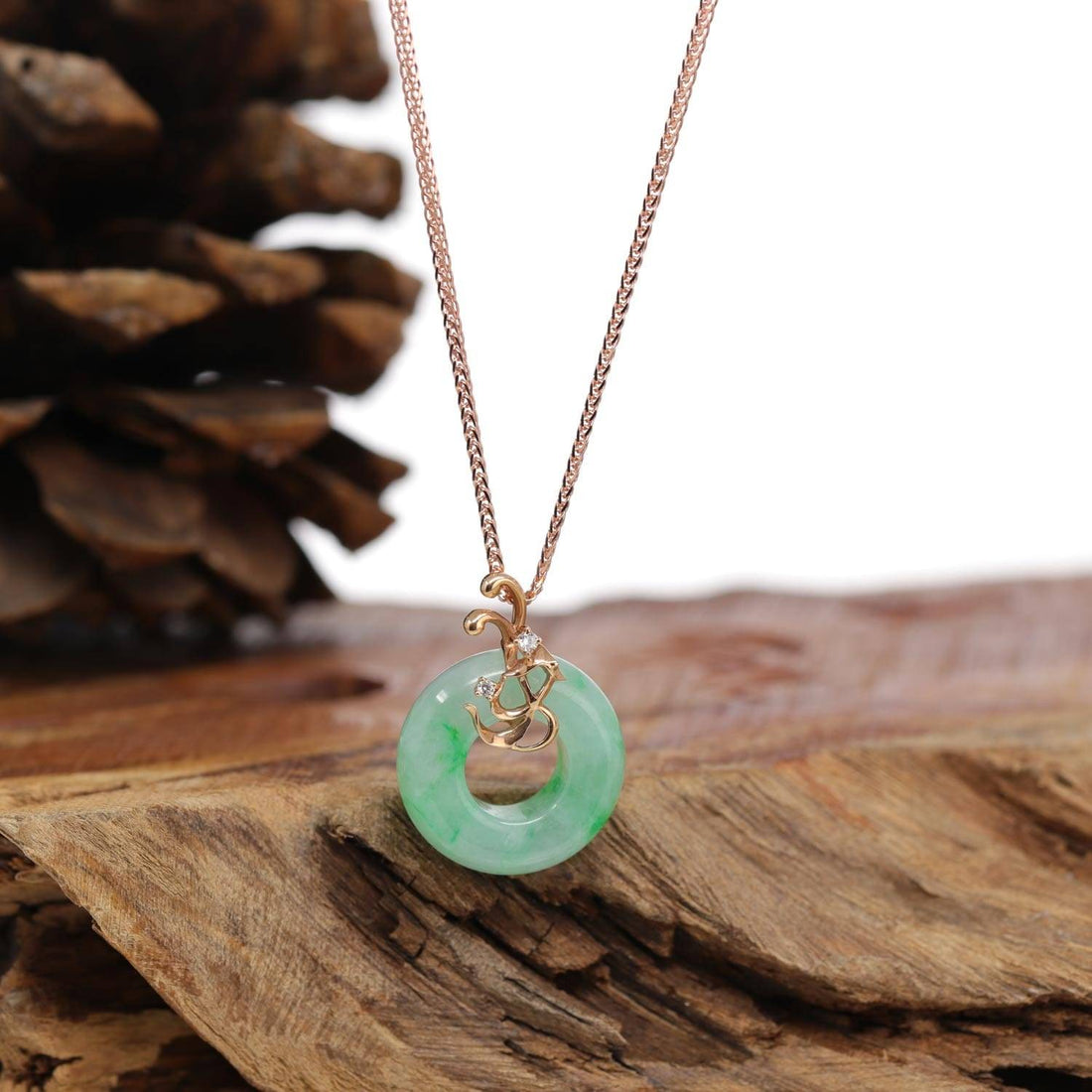 * DESIGN CONCEPT--- Introducing the "Good Luck Birdie" 18k Rose Gold Genuine Burmese Jadeite Lucky Kou Kou Pendant Necklace with Diamond. Its presence represents positive energy and the promise of better days ahead, making it a perfect choice for those seeking good luck in their lives. The jadeite gem is carefully shaped and polished to reveal its natural beauty, while accent diamonds add a touch of brilliance to the overall elegance. Whether you're looking for a personal talisman or a thoughtful gift for someone special, this necklace is a beautiful embodiment of luck, positivity, and safety. Enhance your style and invite good fortune into your life with this extraordinary masterpiece today.