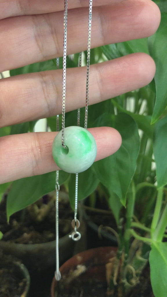 Design Concept--- The simple shape of a circle represents things such as happiness, wholeness, and prosperity. Or also known as the "Circle of Heaven". This necklace is made with very high-quality genuine light green Burmese jadeite jade. Which produces some of the finest in the world. Refined, exquisite. Very very slightly included. Gifting one of these is like wishing the best luck upon your family or loved ones. It's a perfect gift.