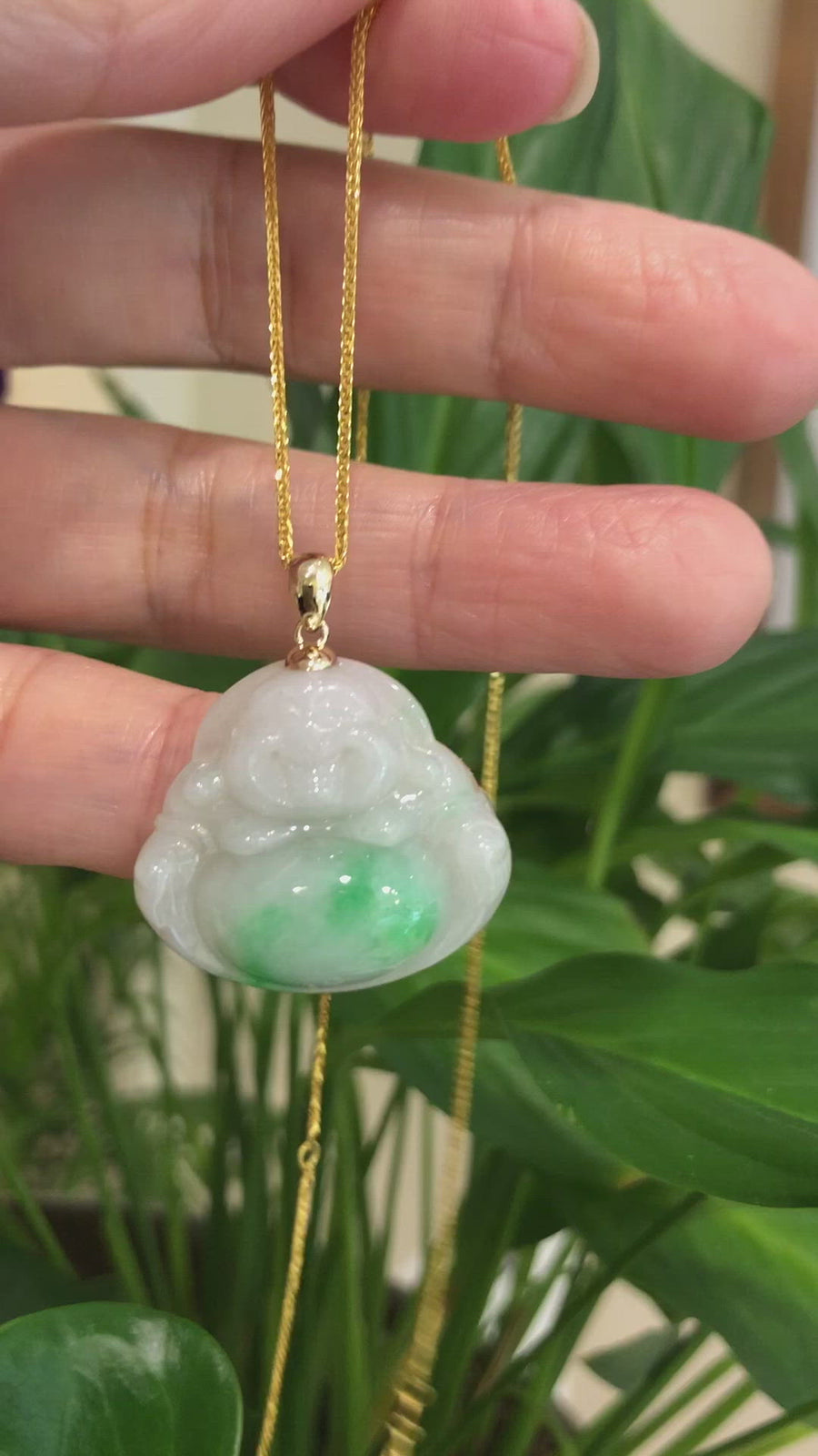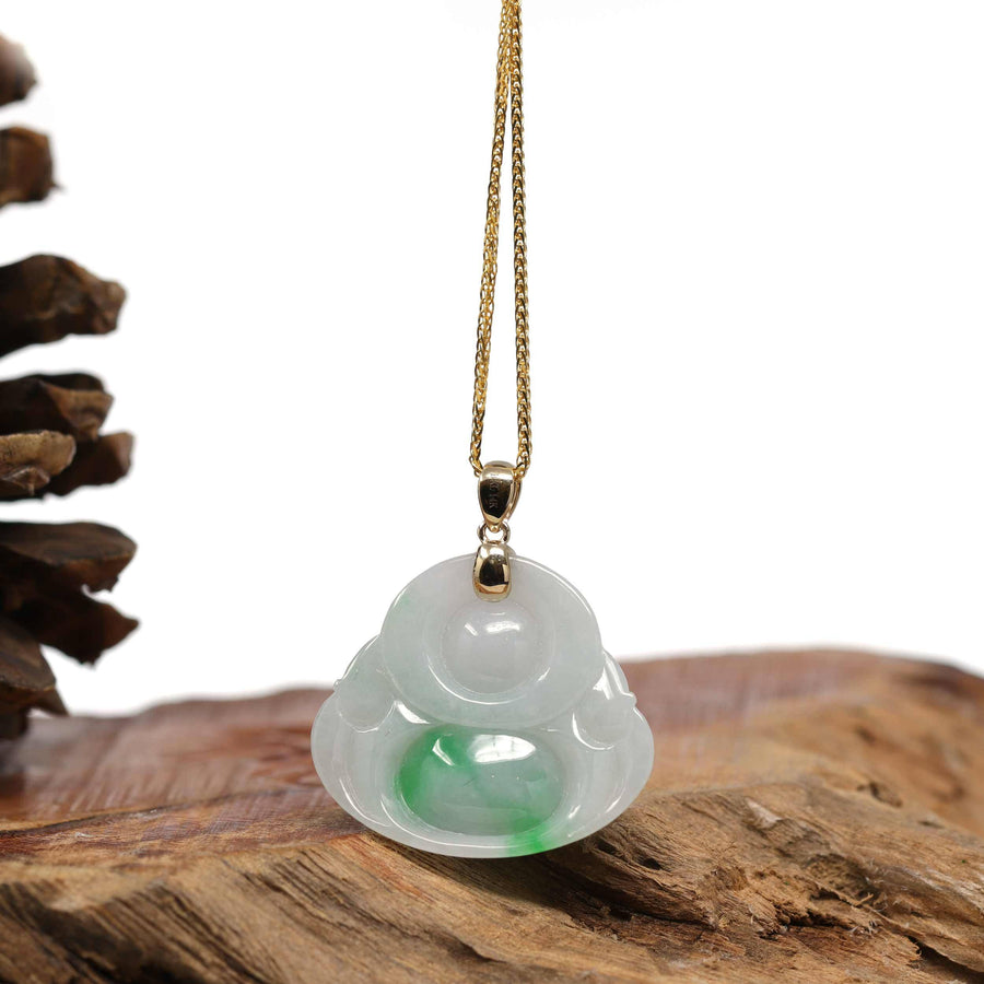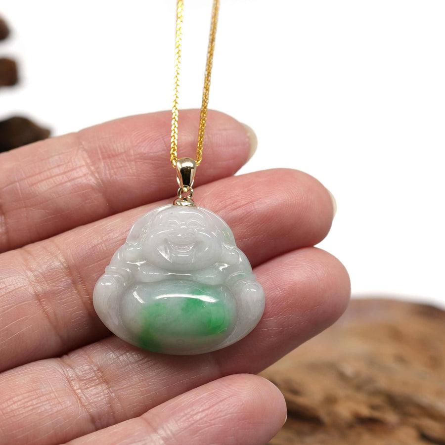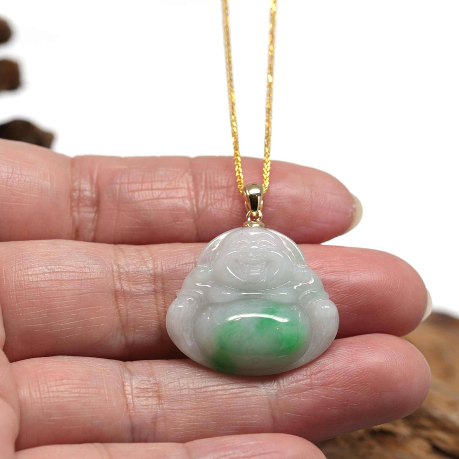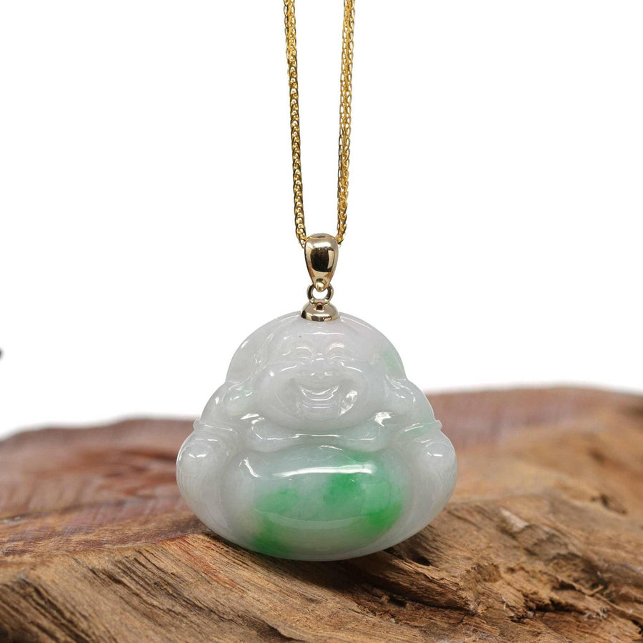 Baikalla™ "Laughing Buddha" Genuine Green Jadeite Buddha Pendant Necklace With 14k Yellow Gold Bail