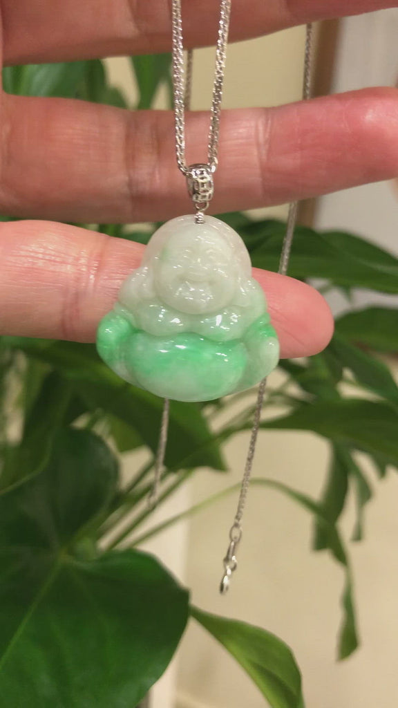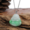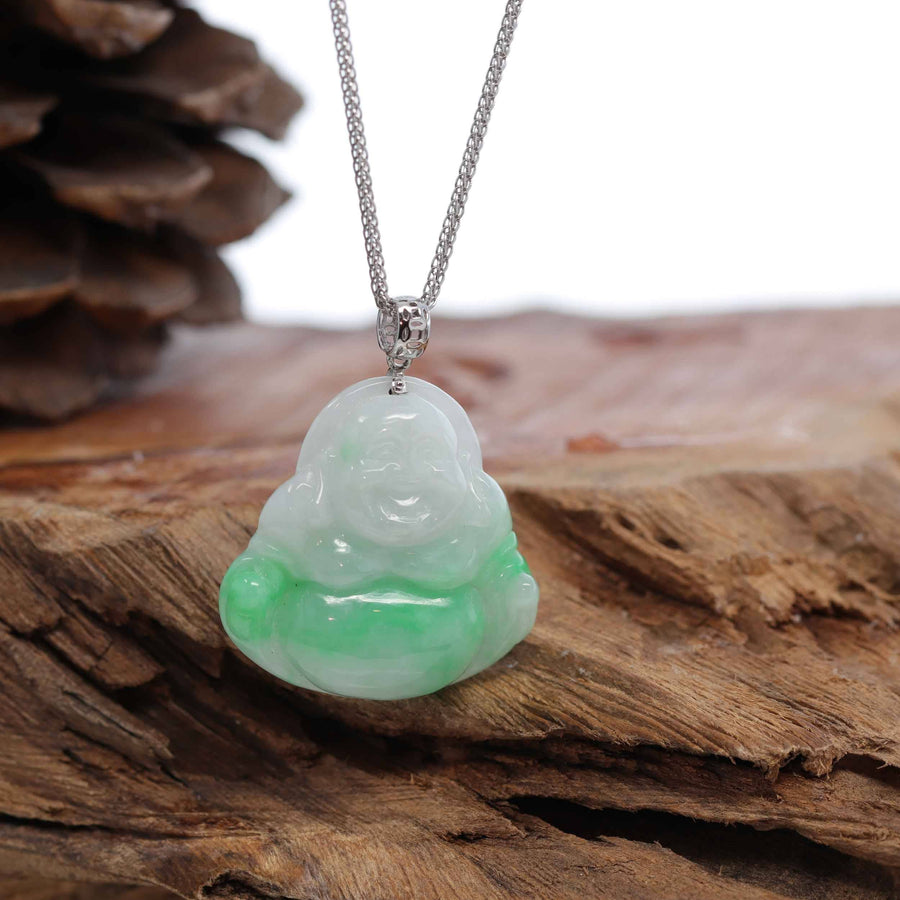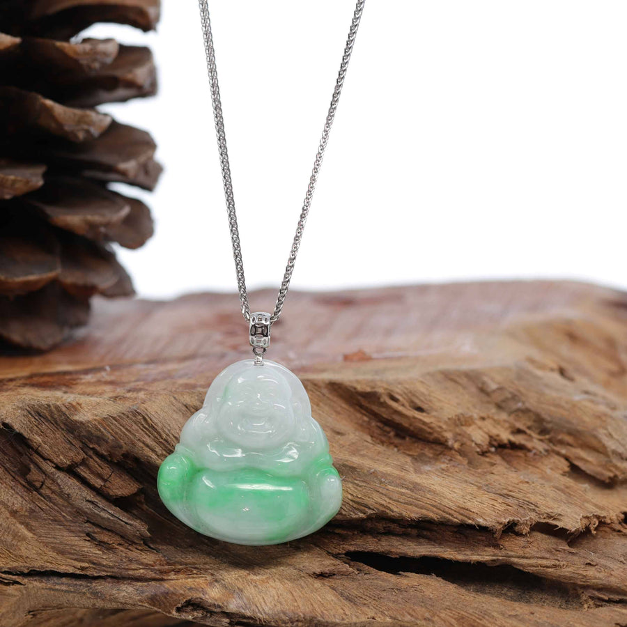 Baikalla™ "Laughing Buddha" Genuine Vibrant Green Jadeite Buddha Pendant Necklace With 14k White Gold Bail