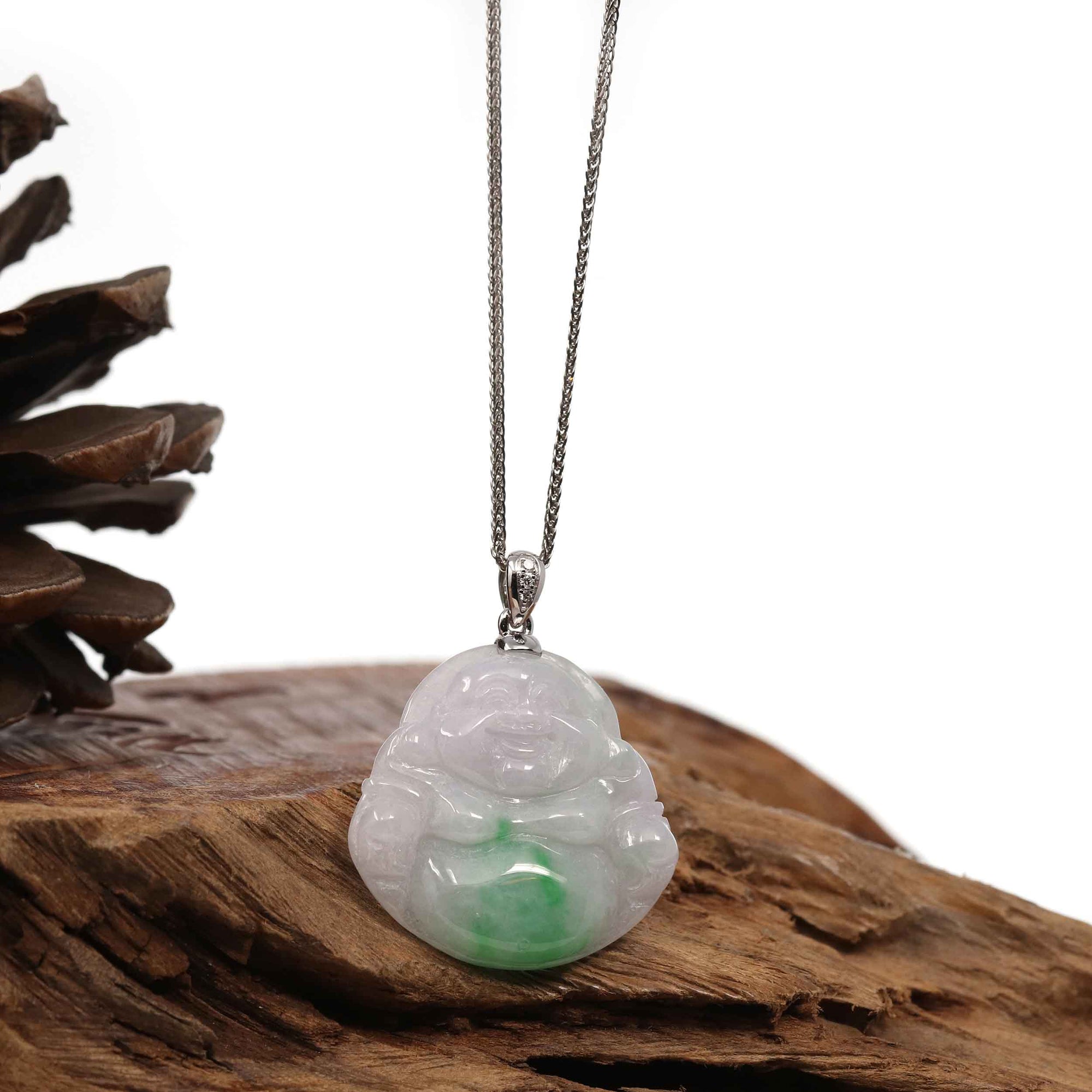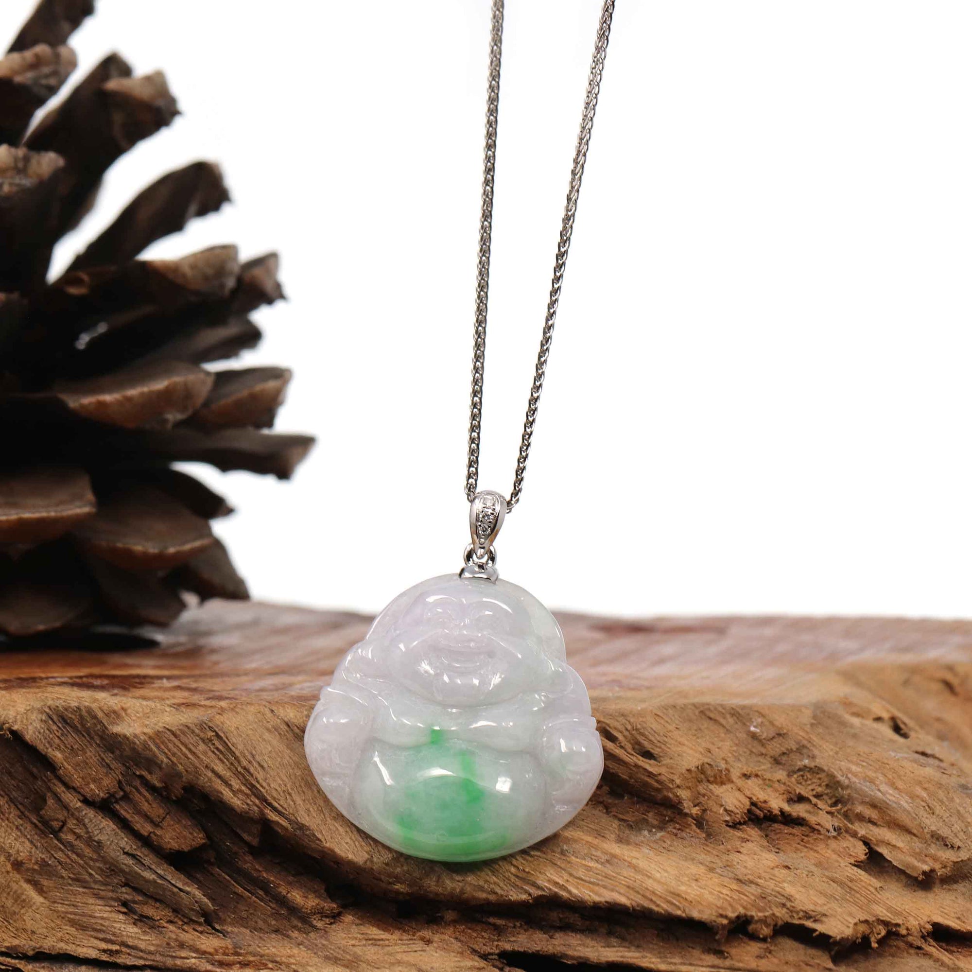Baikalla™ "Laughing Buddha" Genuine Vibrant Green Jadeite Buddha Pendant Necklace With 14k White Gold Diamond Bail