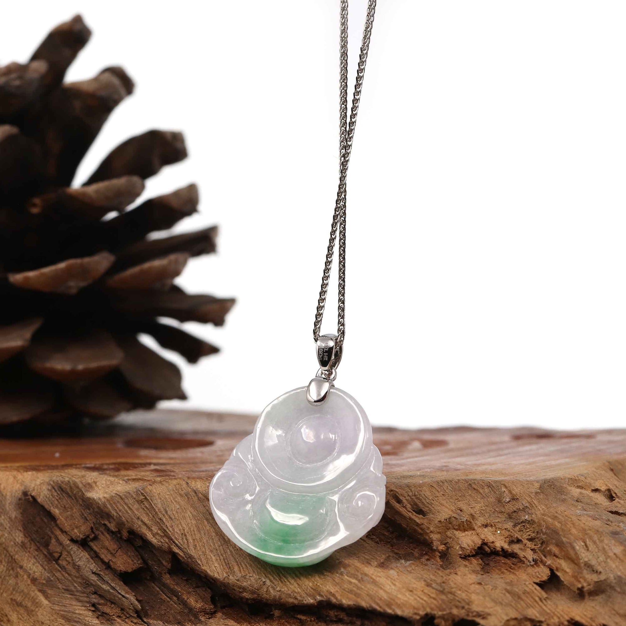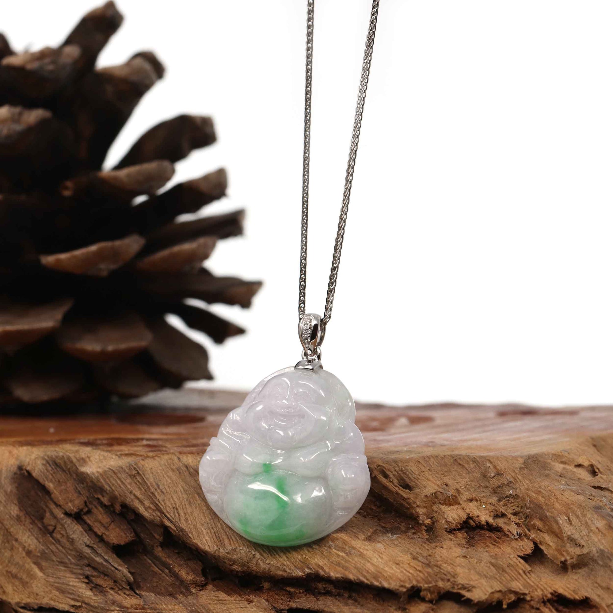 * Detail--- One-of-a-kind jadeite Buddha necklace, inspired by the figure of the traditional Buddha body. Combined with a modern bail. The piece is more than perfect for daily wear. Wearing items bearing the image of Buddha can remind us to be like Buddha in our daily life. Such items may also encourage us to be more patient in approach, kind in nature, and cultivate thoughts of peace and non-violence. Made with 100% genuine jadeite jade, untreated. Jadeite represents good luck, prosperity, and wealth. Handcrafted, with a lot of attention to detail.