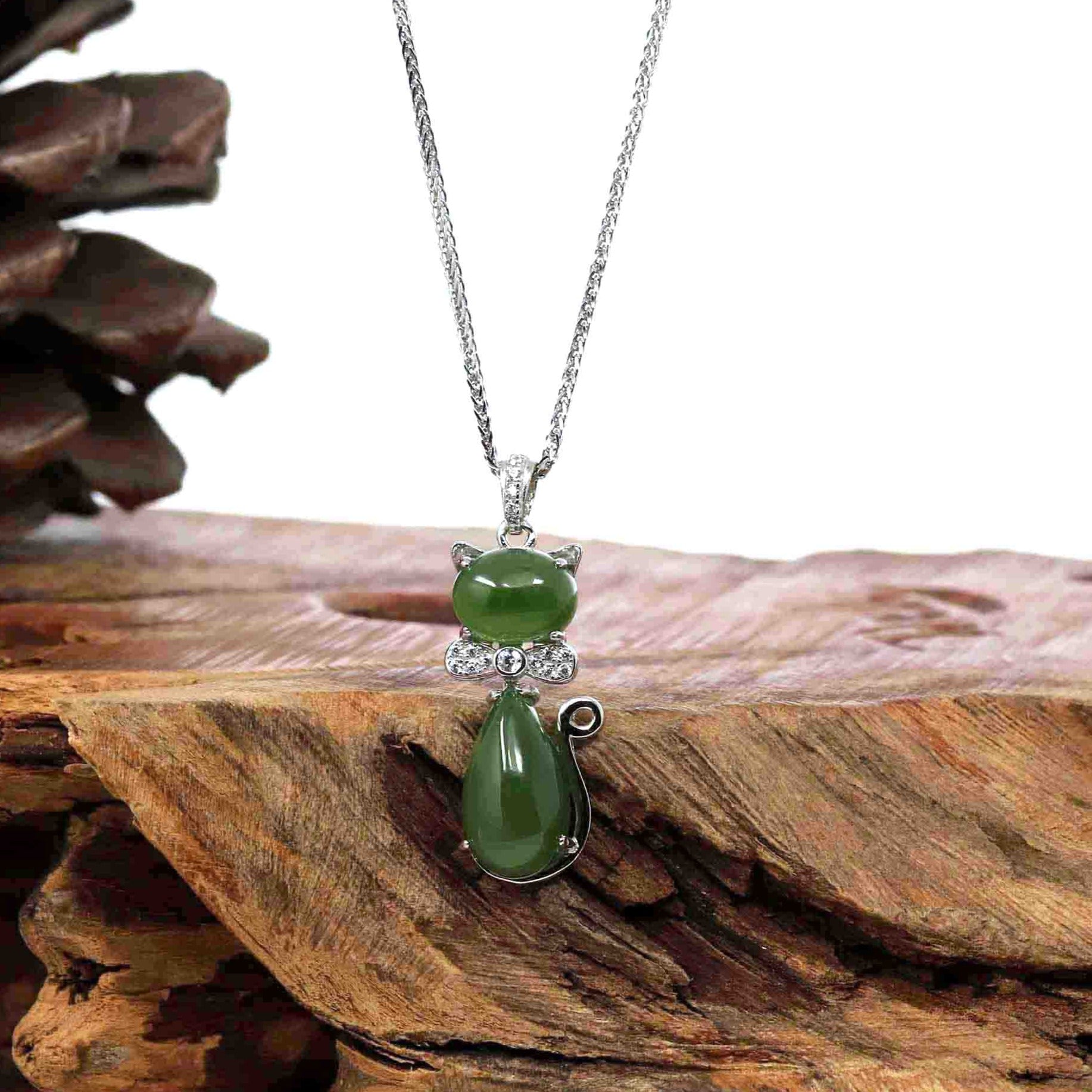Design concept--- Genuine Nephrite Green Jade Lucky Cat Pendant Necklace. This pendant is made with high-quality genuine nephrite green jade & CZ. It looks so exquisite. The jade looks so clean and smooth. The cat looks so lovely with a green jade head and body. The sterling silver tail looks like a moving lifelike. It's so cute. It's a perfect gift for your love.