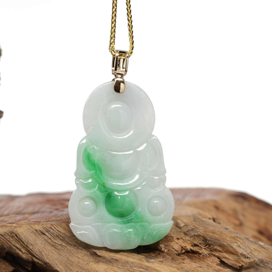 *Design concept--- Made with genuine Burmese jadeite jade. The excellent craftsmanship portrays the "goddess of compassion", the Guan Yin. The handcraft is stunning. Made with 14K yellow gold bail. This particular necklace has amazing color, with a very special vibrant green color. Great size for both men and women.