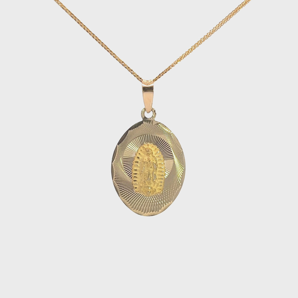 * INTRODUCTION--- Introducing the Baikalla 14k Yellow Gold Diamond Cut Lady Of Guadalupe Pendant Necklace, a timeless homage to the Virgin Mary. Created with attention to detail, this pendant displays a fusion of timeless and religious significants. Diamond cut texture and 14k gold enhance the sacred symbolism with its warm golden hue. Embrace the divine radiance with this finely crafted 14k Yellow Gold Diamond Cut Lady Of Guadalupe Pendant Necklace.