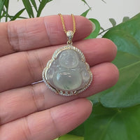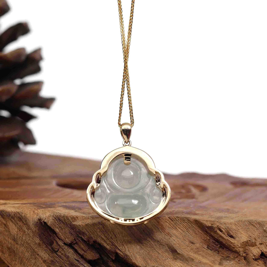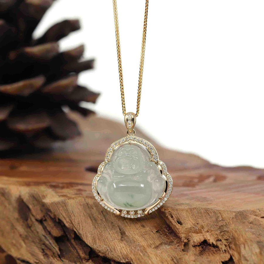Baikalla 14K Yellow Gold Genuine Burmese Ice Jadeite Jade Buddha Pendant with VS1 Diamonds High Jewelry