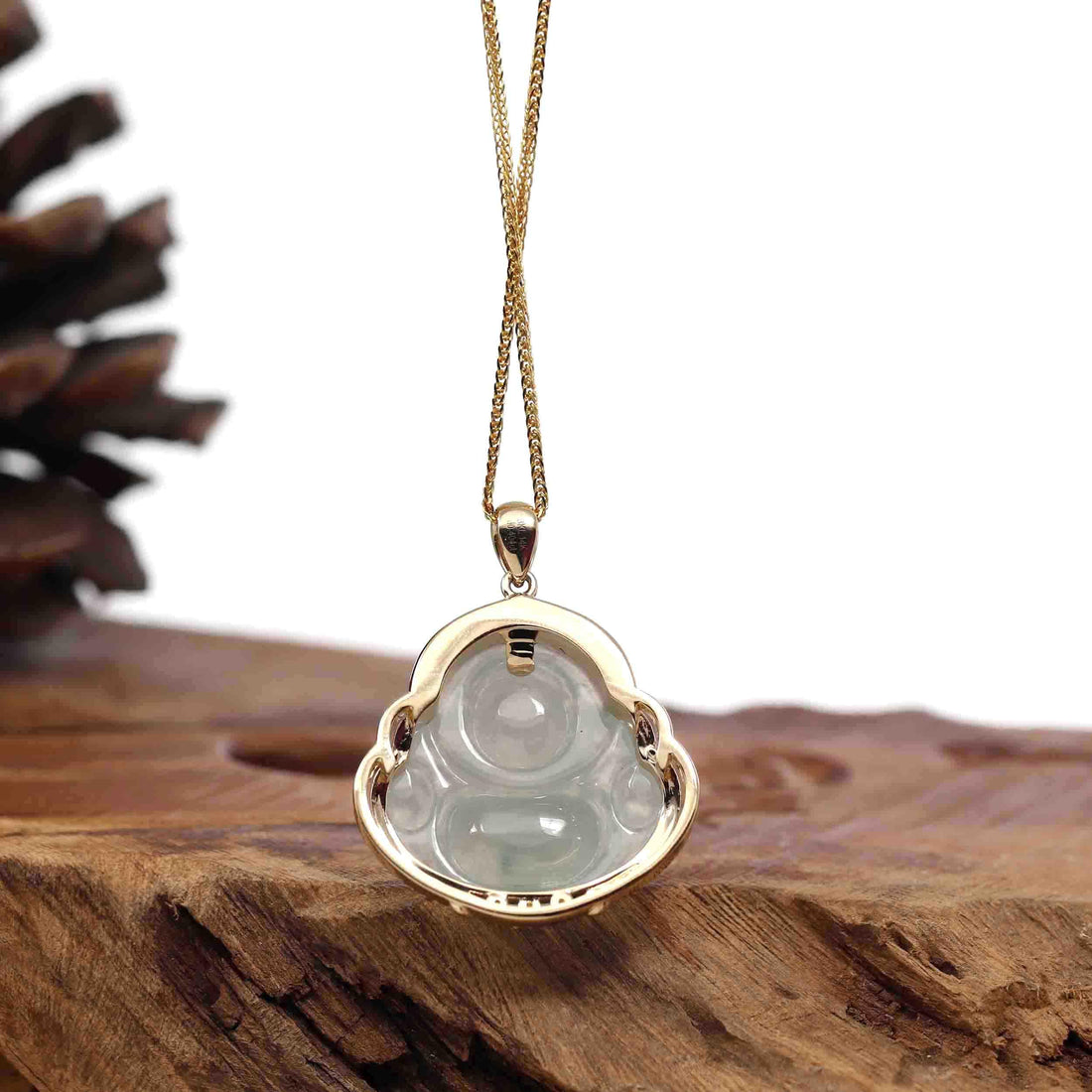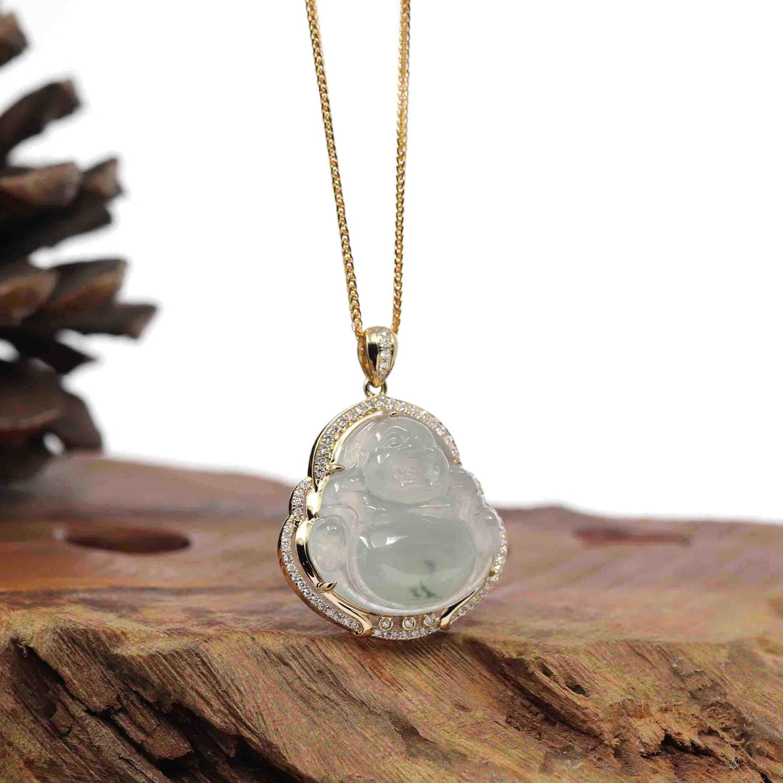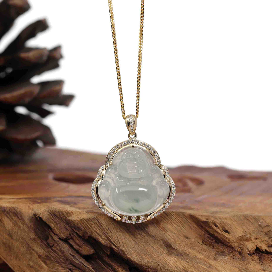 Baikalla Jewelry 18k Gold Jadeite Necklace Baikalla 14K Yellow Gold Genuine Burmese Ice Jadeite Jade Buddha Pendant with VS1 Diamonds High Jewelry