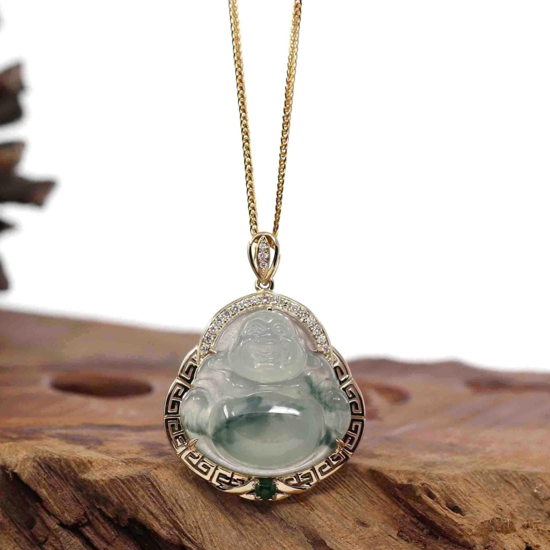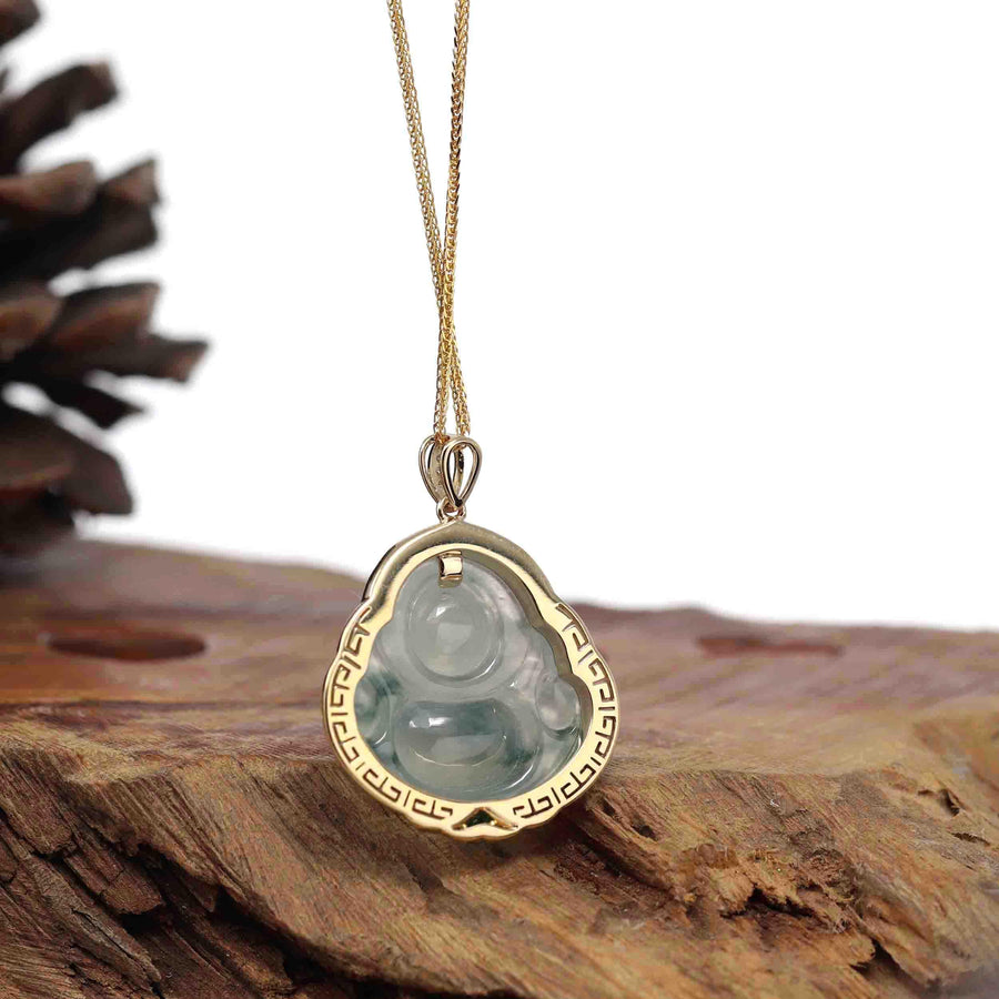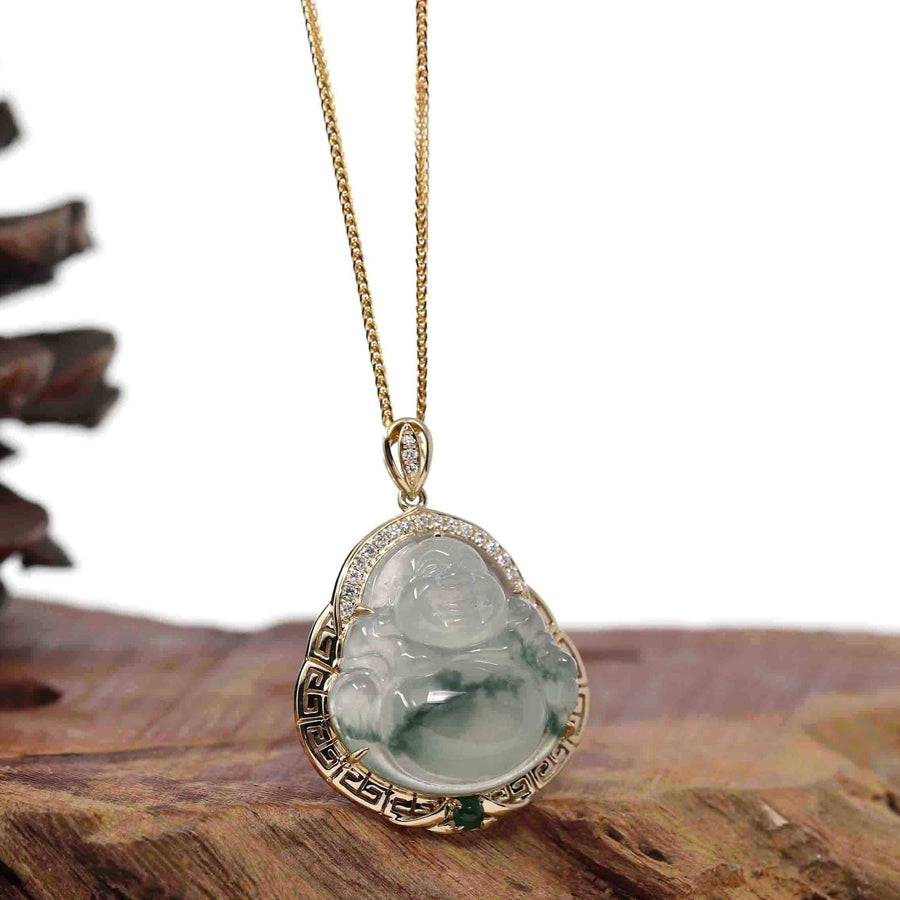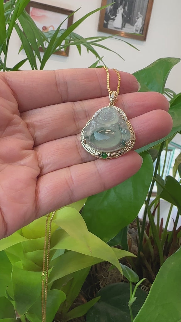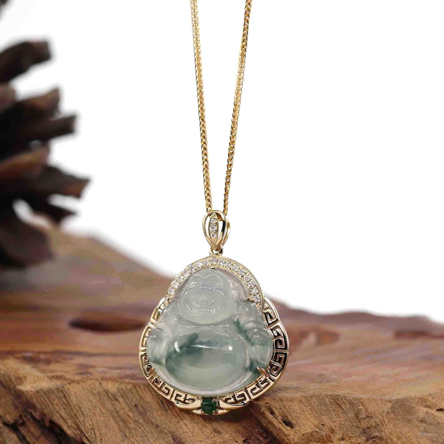 Baikalla 14K Yellow Gold Genuine Burmese Ice Jadeite Jade Buddha Pendant with VS1 Diamonds High Jewelry