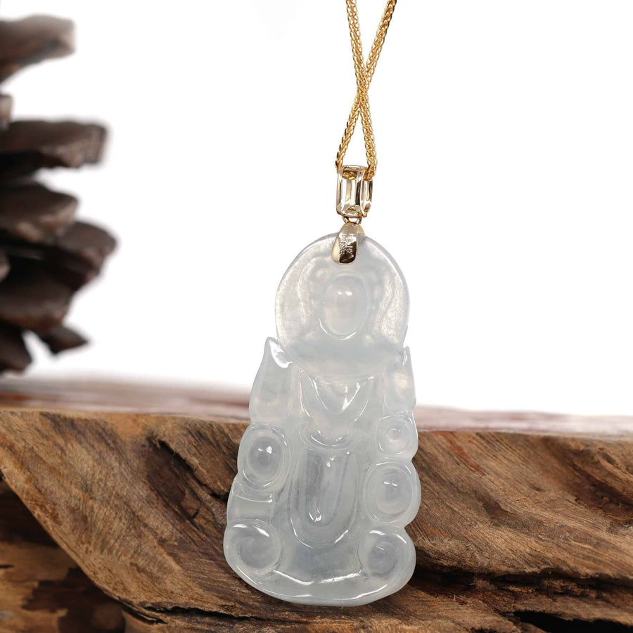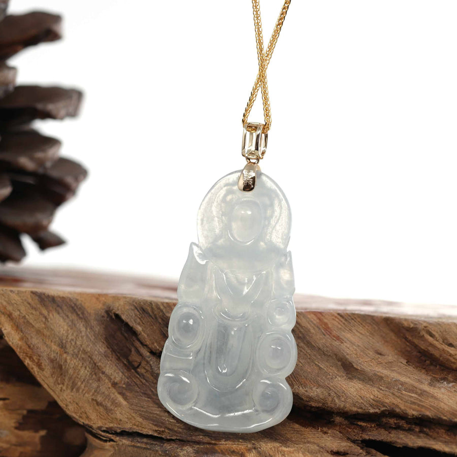 *Design concept--- Made with genuine Burmese ice jadeite jade. The excellent craftsmanship portrays the "goddess of compassion", the Guan Yin. The handcraft is stunning. This particular necklace has amazing translucency, with a very special icy color matrix. Great size for both men and women.