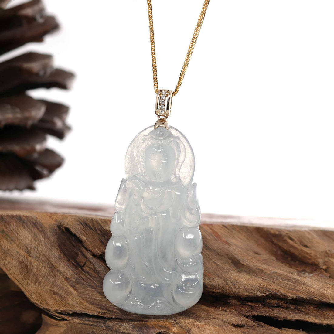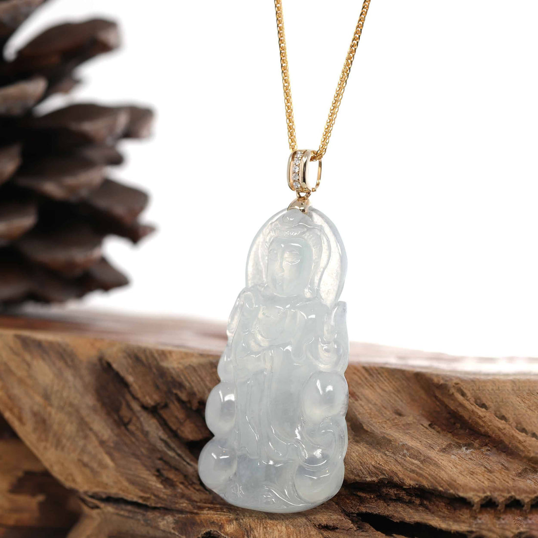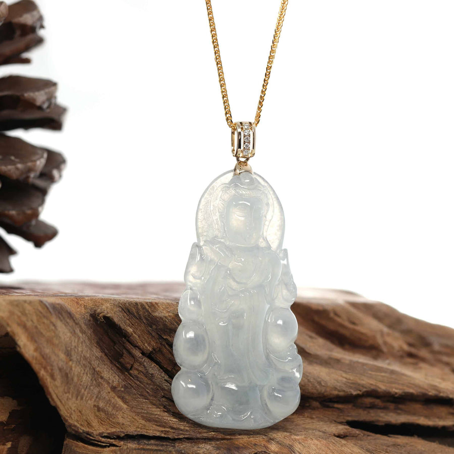 Baikalla 14k White Gold "Goddess of Compassion" Genuine Ice Burmese Jadeite Jade Guanyin Necklace With Gold VS1 Diamond Bail