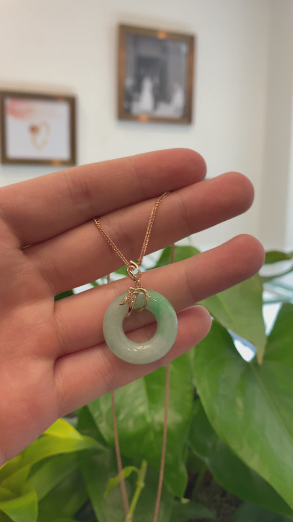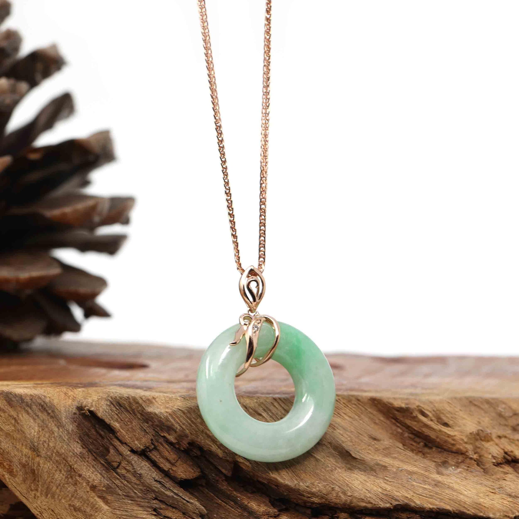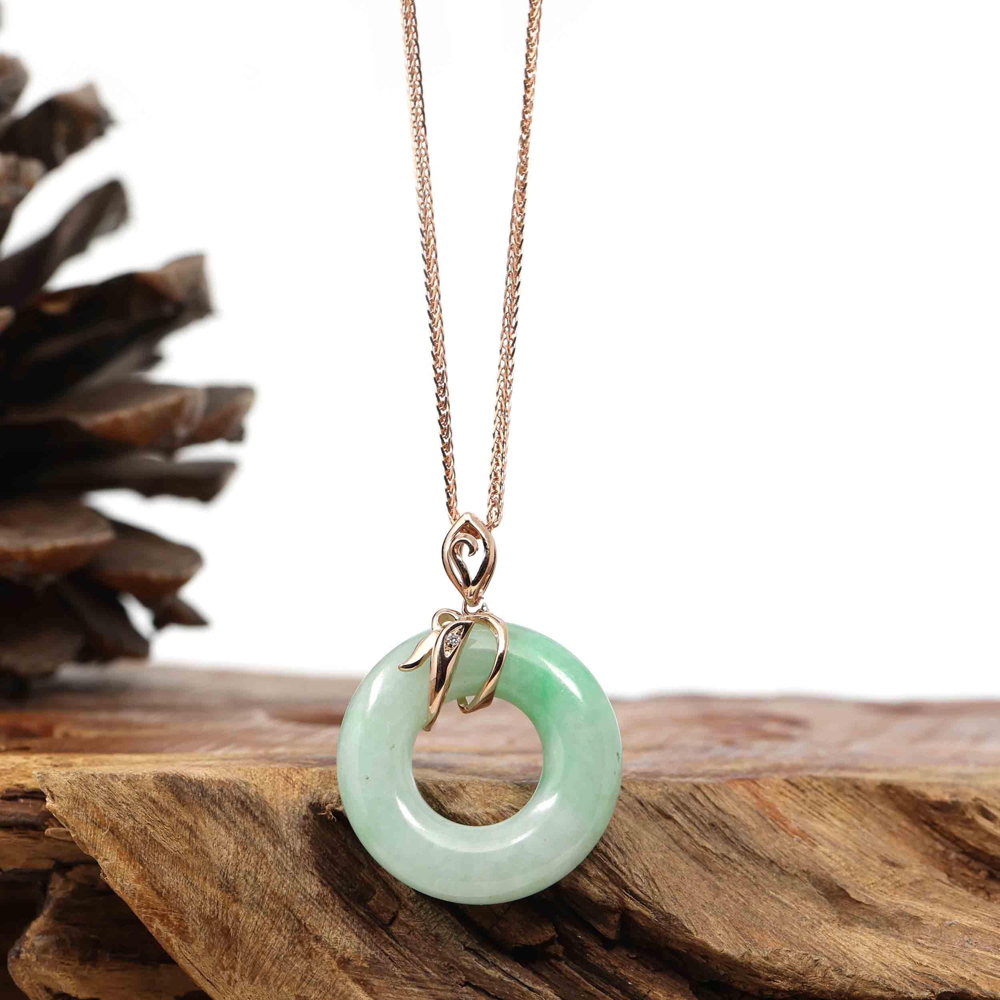 * DESIGN CONCEPT--- 18k Rose Gold & Genuine Burmese Jadeite Pendant Necklace With AA Ruby. This pendant is made with high-quality genuine jadeite with some green, The jadeite piece looks so clean and smooth without any clouds or cracks or any dirty spots. The jadeite pendant's style is a good freedom bird standing on the lucky "Circle Of Heaven". It means prosperity, good luck, and safety. The pendant looks so lovely and exquisite. It's a perfect gift for yourself and your love.