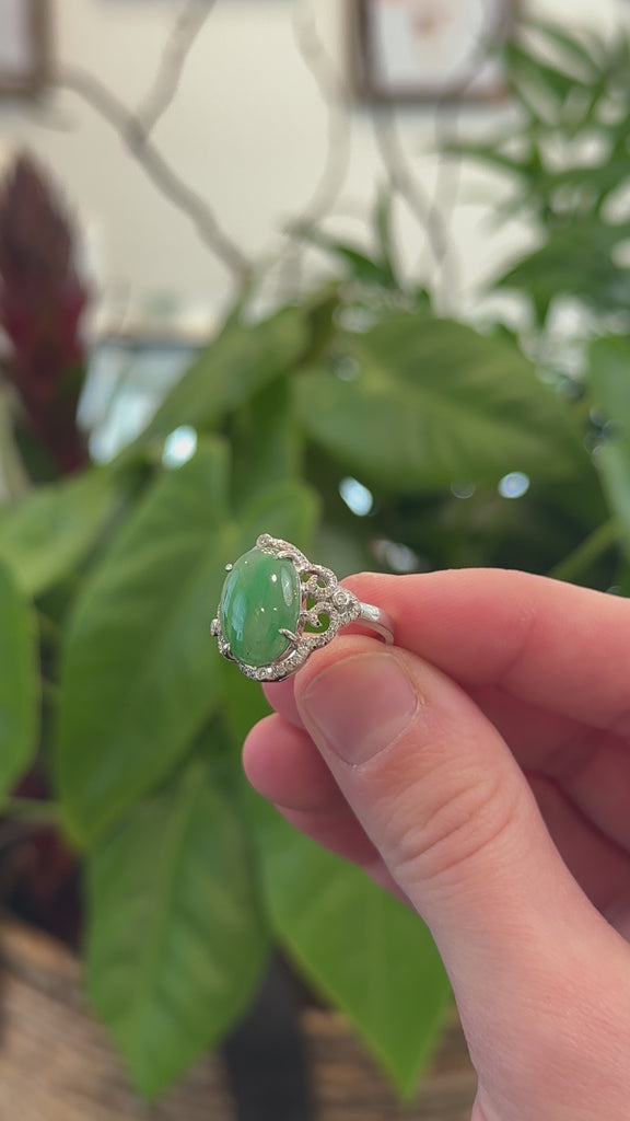 Baikalla 18k White Gold Natural Rich Green Oval Jadeite Jade Ring w/ Natural Diamonds