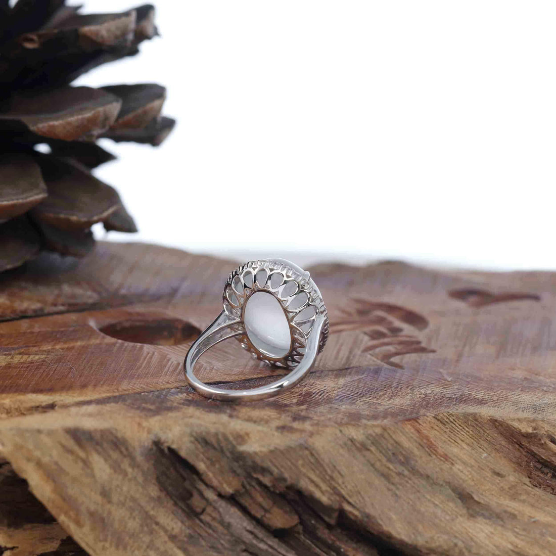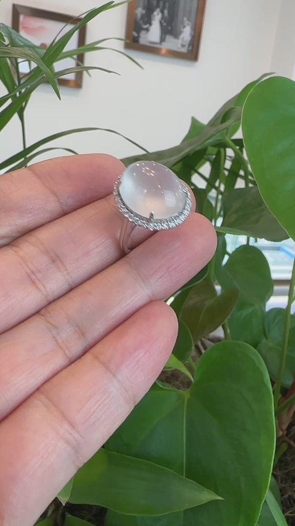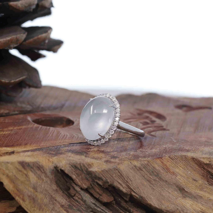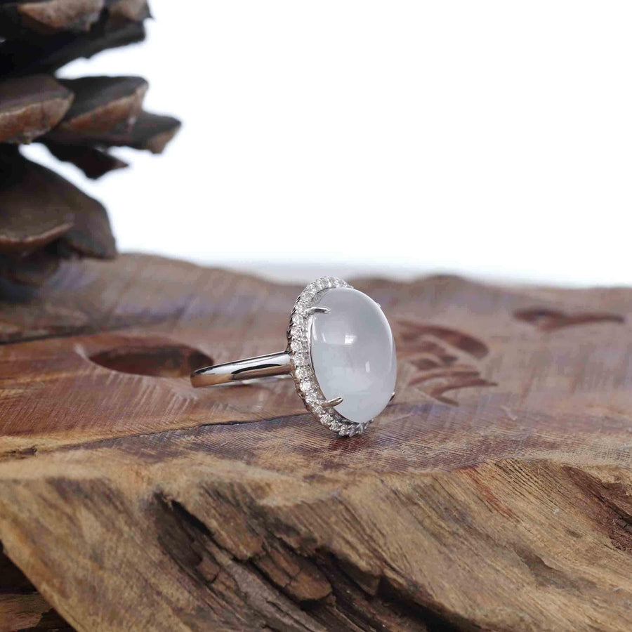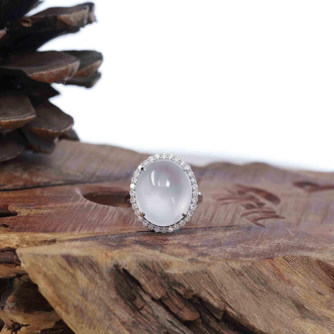 This ring features a oval natural ice Jadeite. The ice jadeite has been very valuable, sometimes as much as the imperial jadeite. The essence of this oval ice jadeite is unleashed by the strikingly brilliant diamonds and the simplistic yet intricate setting design that keeps the originality of the main stone. Color is photographed exactly to the actual stone, it's free of any inclusions that are visible to the naked eye.