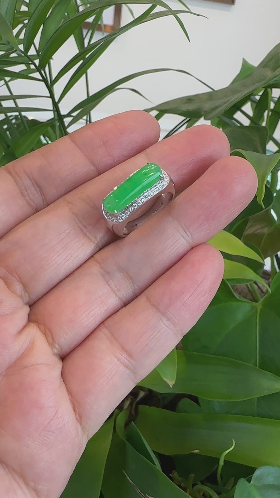 * ORIGINAL DESIGN --- Inspired by the natural beauty of the genuine Burmese high end Imperial green Jadeite. The ring is in the style of a rectangular signet ring. Exquisite yet simple designs add details to admire and uniqueness to your everyday memento.